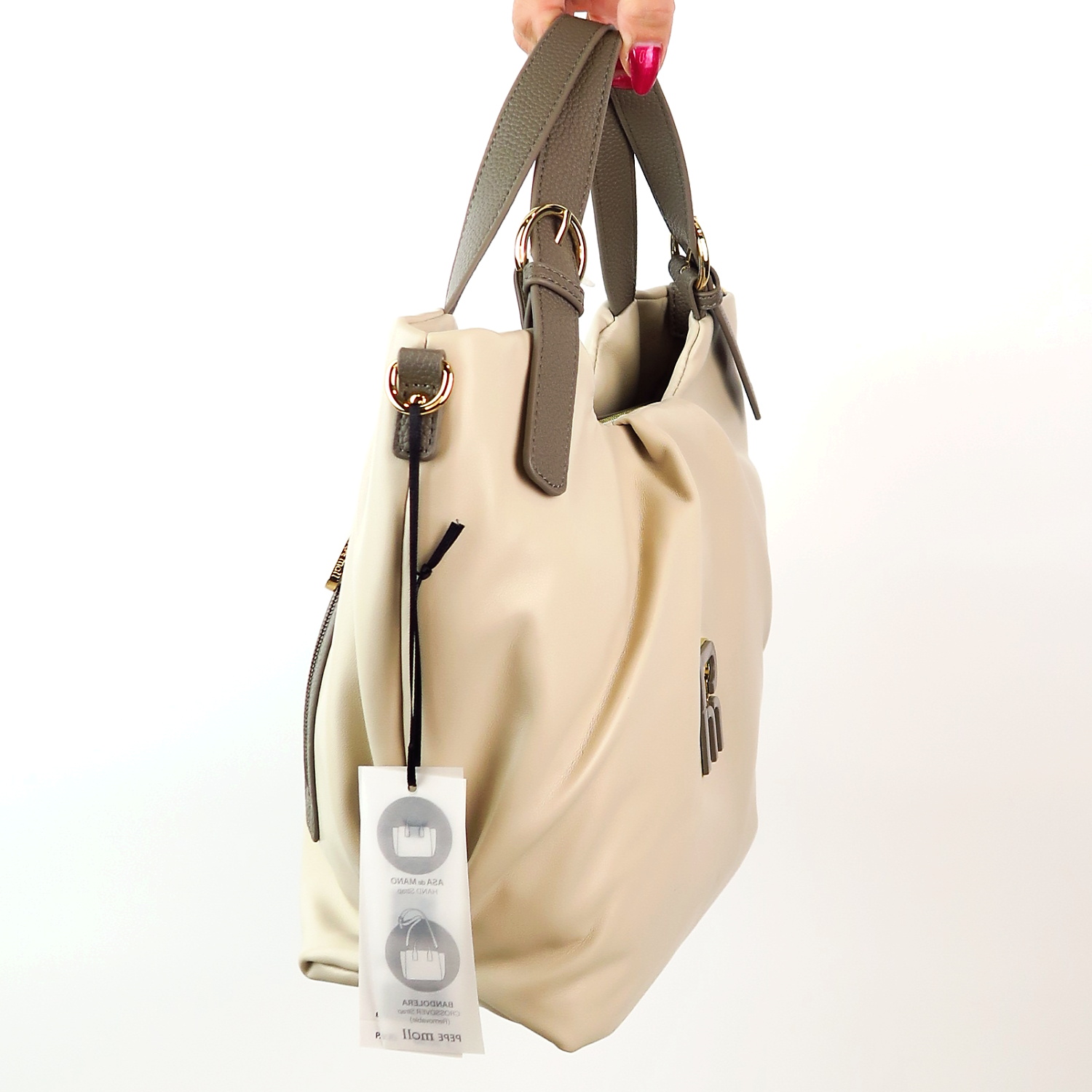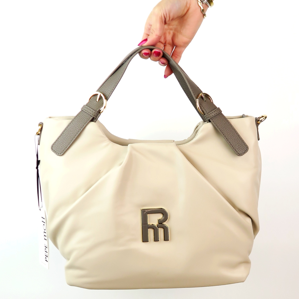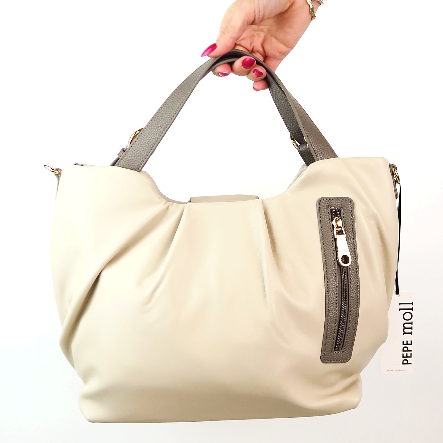 Kvalitná kabelka značky PEPE MOLL. Model v béžovej farbe. Zvršok vyrobený z ekologickej kože.