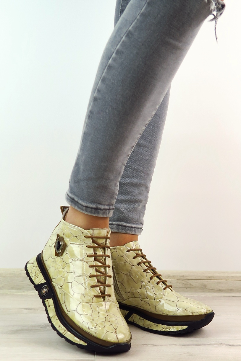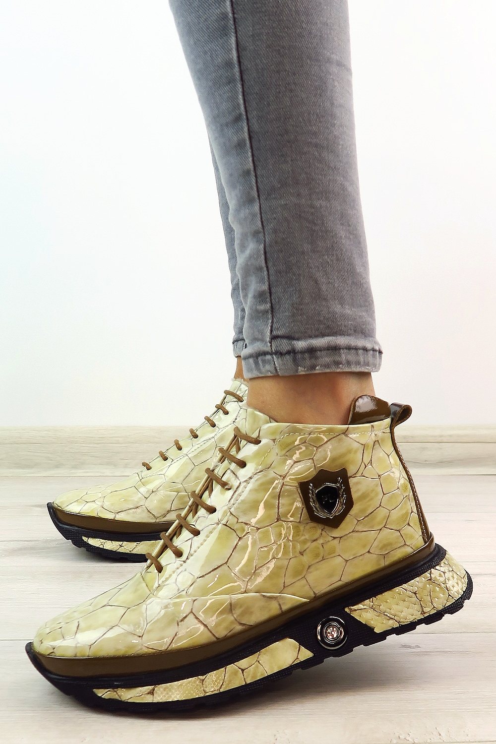 Elegantné dámske členkové tenisky v luxusnom krémovom odtieni so vzorom imitujúcim krokodíliu kožu. Lesklý povrch dodáva topánkam prémiový vzhľad, zatiaľ čo vyššie podrážka so vzorovaným lemom zabezpečuje pohodlné nosenie počas celého dňa. Originálny dizajnový prvok s logom na bočnej strane podčiarkuje jedinečnosť modelu. Ideálne na každodenné nosenie aj na štýlové voľnočasové kombinácie. Vnútro zateplené kožušinou.