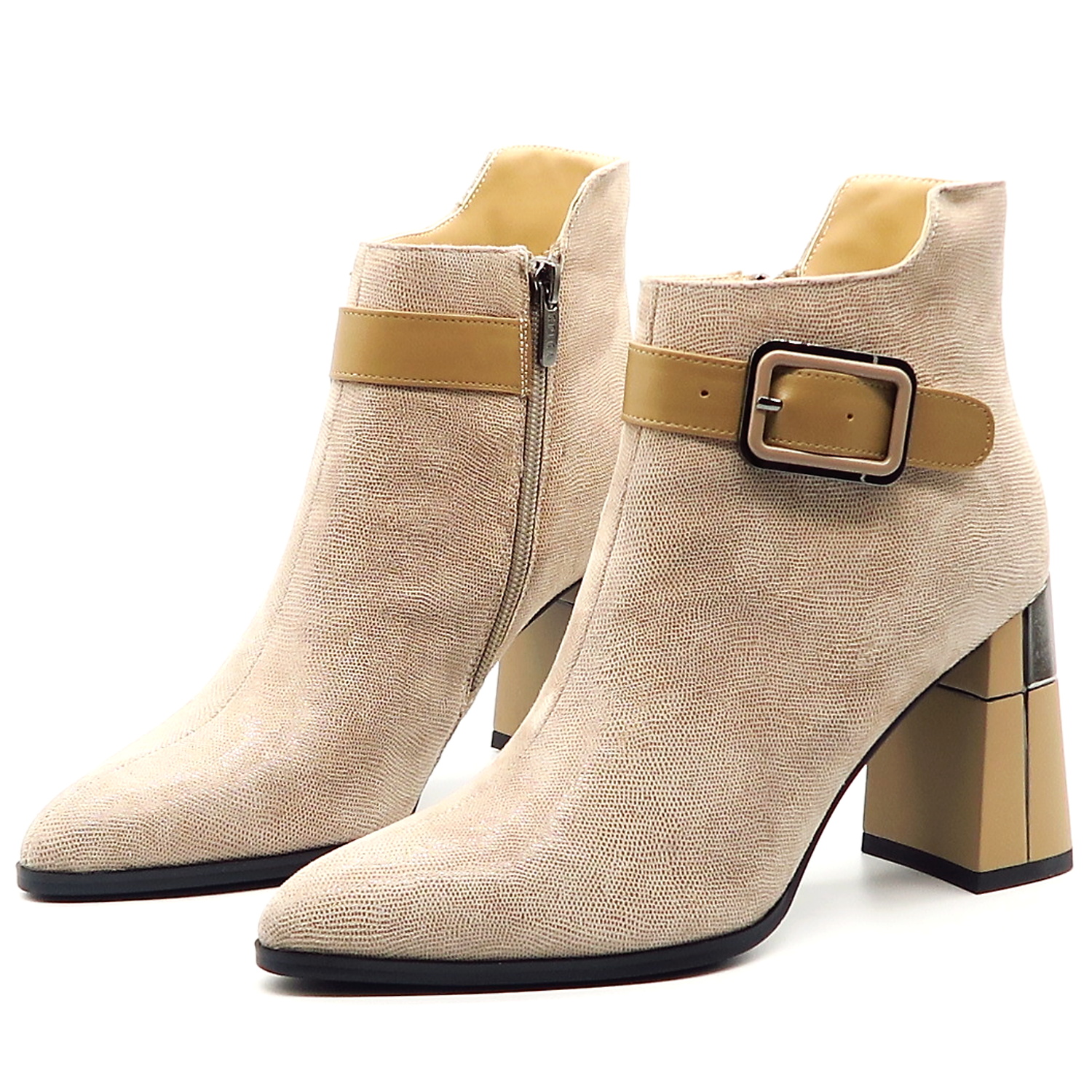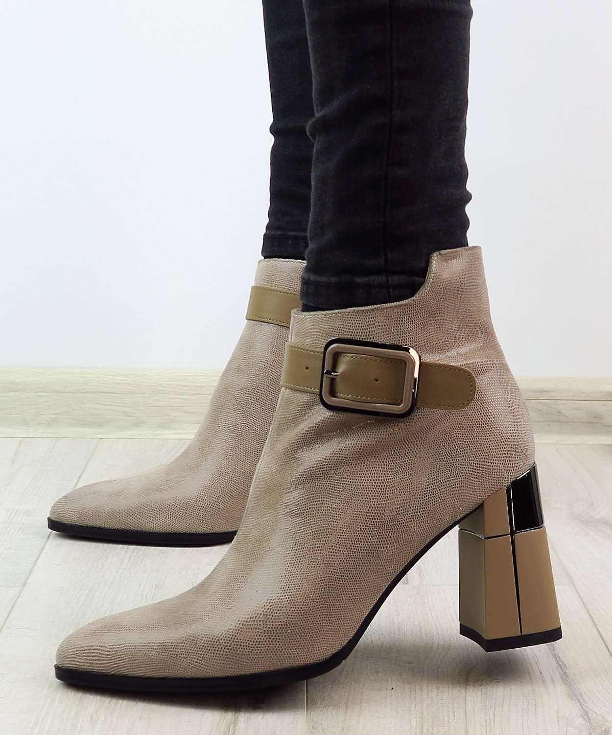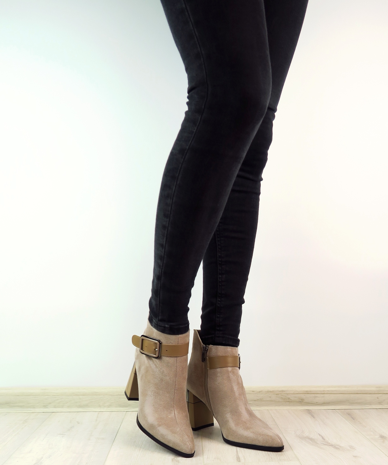 Dámske členkové topánky značky EPICA pôsobia elegantne a moderne vďaka svojmu svetlému prevedeniu. Zvršok tvorí prírodná koža v béžovom odtieni s jemným leskom, čo dodáva topánke luxusný nádych. Na bočnej strane sa nachádza ozdobný ramienok s výraznou kovovou prackou . Podpätok je stredne vysoký a hrubší so striebornou aplikáciou. Tento model je ideálny pre ženy, ktoré majú rady decentnú eleganciu s moderným nádychom.