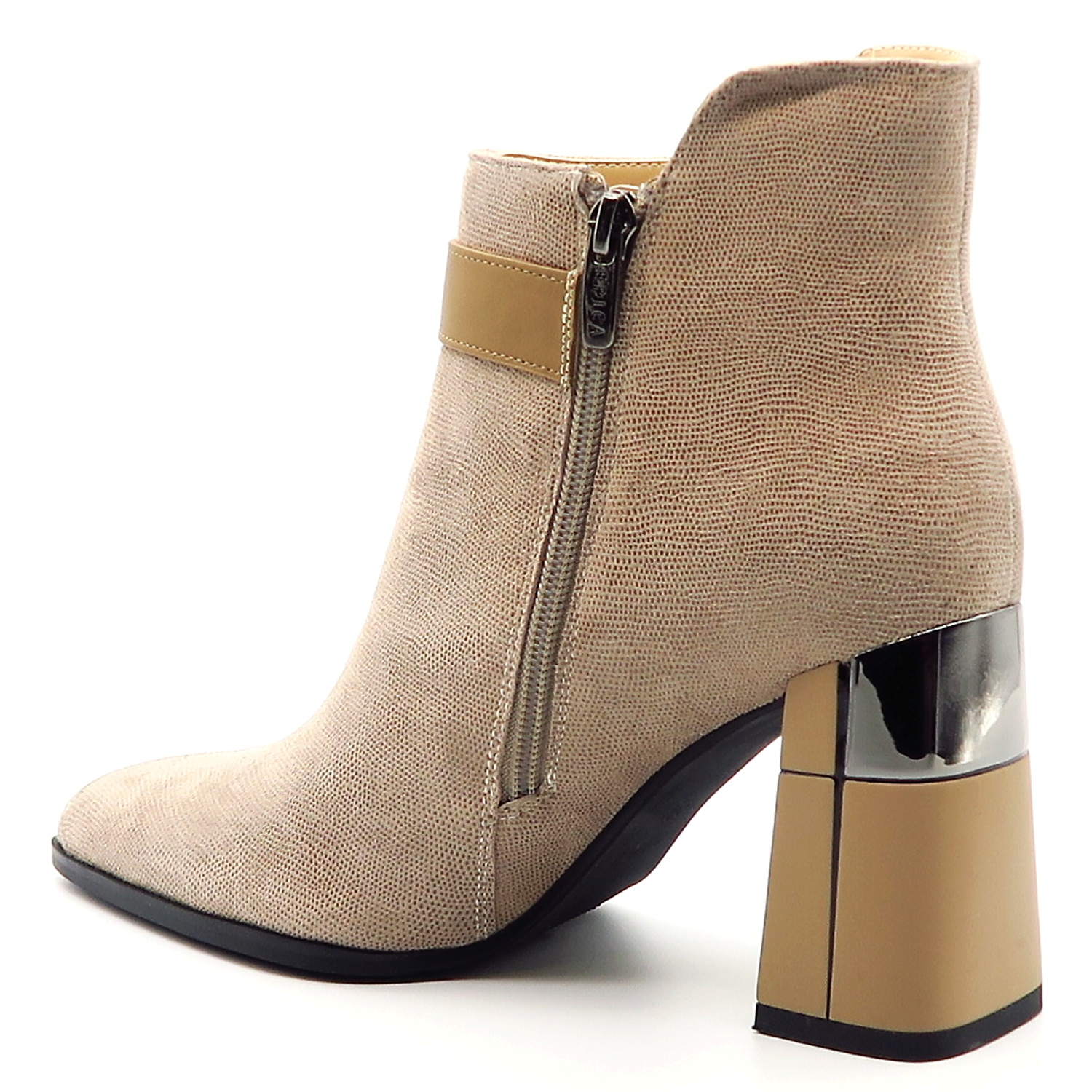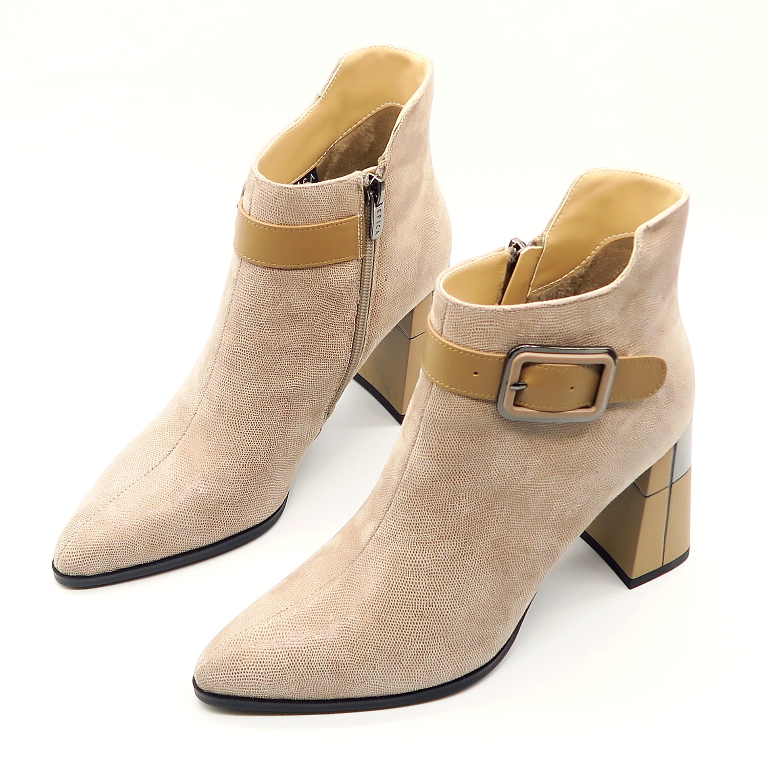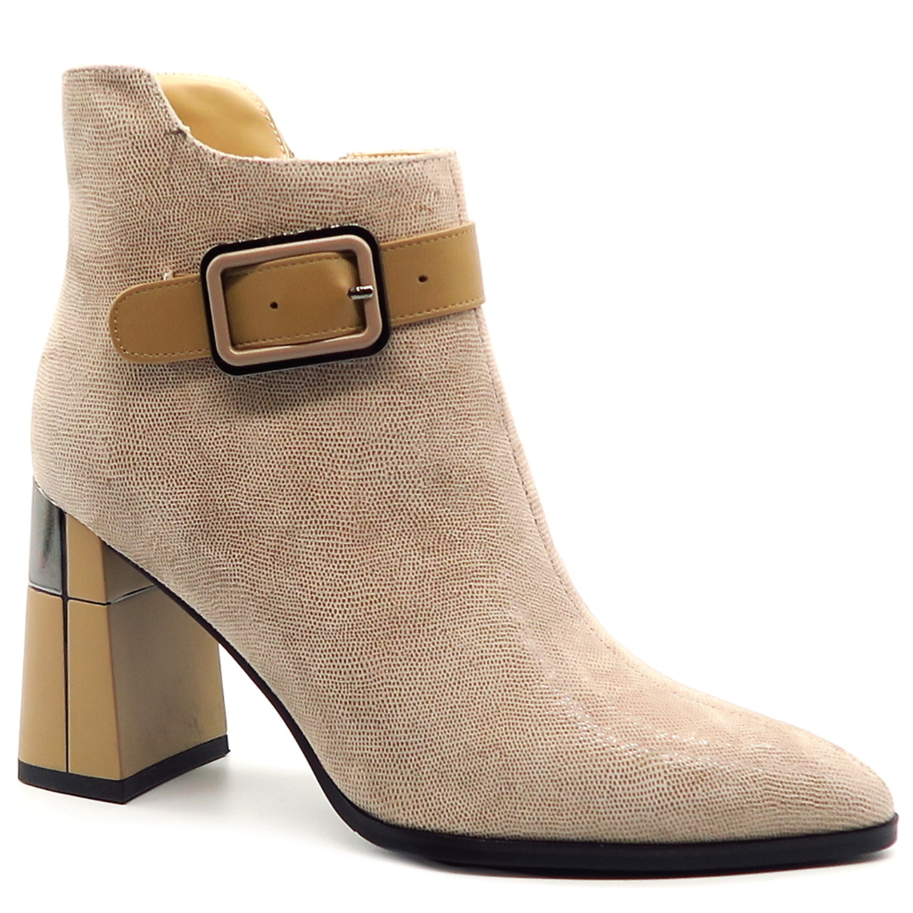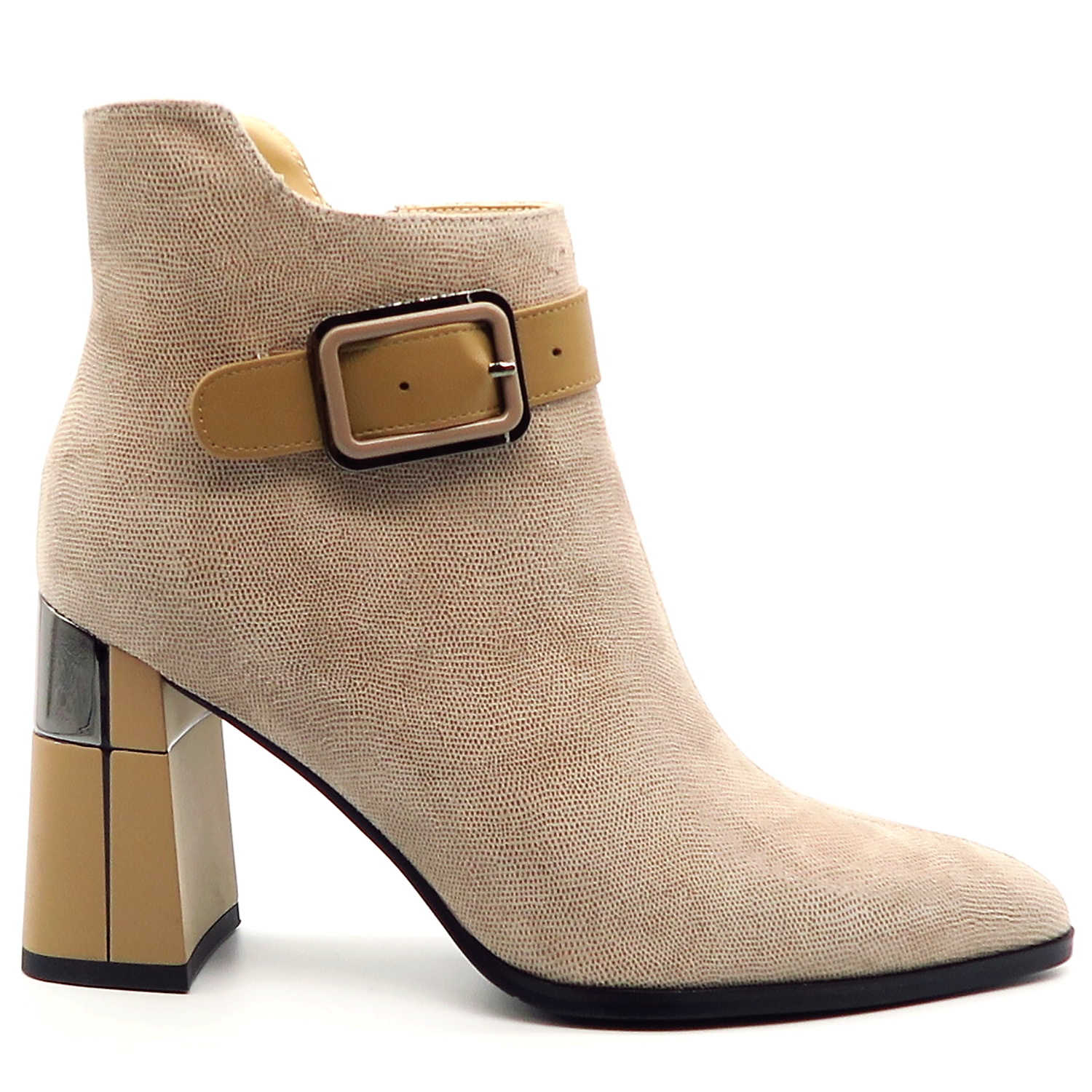 Dámske členkové topánky značky EPICA pôsobia elegantne a moderne vďaka svojmu svetlému prevedeniu. Zvršok tvorí prírodná koža v béžovom odtieni s jemným leskom, čo dodáva topánke luxusný nádych. Na bočnej strane sa nachádza ozdobný ramienok s výraznou kovovou prackou . Podpätok je stredne vysoký a hrubší so striebornou aplikáciou. Tento model je ideálny pre ženy, ktoré majú rady decentnú eleganciu s moderným nádychom.
