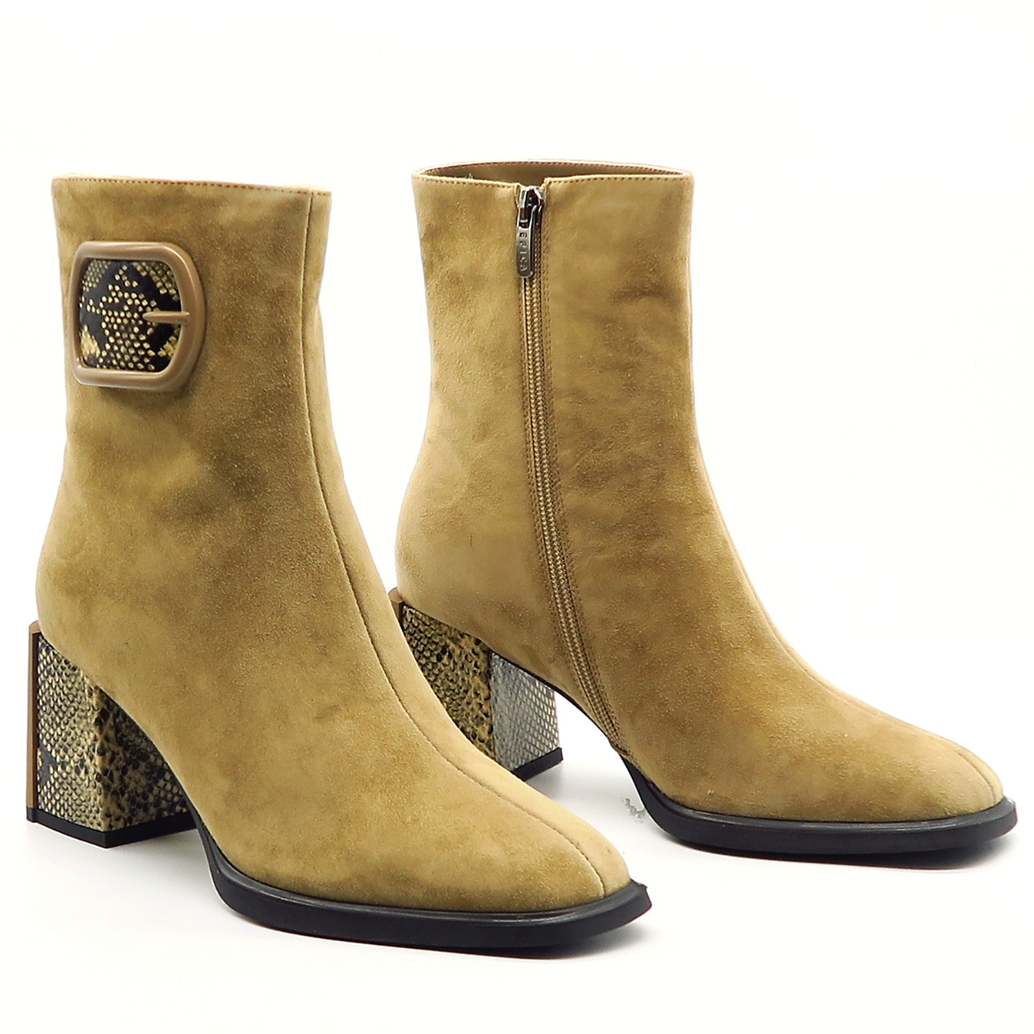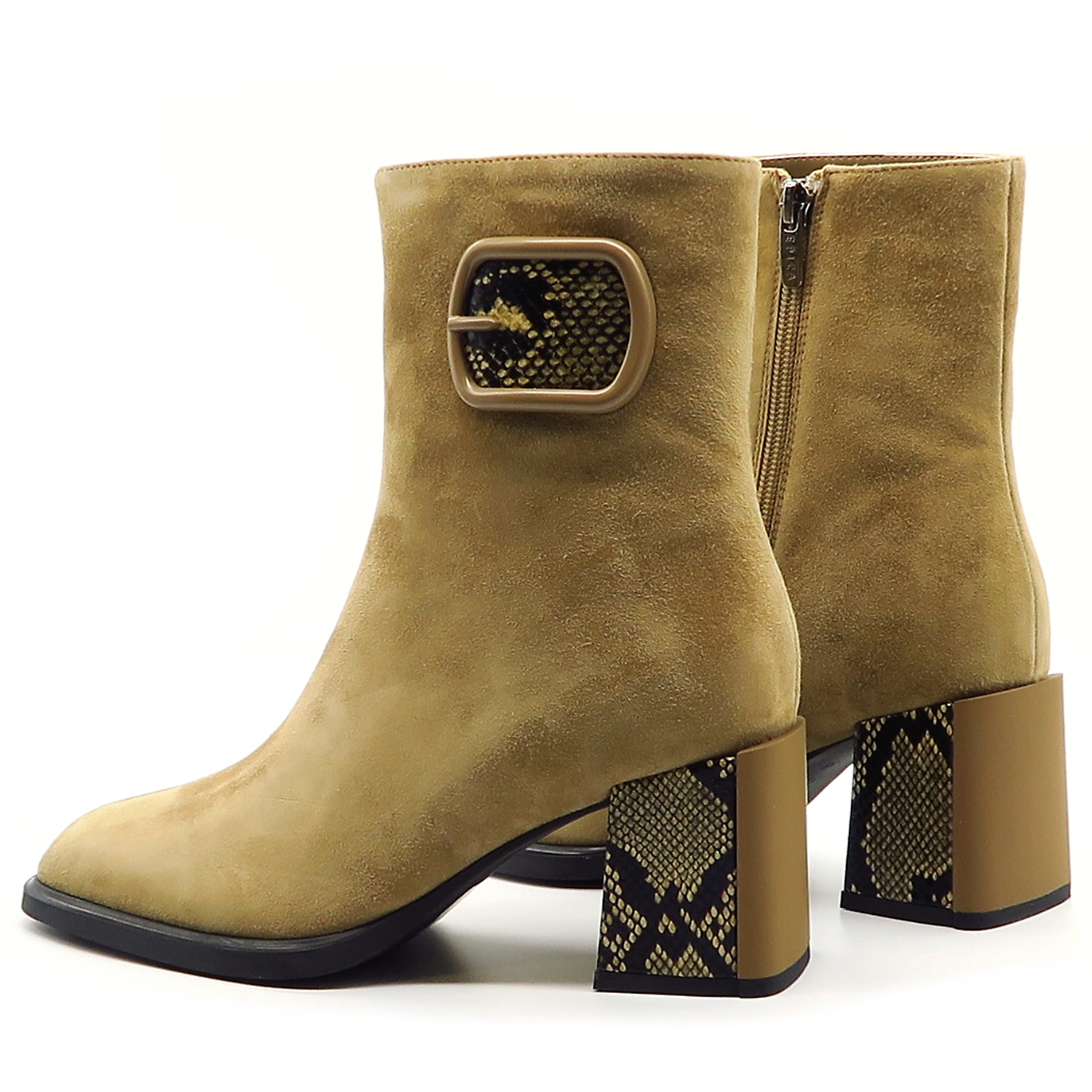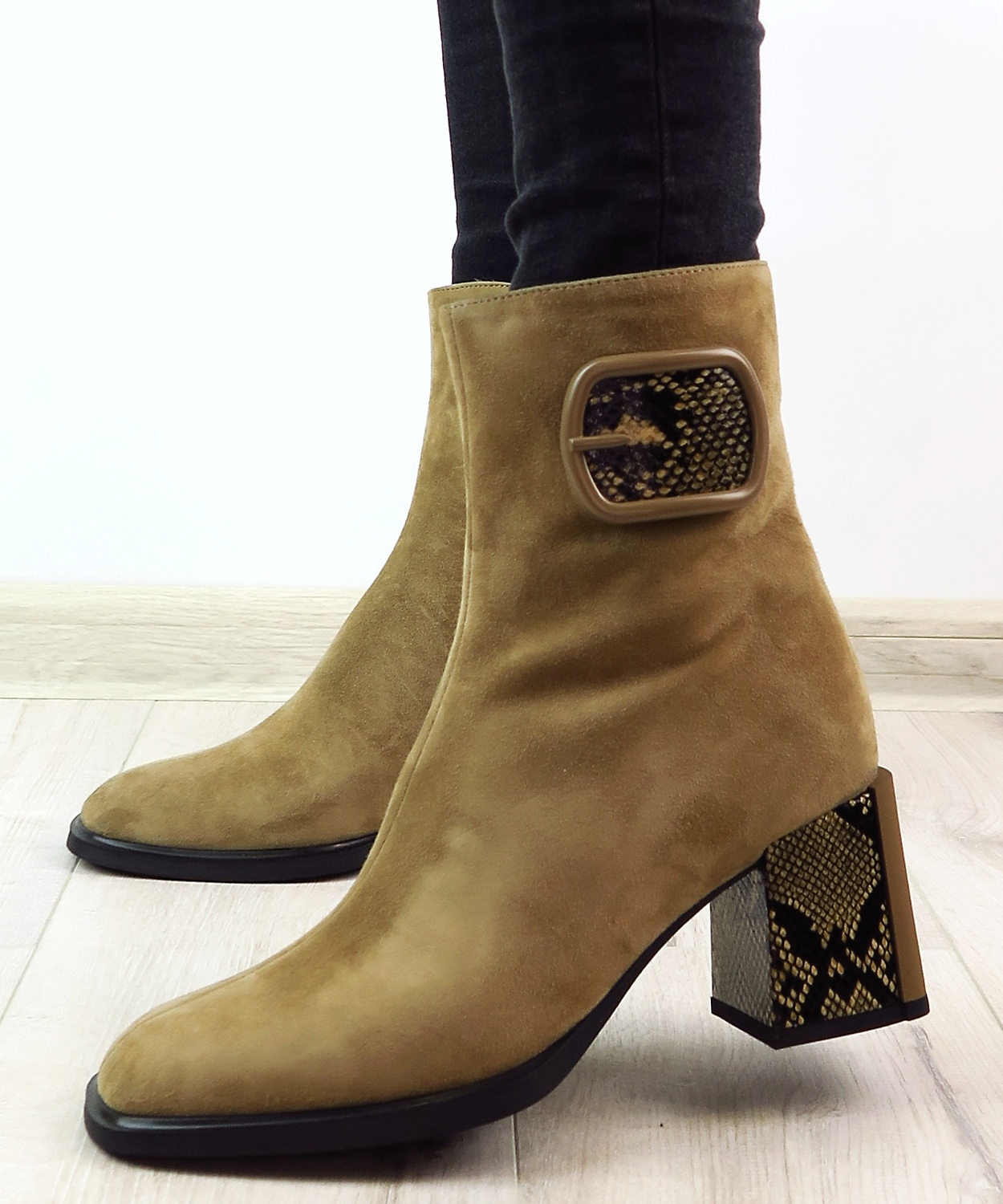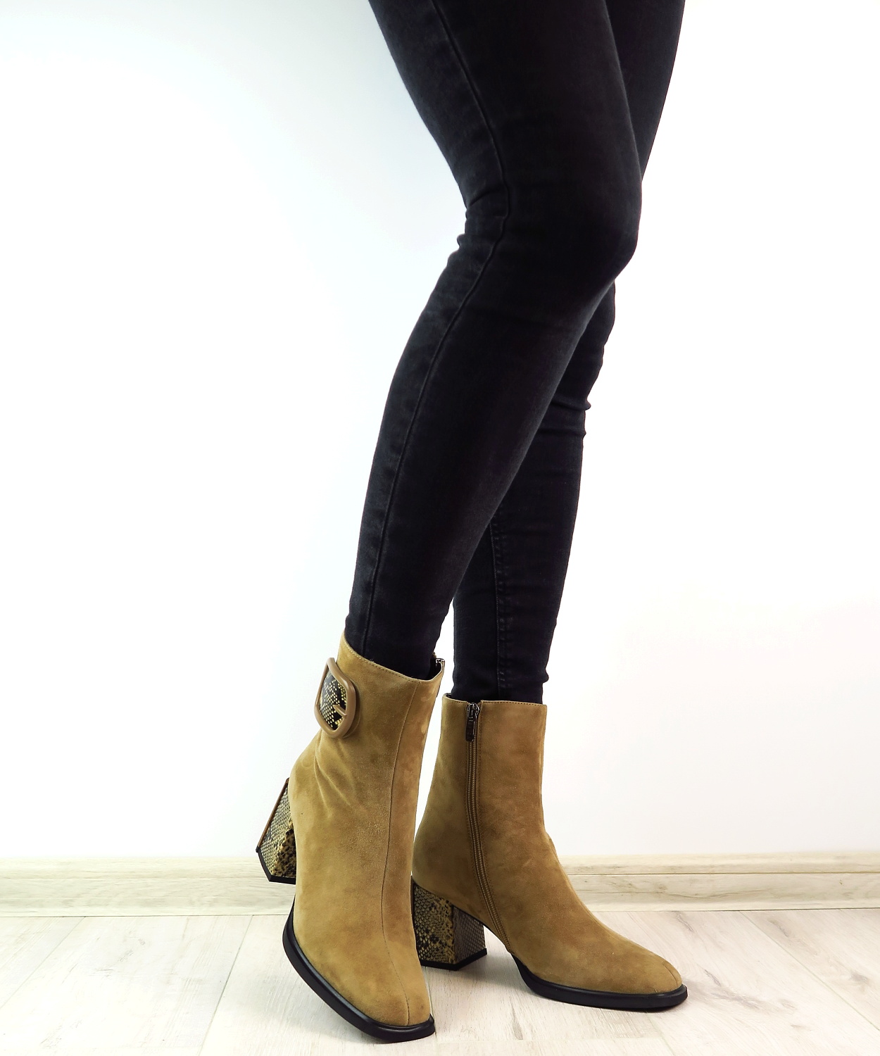 Kvalitný model topánok od značky EPICA. Krásne prevedenie v béžovej farbe. Zvršok vyrobený z prírodnej kože. Majú jemne hranatú špičku a stredne vysoký, širší podpätok zdobený vzorom imitujúcim hadiu kožu v čierno-zlatom prevedení. Rovnaký detail sa nachádza aj na ozdobnej spone na vonkajšej strane, čo dodáva modelu luxusný a originálny vzhľad. Podrážka je čierna, kontrastná a praktická. Tento kúsok je ideálny na jesenné a zimné obdobie, vhodný na kombinovanie s nohavicami, šatami či sukňami a dodá outfitu výrazný, štýlový akcent.