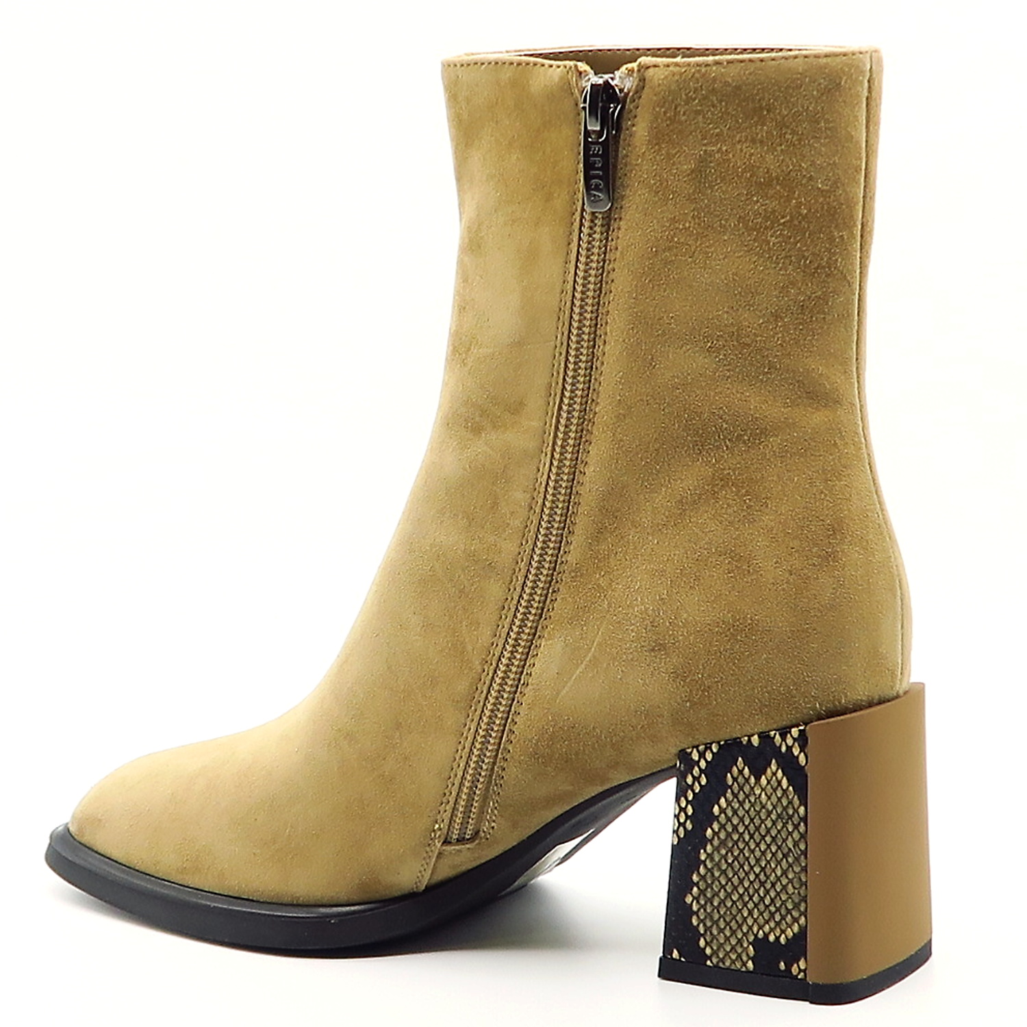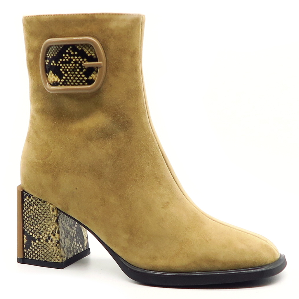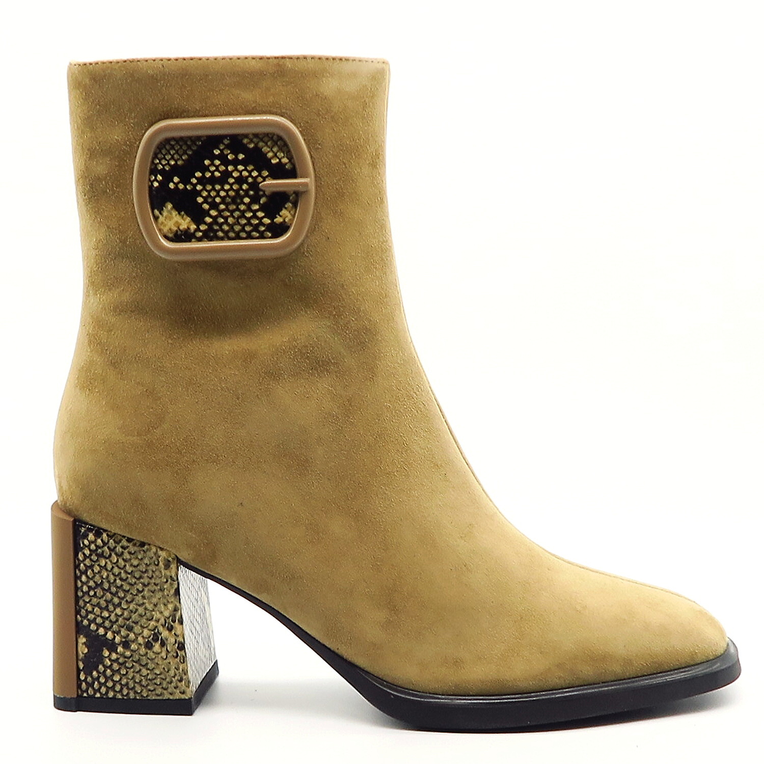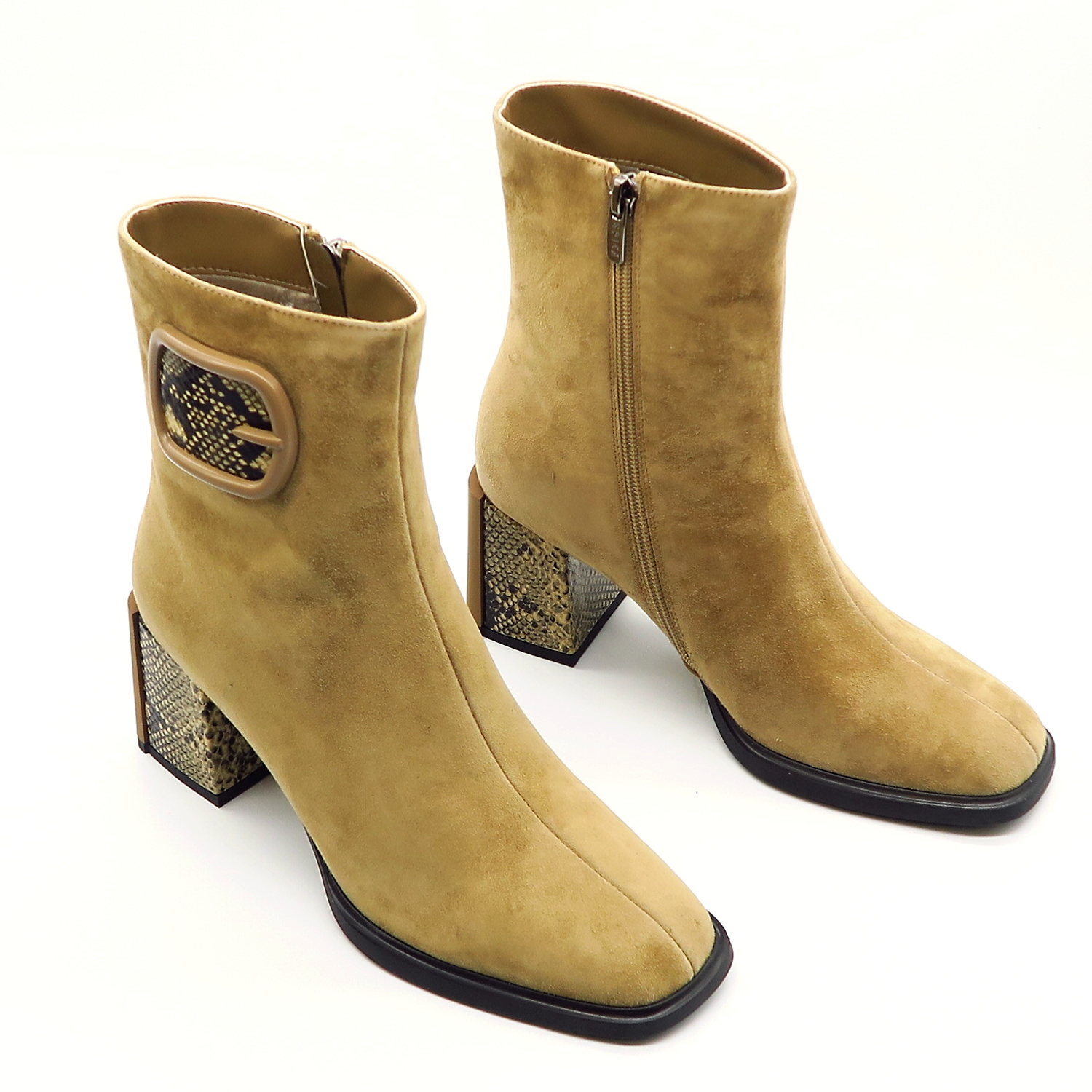 Kvalitný model topánok od značky EPICA. Krásne prevedenie v béžovej farbe. Zvršok vyrobený z prírodnej kože. Majú jemne hranatú špičku a stredne vysoký, širší podpätok zdobený vzorom imitujúcim hadiu kožu v čierno-zlatom prevedení. Rovnaký detail sa nachádza aj na ozdobnej spone na vonkajšej strane, čo dodáva modelu luxusný a originálny vzhľad. Podrážka je čierna, kontrastná a praktická. Tento kúsok je ideálny na jesenné a zimné obdobie, vhodný na kombinovanie s nohavicami, šatami či sukňami a dodá outfitu výrazný, štýlový akcent.