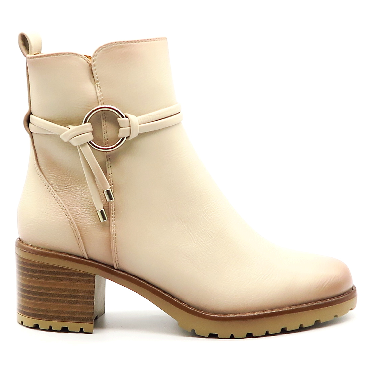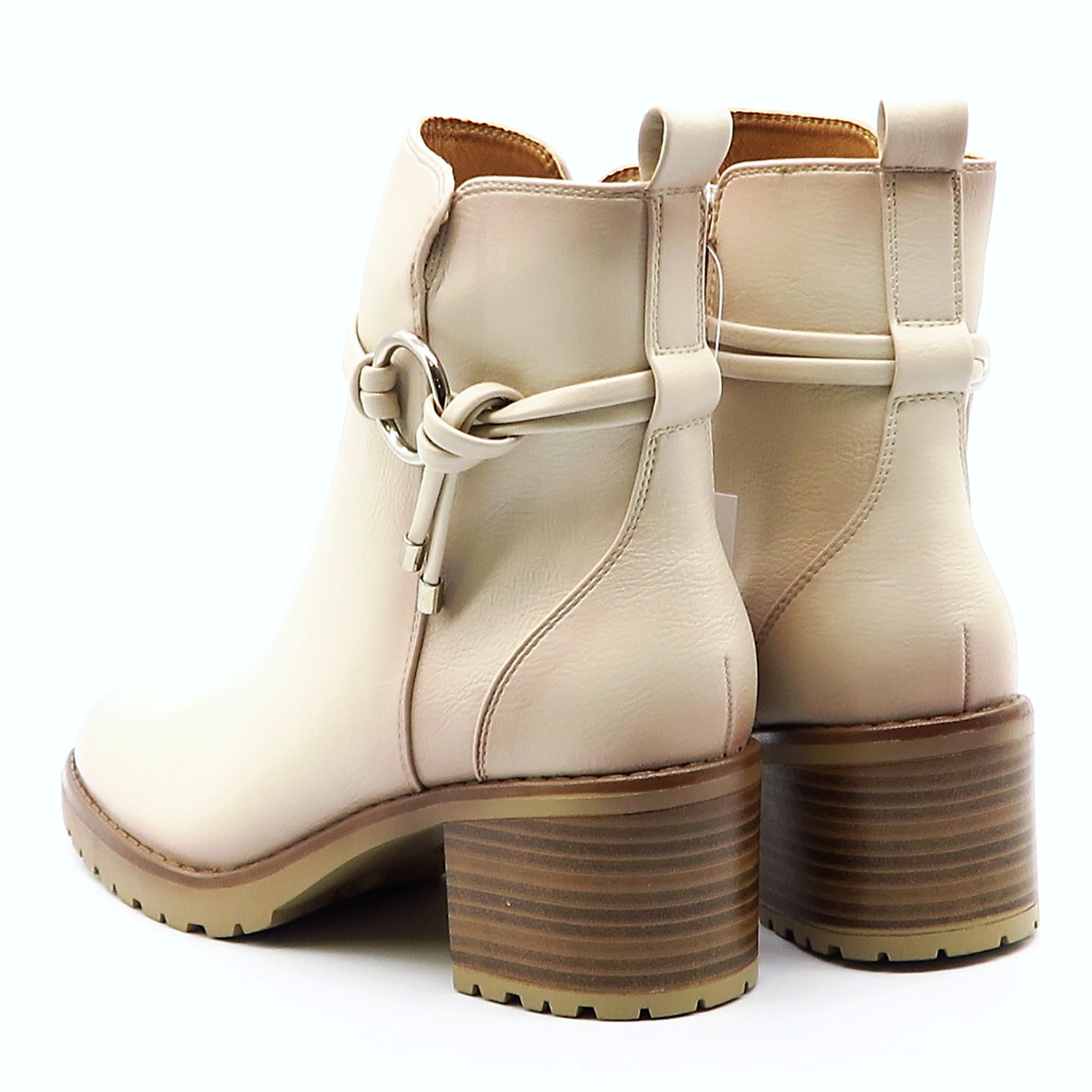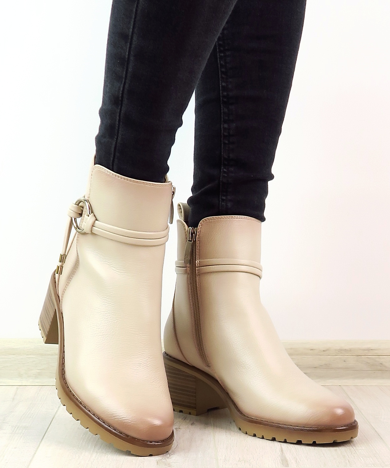Dámske členkové topánky značky EVENTO. Model v krásnej béžovej farbe. Zvršok vyrobený z ekologickej kože. Pekným doplnkom je kovová pracka na bočnej strane, ktorá dodáva topánkam moderný look. Komfortný hrubší podpätok zaručí pohodlie počas nosenia. Vnútro zateplené kožušinou, ktorá zahreje počas chladných dní.