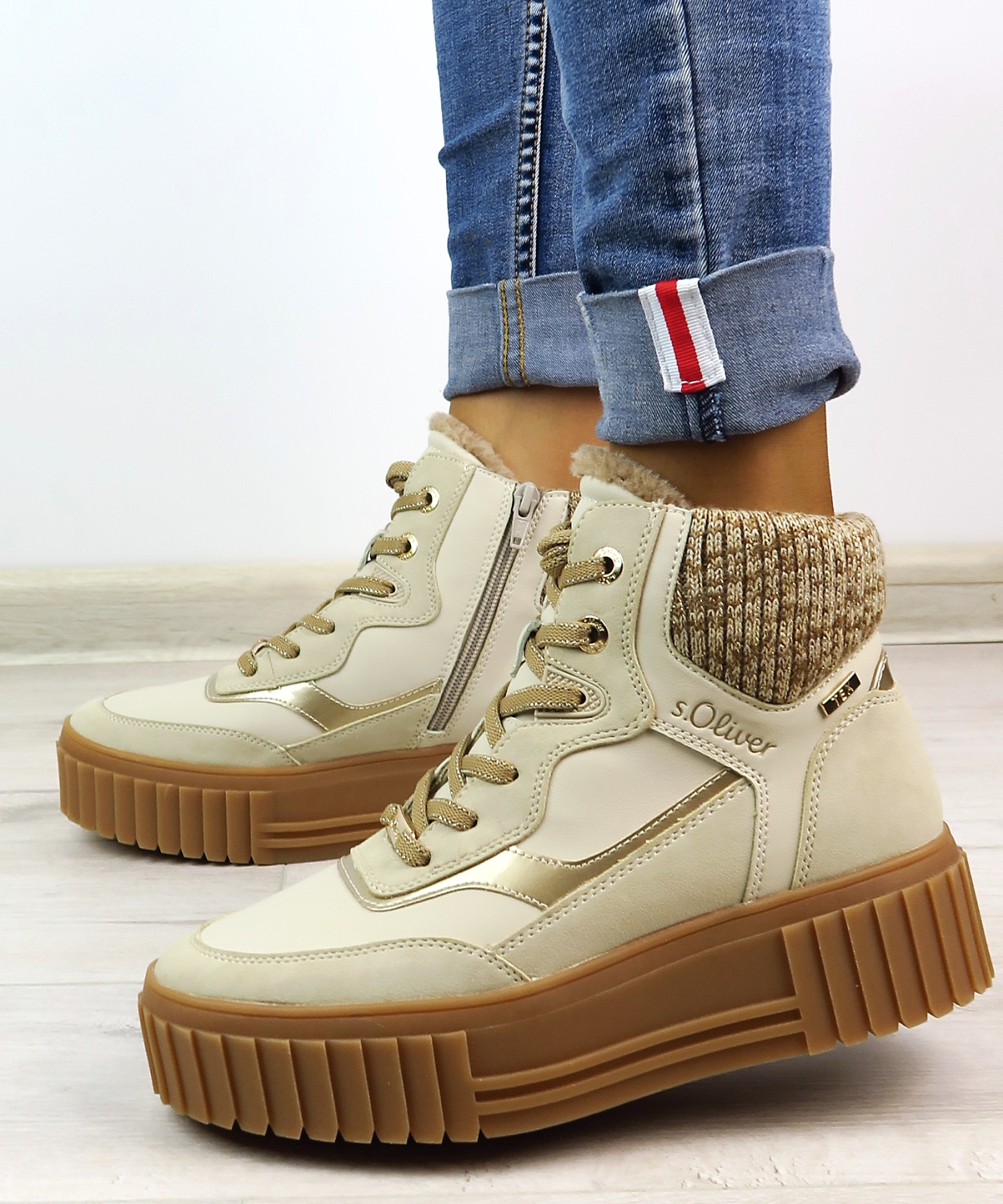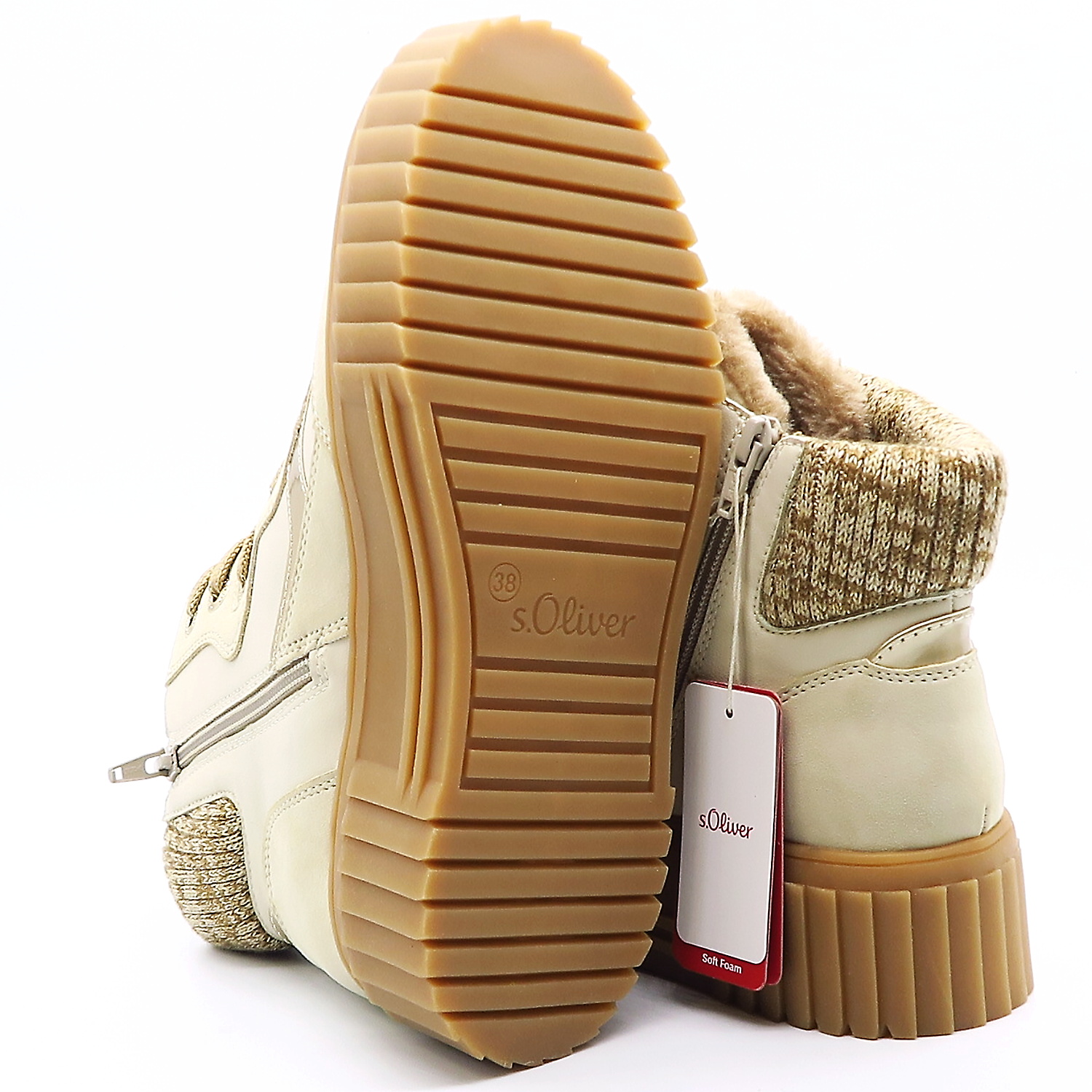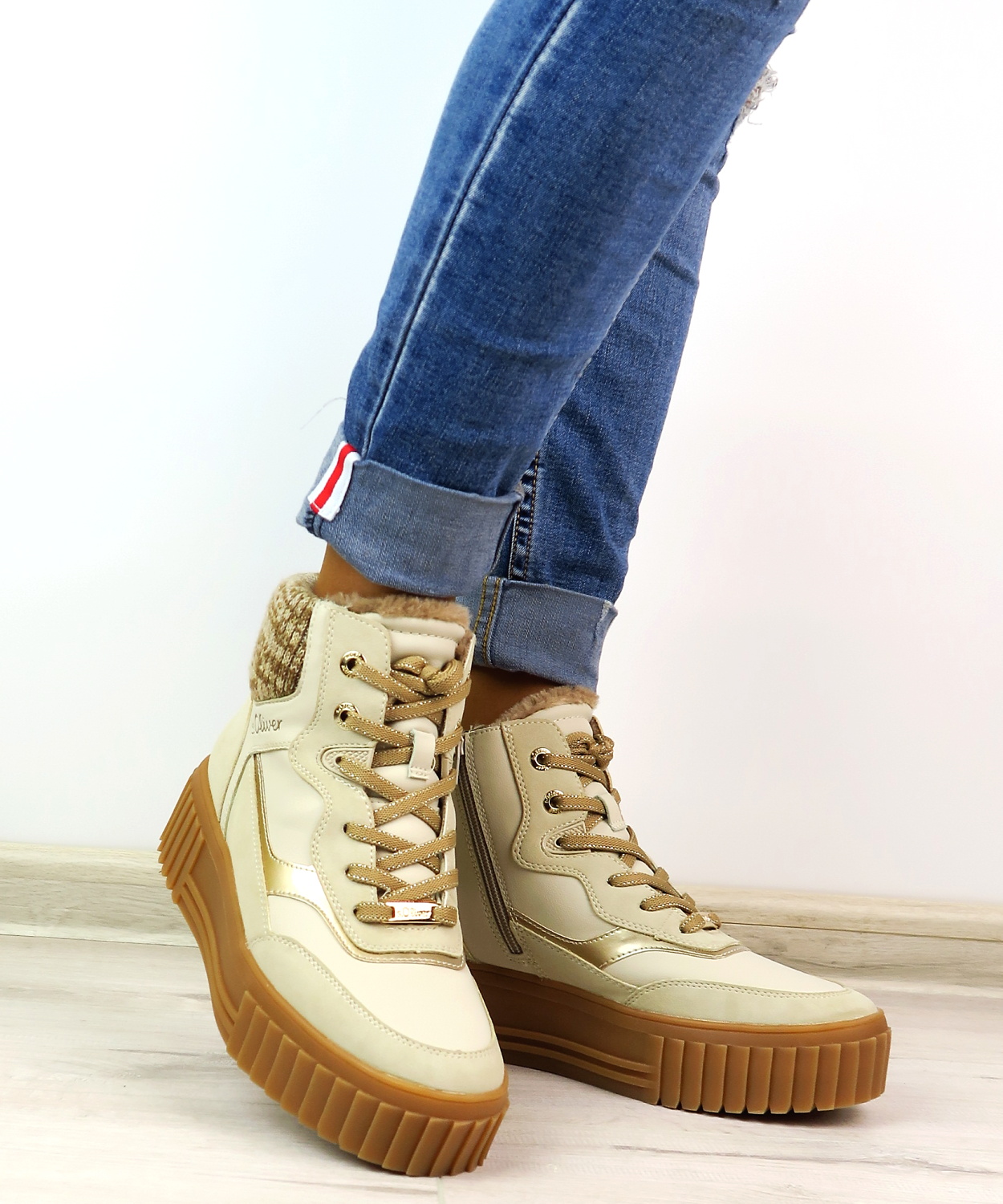 Dámske tenisky S.OLIVER spájajú štýl, pohodlie a funkčnosť v jednom modeli. Béžový zvršok doplnený decentnými zlatými detailmi pôsobí moderne a elegantne, takže sa dajú ľahko kombinovať nielen so športovým, ale aj s ležérnym outfitom. Zaujímavým prvkom je pletený materiál v zadnej časti. Masívna hnedá podrážka zabezpečuje stabilitu pri chôdzi a dodáva topánke originálny mestský vzhľad. Vnútro zateplené kožušinou, takže vhodné na zimné obdobie