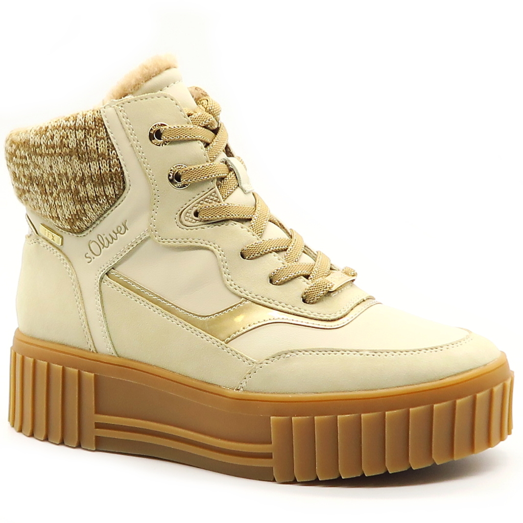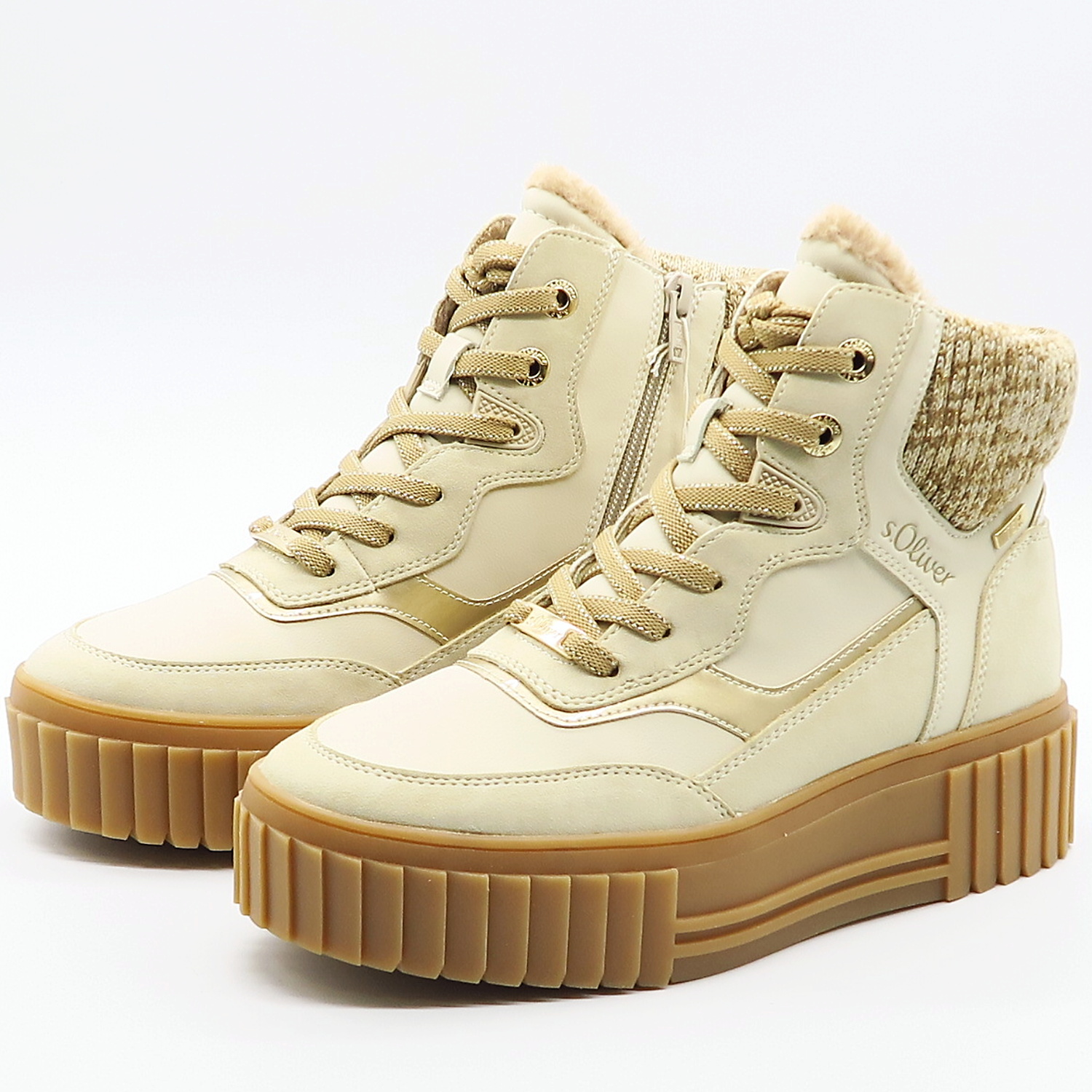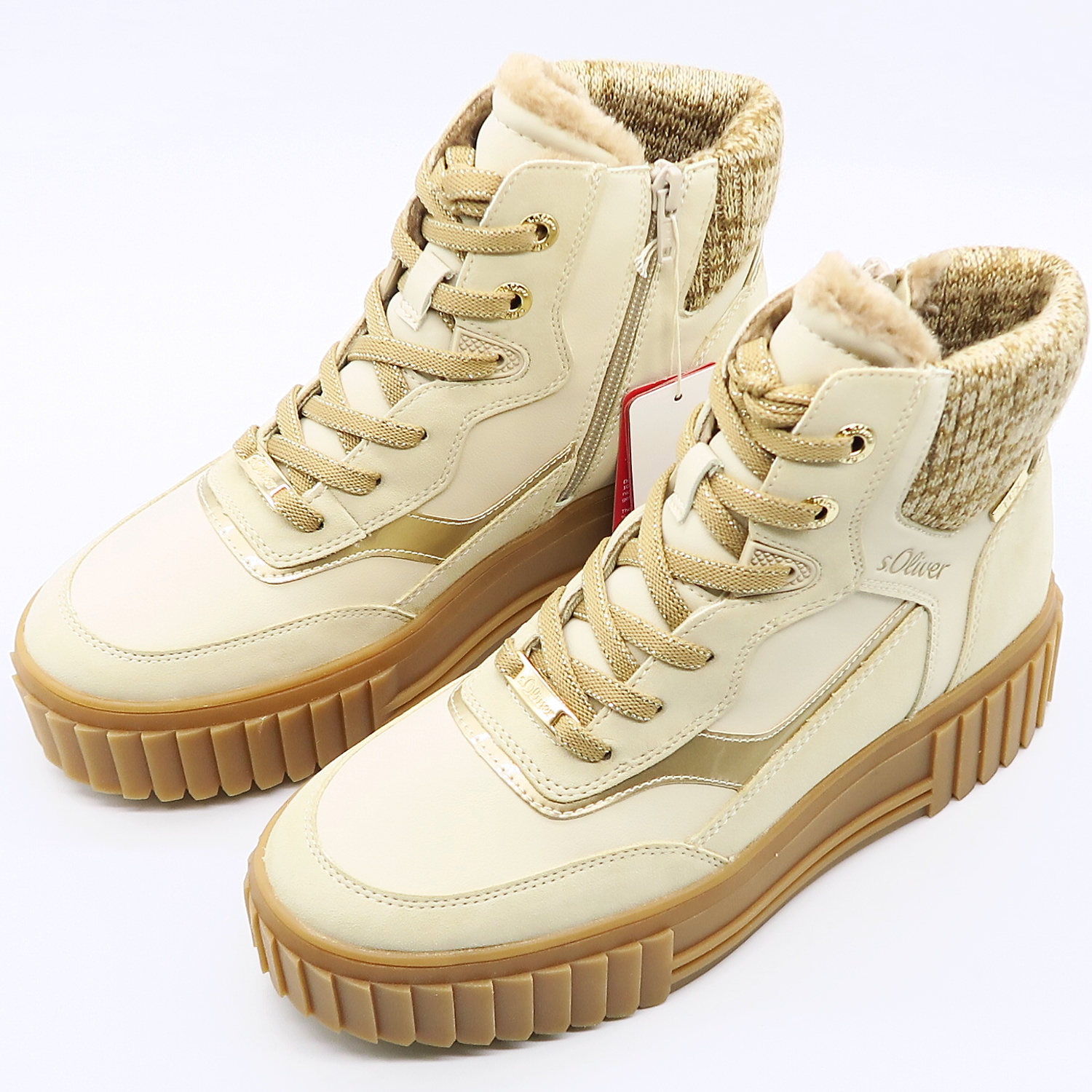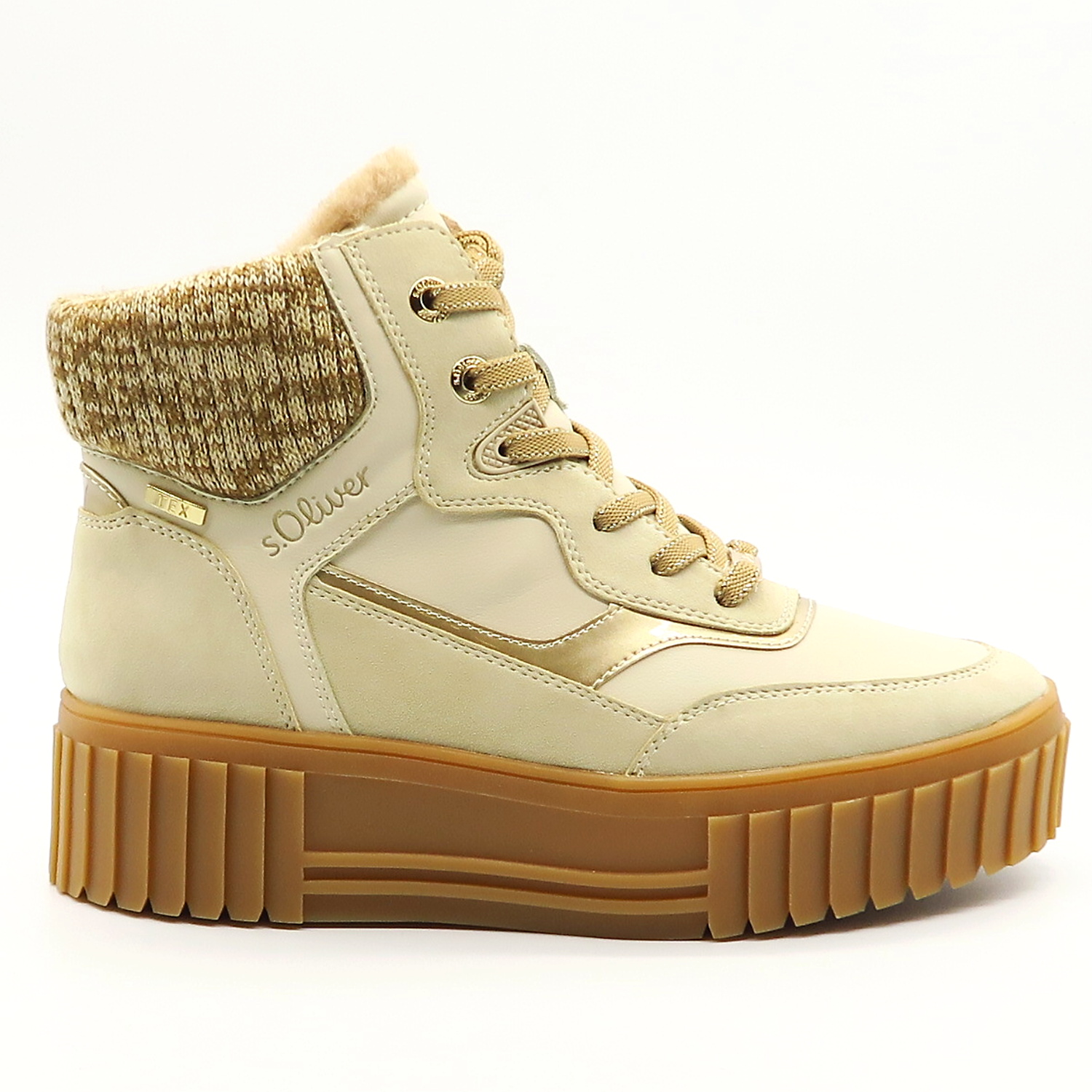 Dámske tenisky S.OLIVER spájajú štýl, pohodlie a funkčnosť v jednom modeli. Béžový zvršok doplnený decentnými zlatými detailmi pôsobí moderne a elegantne, takže sa dajú ľahko kombinovať nielen so športovým, ale aj s ležérnym outfitom. Zaujímavým prvkom je pletený materiál v zadnej časti. Masívna hnedá podrážka zabezpečuje stabilitu pri chôdzi a dodáva topánke originálny mestský vzhľad. Vnútro zateplené kožušinou, takže vhodné na zimné obdobie