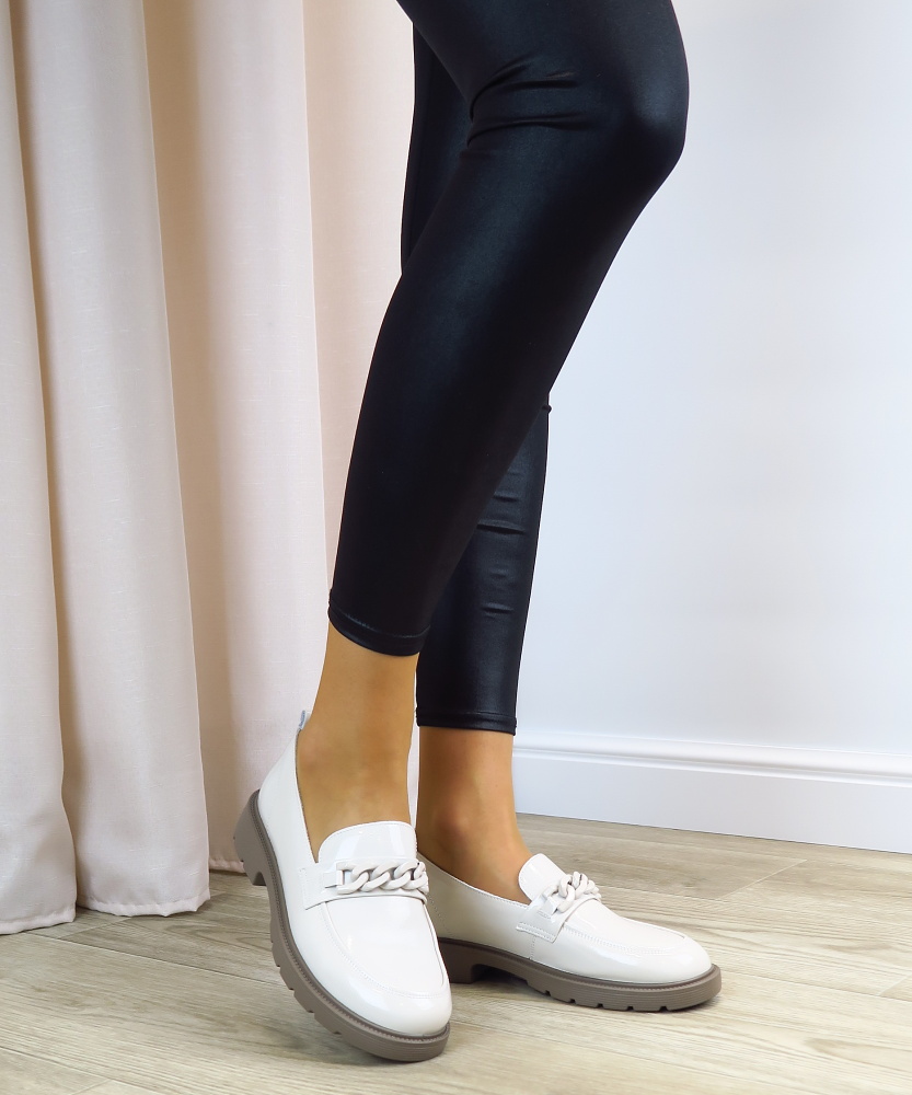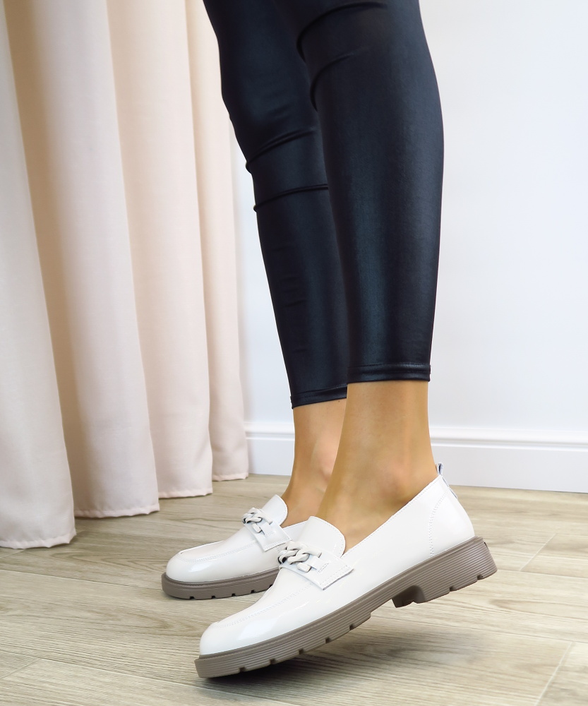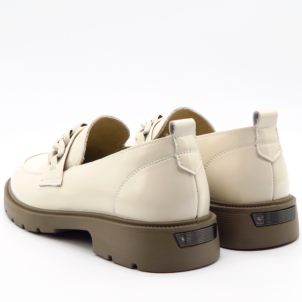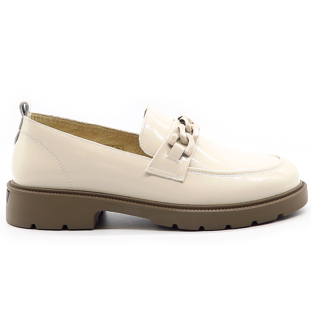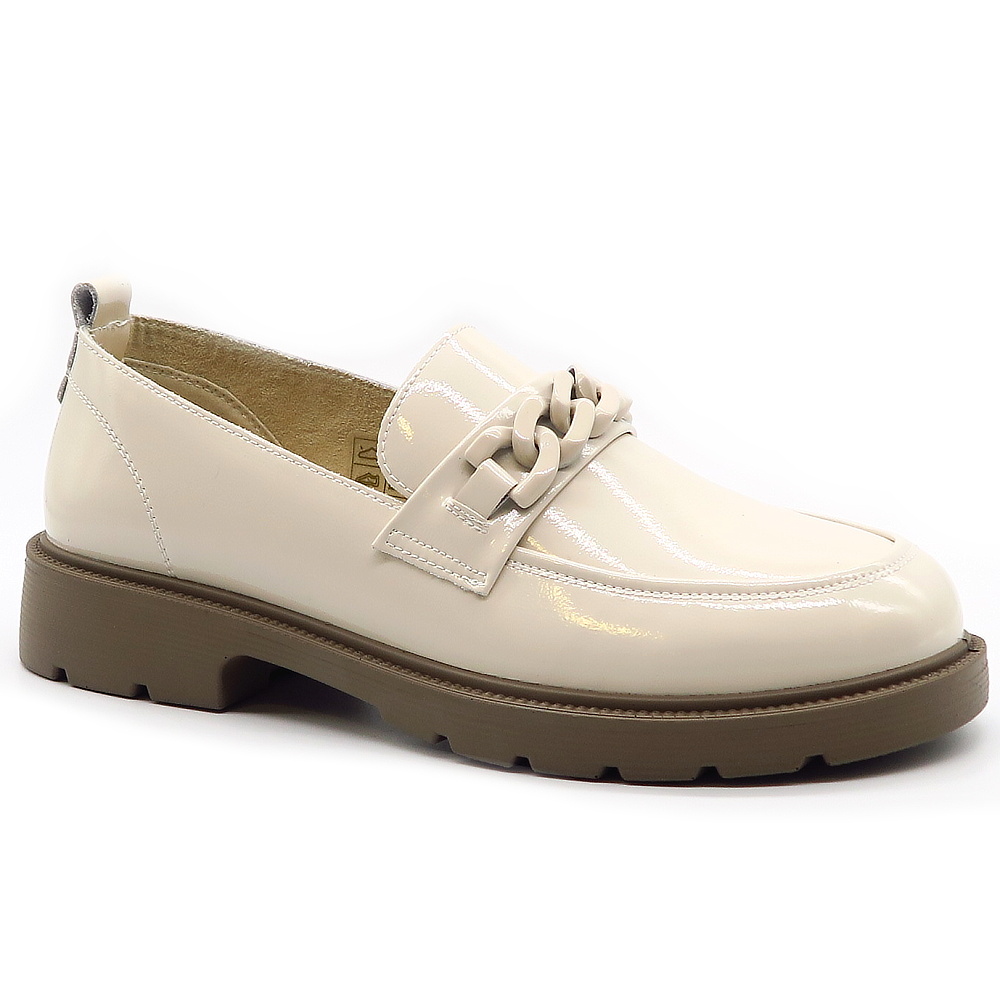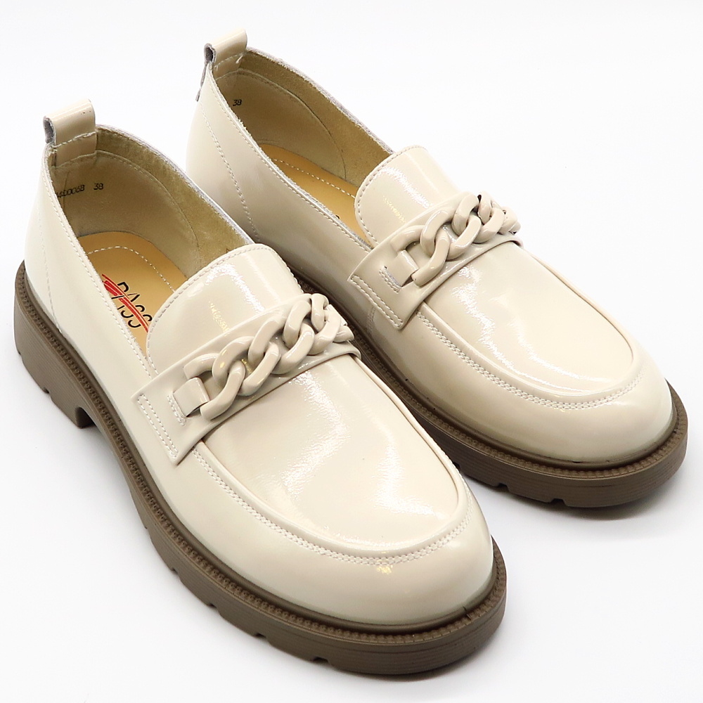 Dámske mokasíny od kvalitnej značky PASS. Model v lakovanej béžovej farbe. Zvršok vyrobený z prírodnej kože. Prednú časť zdobí retiazková aplikácia, ktorá topánkam dodáva štýlový a ženský charakter. Výhodou tohto modelu je ich komfort, a vďaka mäkkej kože pekne sadnú na chodidlo. Topánky, ktoré určite nesklamú.