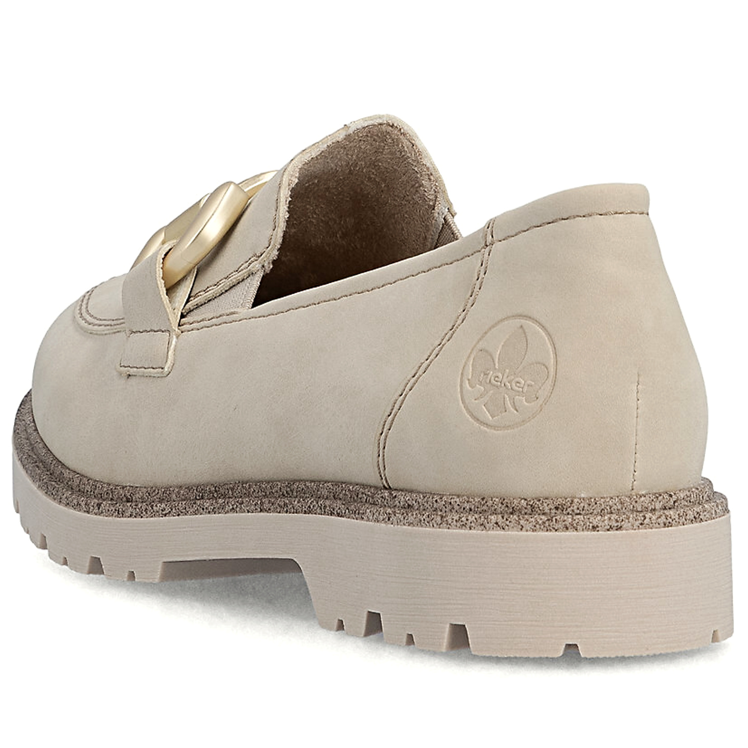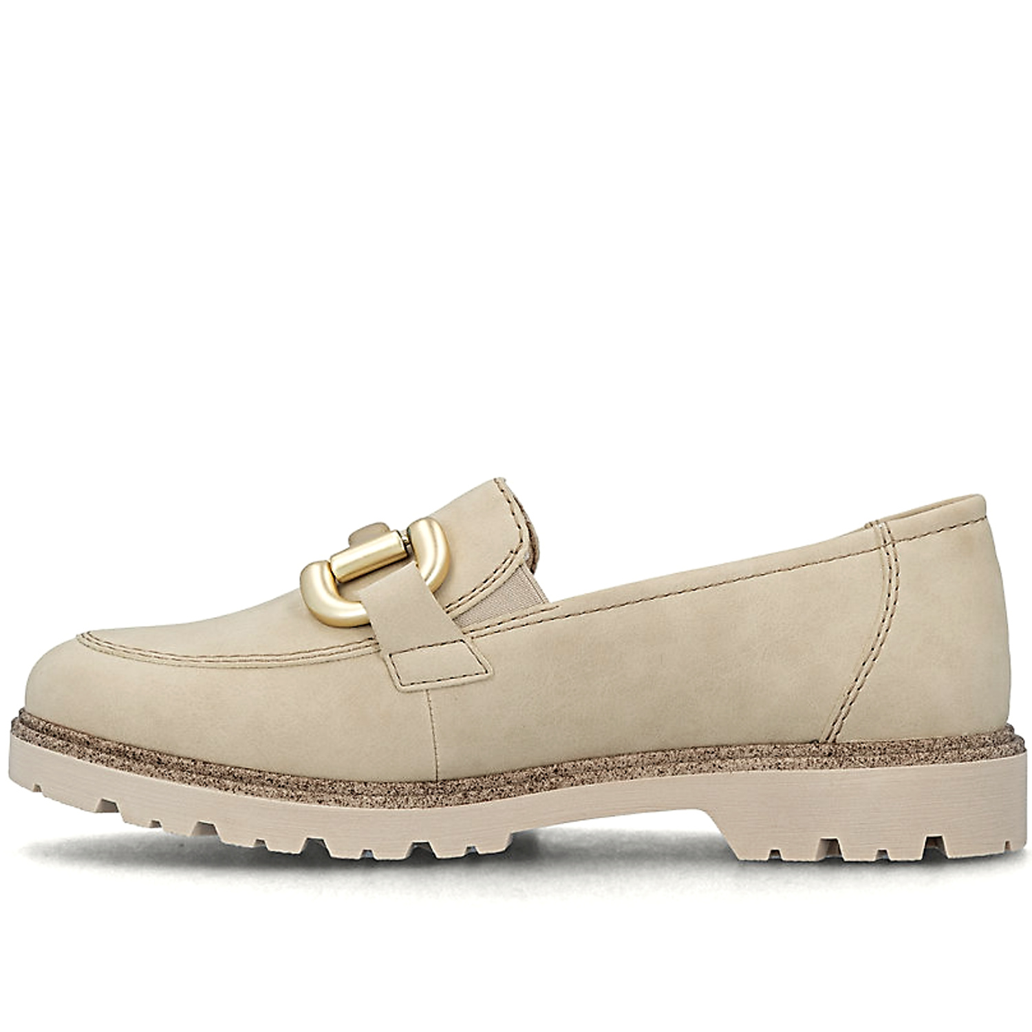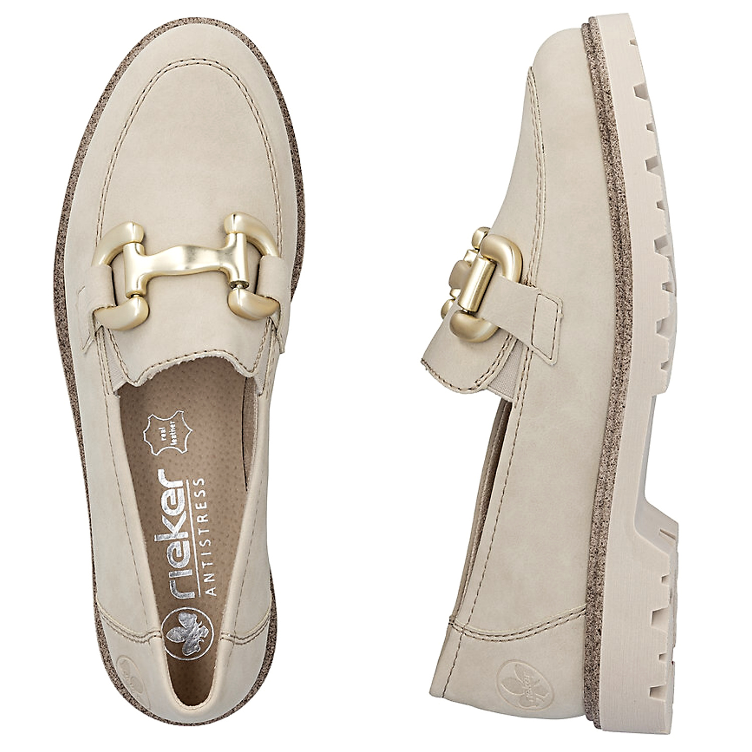 Štýlové dámske mokasíny značky RIEKER v elegantnej béžovej farbe, ktoré sú ideálnou voľbou na každodenné nosenie. Zvršok je doplnený ozdobnou kovovou aplikáciou na priehlavku, ktorá dodáva obuvi moderný a nadčasový vzhľad. Ľahká a flexibilná podrážka zabezpečuje stabilitu a pohodlie pri chôdzi. Mäkká stielka s technológiou RIEKER ANTISTRESS tlmí nárazy, prispôsobuje sa chodidlu a znižuje únavu aj pri dlhšom nosení.