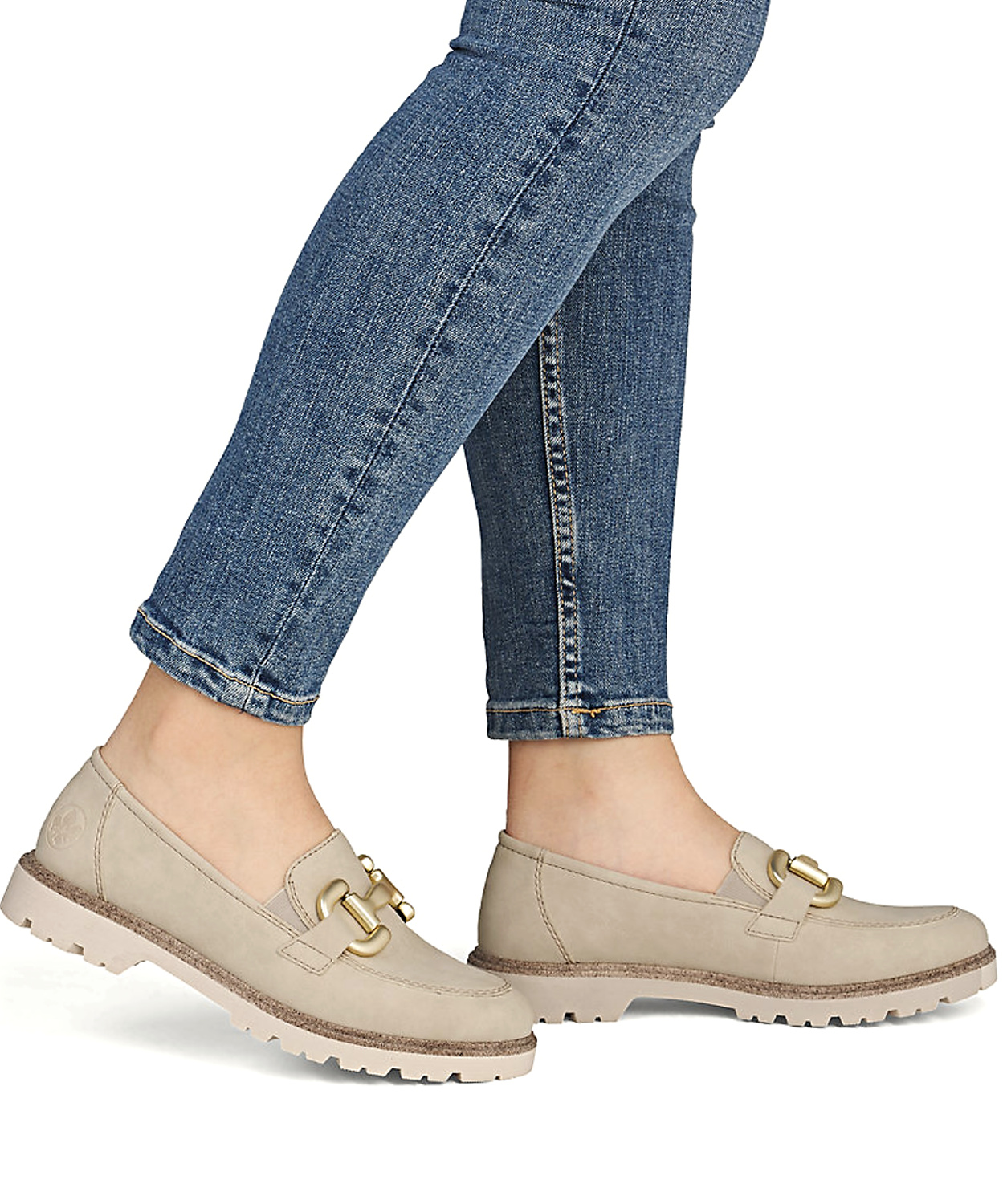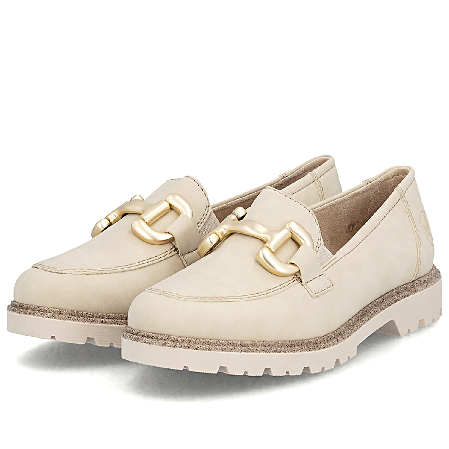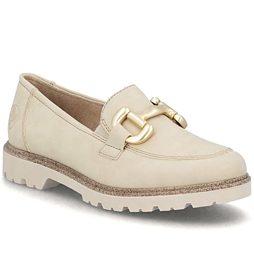 Štýlové dámske mokasíny značky RIEKER v elegantnej béžovej farbe, ktoré sú ideálnou voľbou na každodenné nosenie. Zvršok je doplnený ozdobnou kovovou aplikáciou na priehlavku, ktorá dodáva obuvi moderný a nadčasový vzhľad. Ľahká a flexibilná podrážka zabezpečuje stabilitu a pohodlie pri chôdzi. Mäkká stielka s technológiou RIEKER ANTISTRESS tlmí nárazy, prispôsobuje sa chodidlu a znižuje únavu aj pri dlhšom nosení.