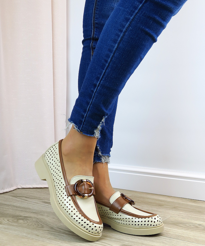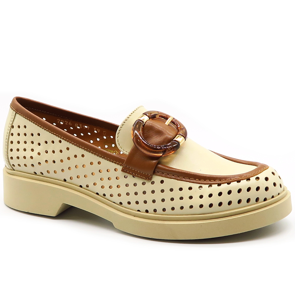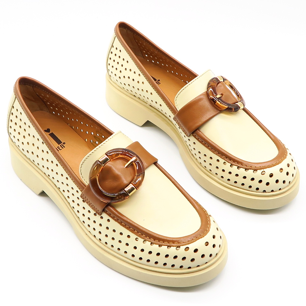 Objavte dokonalú kombináciu elegancie a pohodlia v týchto štýlových mokasínach značky SIMEN, ktoré zaujmú jemnou béžovo-hnedou farebnou kombináciou a výraznou dekoratívnou prackou. Perforovaný zvršok nielenže pôsobí moderne a vzdušne, ale zároveň zabezpečuje príjemnú cirkuláciu vzduchu, vďaka čomu sú topánky ideálne aj na celodenné nosenie počas teplejších dní. Univerzálny dizajn sa ľahko kombinuje s elegantnými nohavicami, kostýmom, džínsami aj letnými šatami.