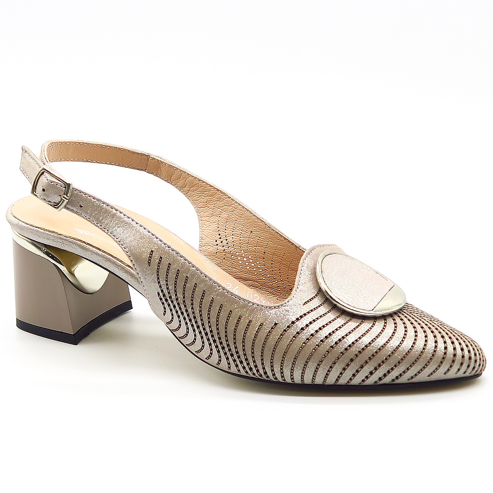 Elegantné dámske sandále v jemnom béžovom odtieni, ktoré spájajú ženskosť, pohodlie a nadčasový štýl. Ich sofistikovaný dizajn dopĺňa dekoratívna aplikácia na špičke v kombinácii s lesklým detailom, ktorý dodáva obuvi nádych. Kožený zvršok je zdobený jemným perforovaným vzorom, ktorý nielen skvele vyzerá, ale zároveň zabezpečuje lepšiu priedušnosť počas nosenia. Stabilný podpätok poskytuje komfort aj pri celodennom nosení.