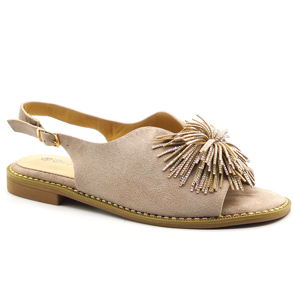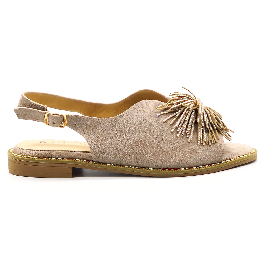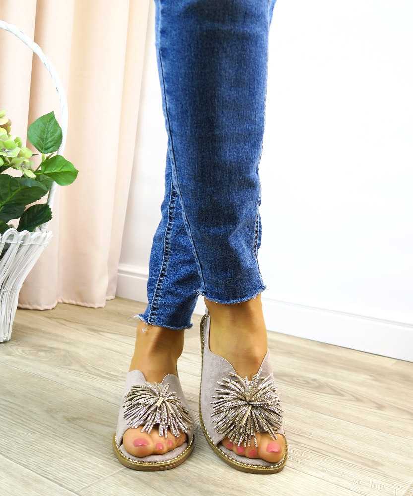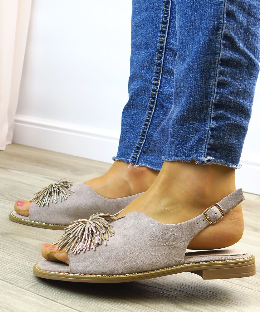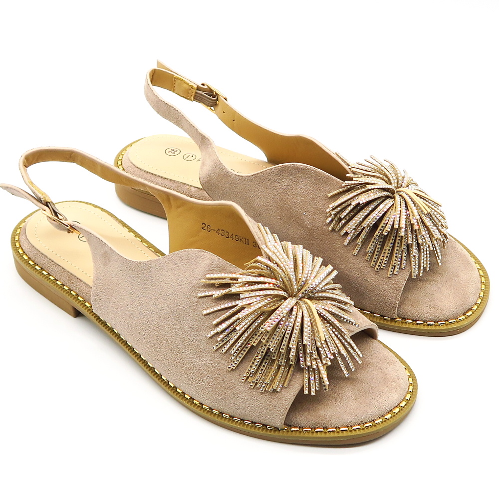 Elegantné dámske sandále v béžovom prevedení, ktoré pôsobí luxusne a slávnostne. Model má otvorenú špičku s výraznou ozdobnou aplikáciou z kamienkov, ktorá vytvára efektný a originálny detail. Otvorená päta s ramienkom zabezpečuje pohodlné obúvanie a dobré držanie nohy. Sandále sú na stabilnom nízkom podpätku, vďaka čomu sú vhodné aj na dlhšie nosenie. Ideálna voľba na svadby, oslavy, spoločenské udalosti alebo ako elegantný doplnok k letným šatám.