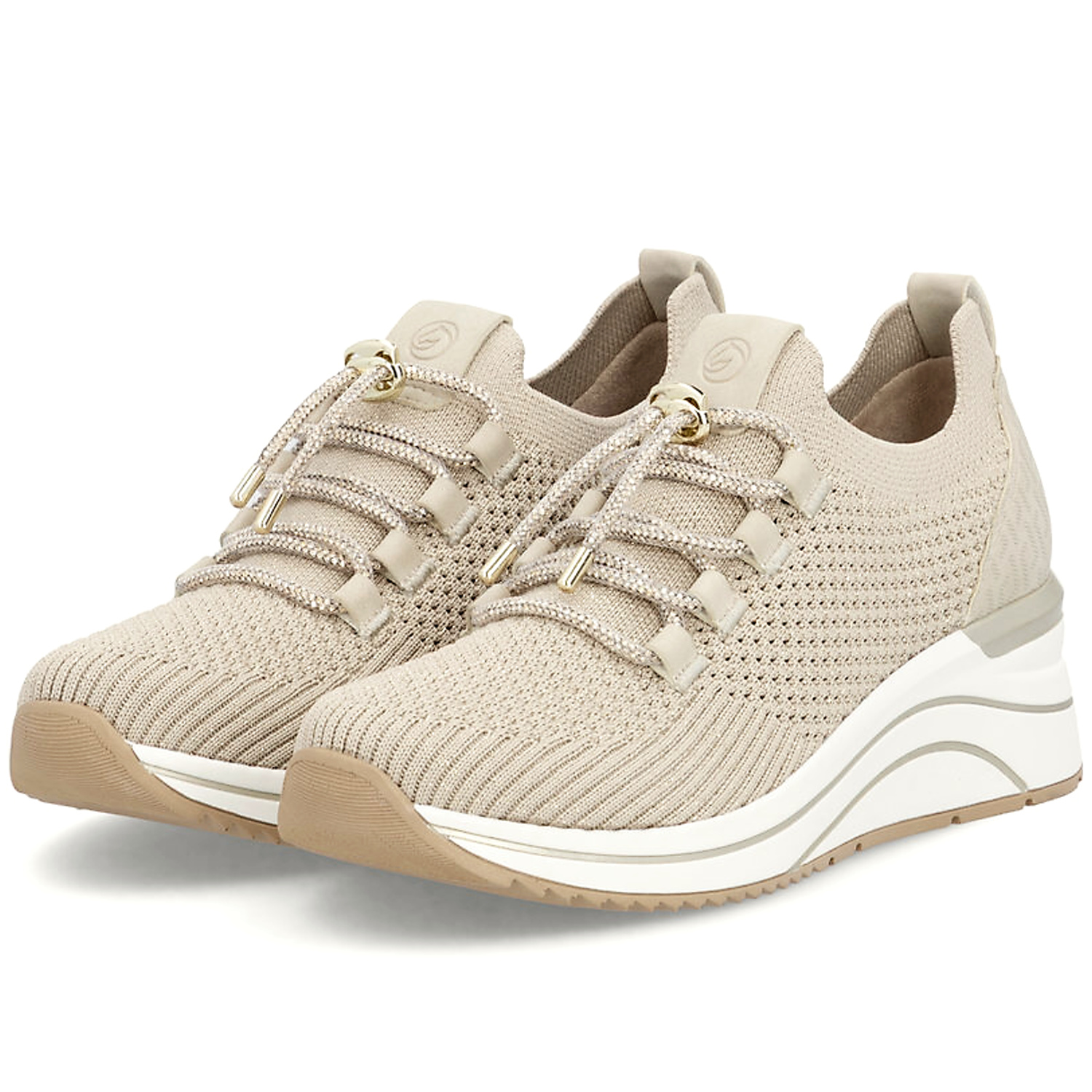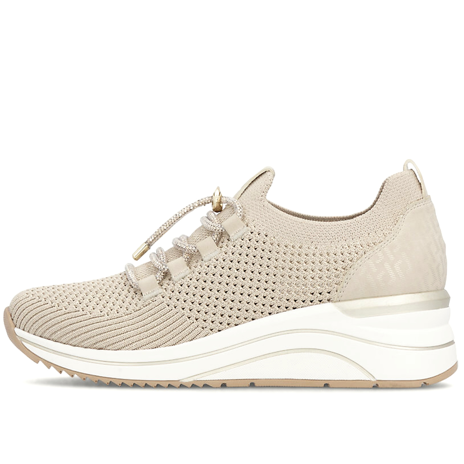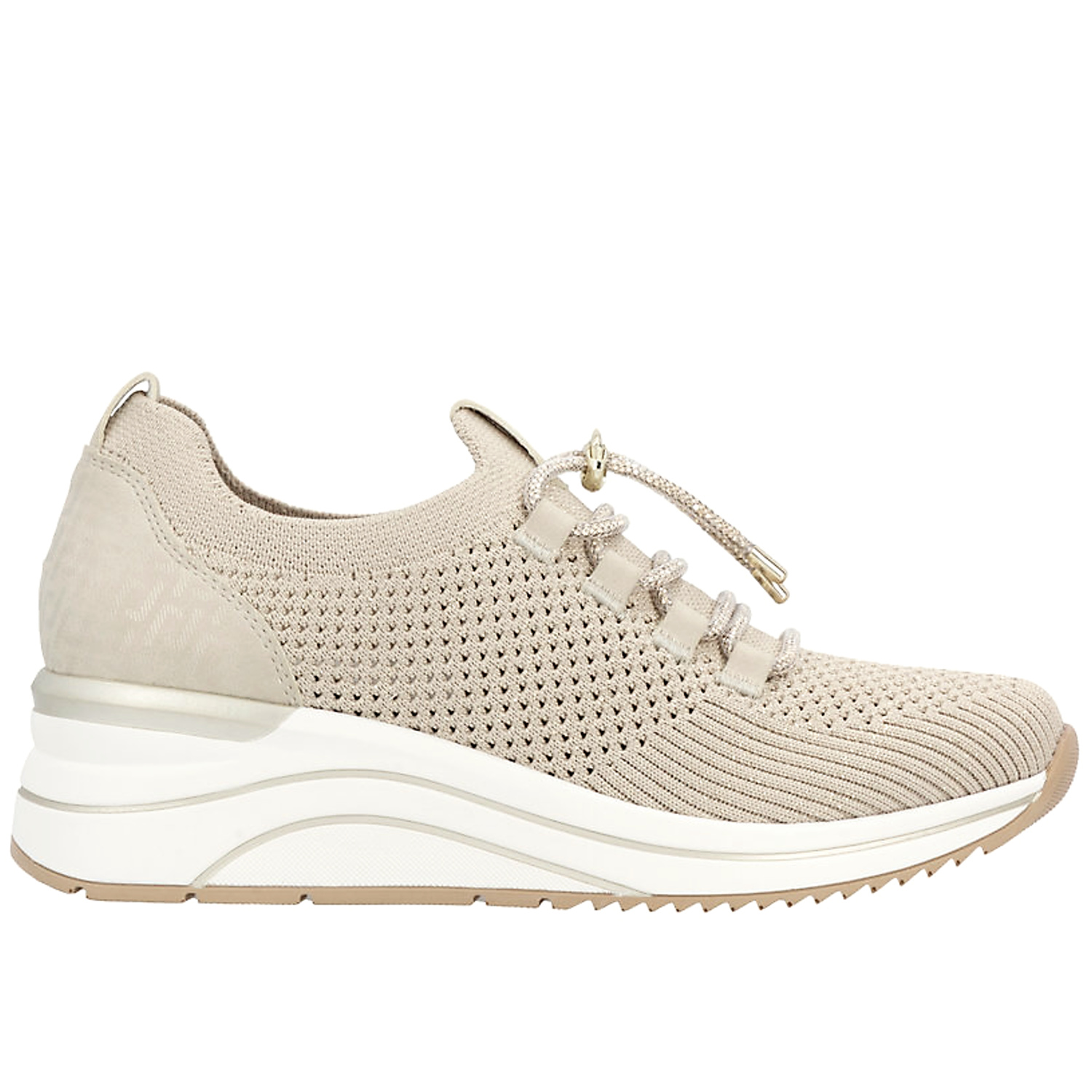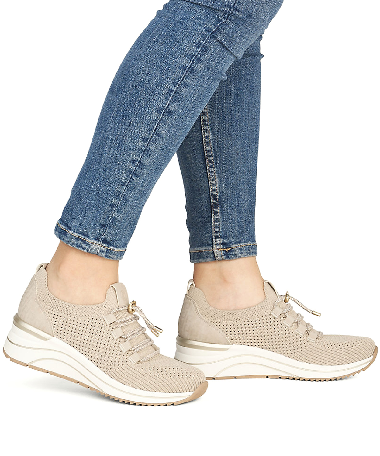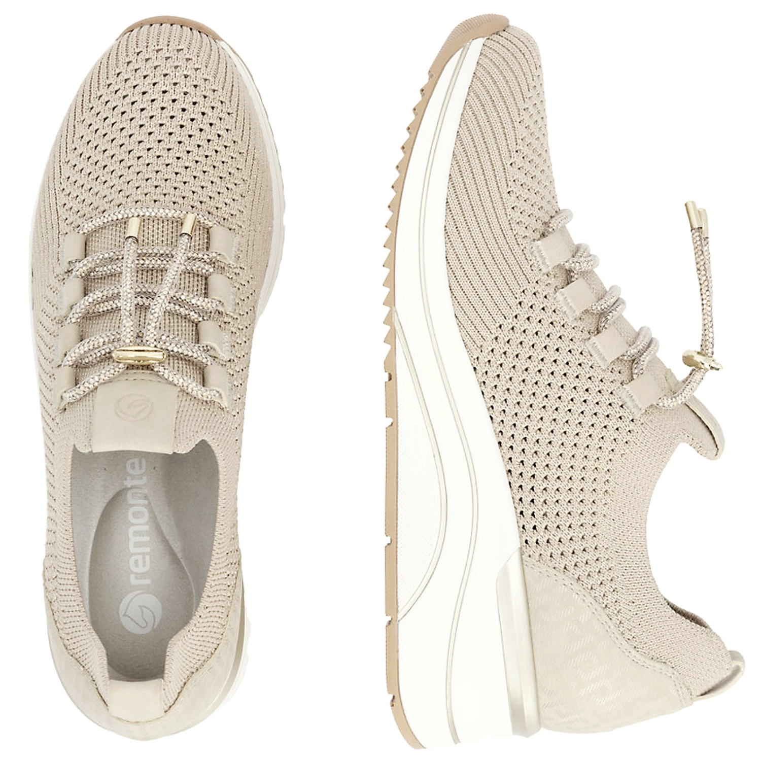 Moderné dámske tenisky značky REMONTE spájajú štýlový vzhľad s maximálnym pohodlím. Model v béžovej farbe s trblietavým odleskom. Ľahký a priedušný textilný zvršok s jemnou perforáciou zabezpečuje optimálnu cirkuláciu vzduchu, vďaka čomu sú ideálne na teplejšie dni. Štrasové šnurovanie s ozdobným detailom umožňuje jednoduché prispôsobenie nohe. Mäkká, vyberateľná stielka spolu s flexibilnou a tlmiacou podrážkou poskytujú komfort pri celodennom nosení.