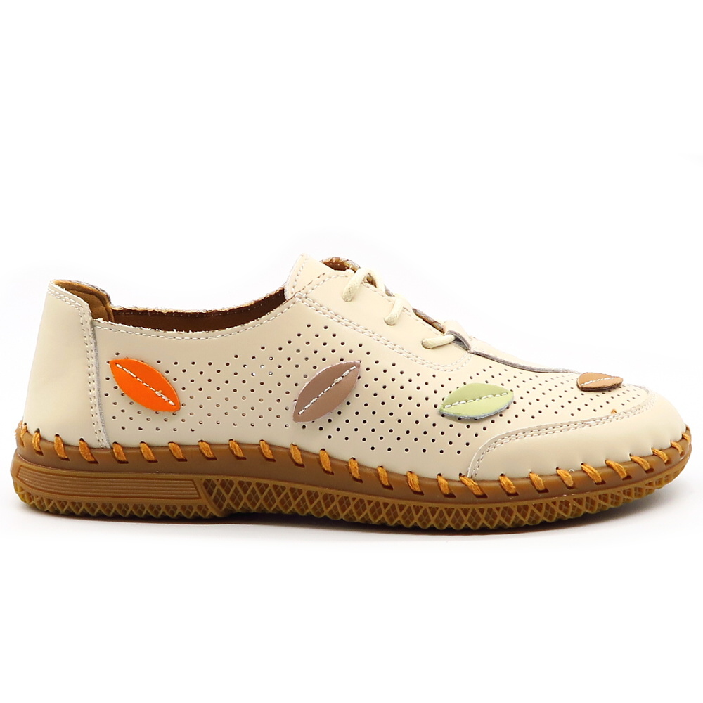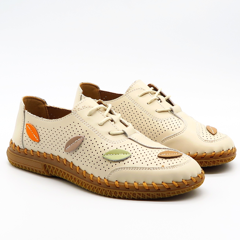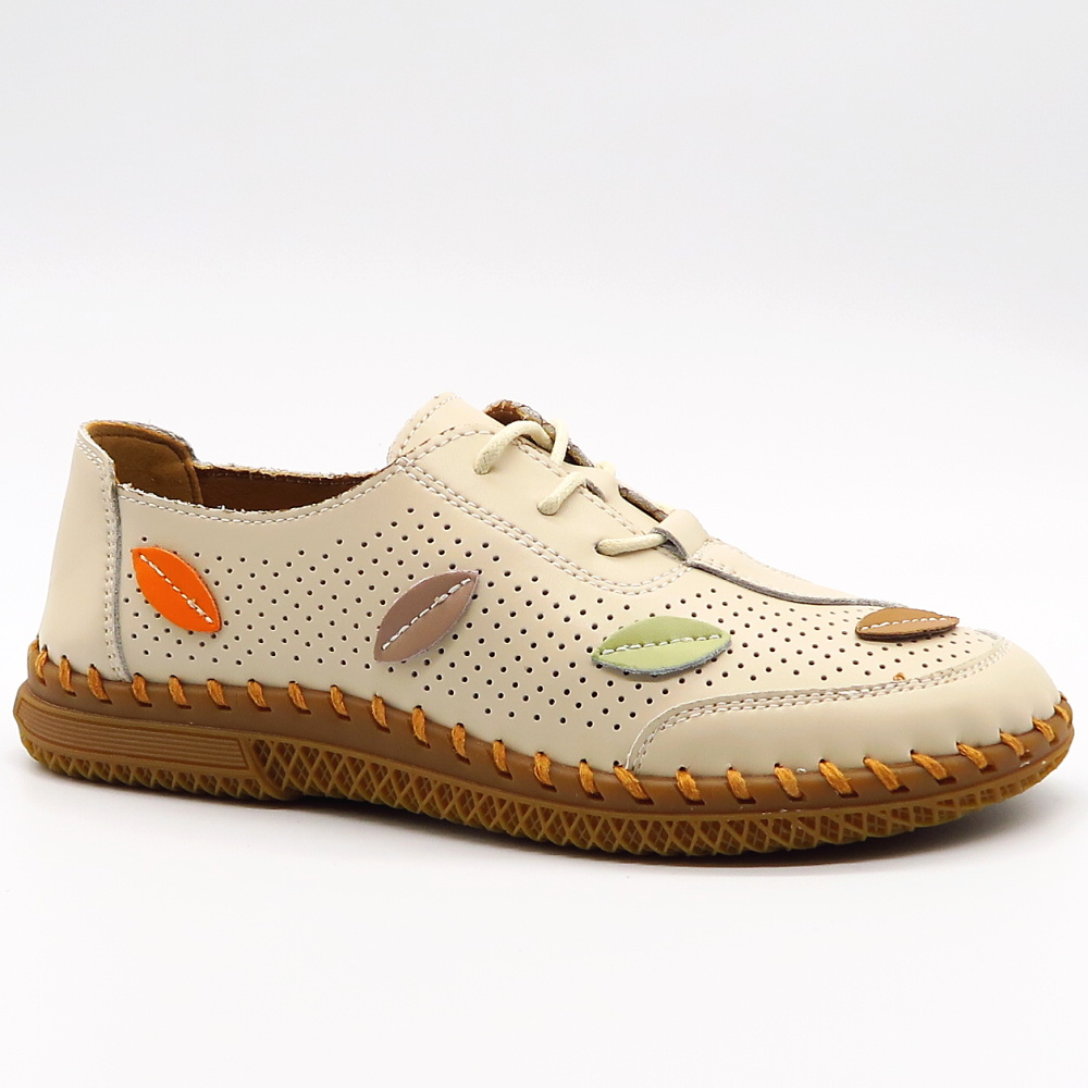 Štýlové a zároveň mimoriadne pohodlné kožené topánky v jemnej béžovej farbe. Perforovaný zvršok zabezpečuje výbornú priedušnosť, vďaka čomu sú ideálne aj na teplejšie dni. Mäkký vnútorný materiál a ľahká konštrukcia poskytujú maximálny komfort pri celodennom nosení. Jedinečný dizajn dopĺňa farebný motív listov na zvyšku topánka, ktorý dodáva obuvi svieži a originálny vzhľad.