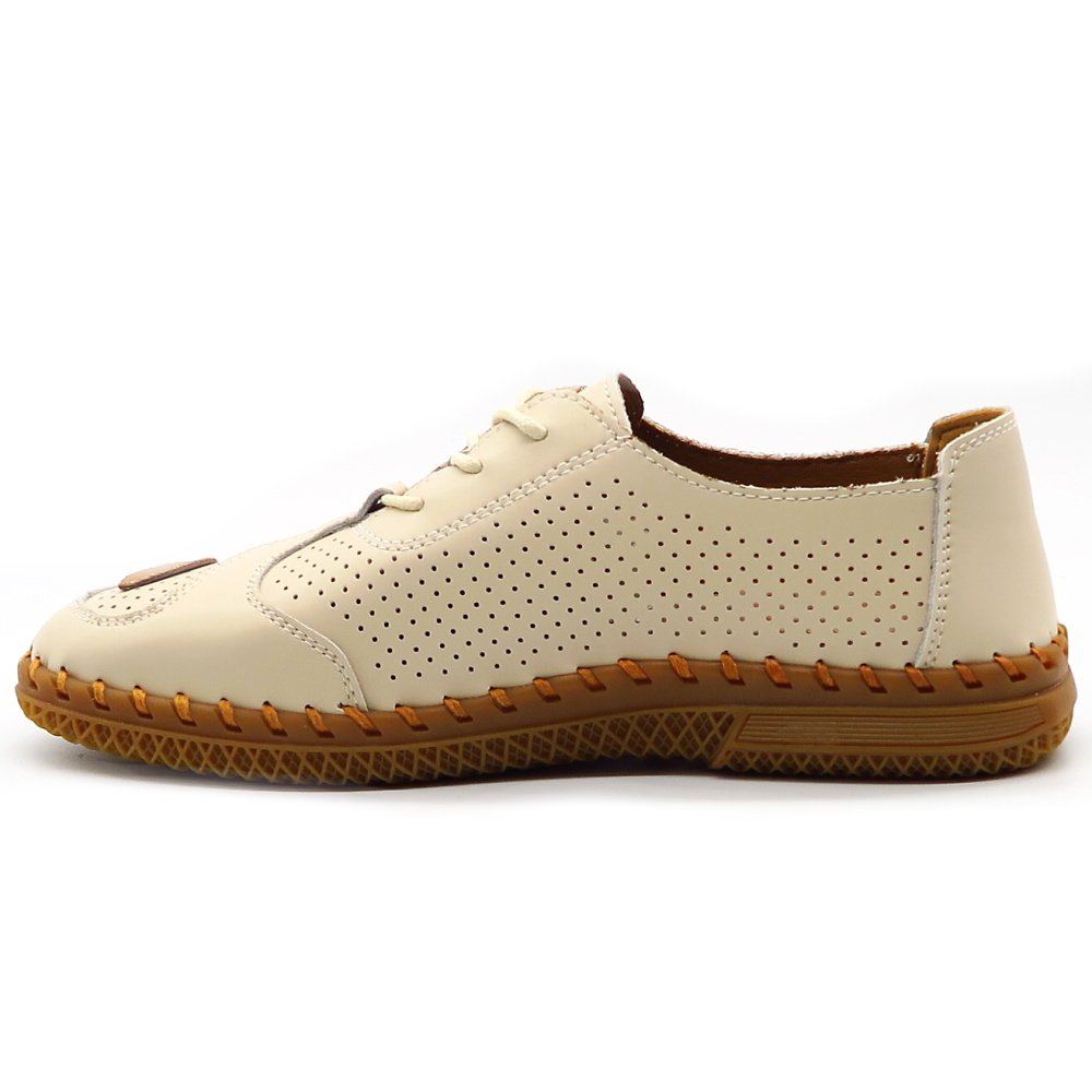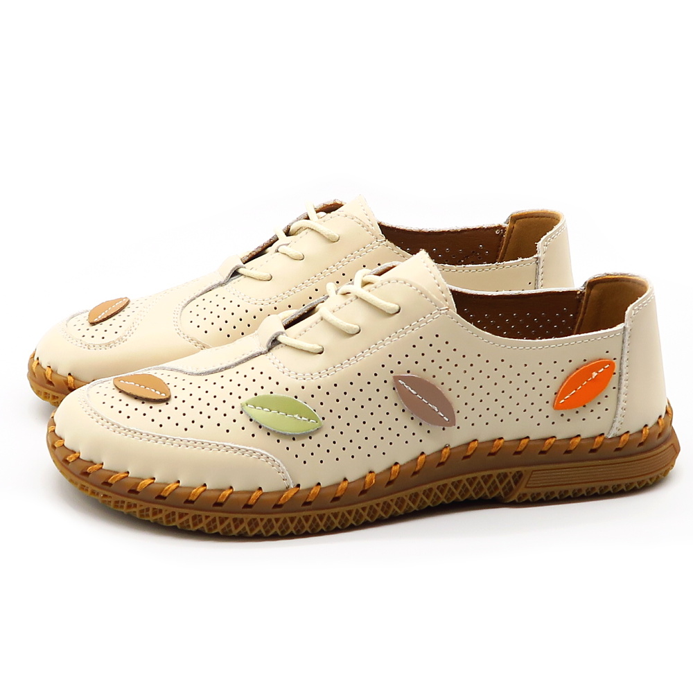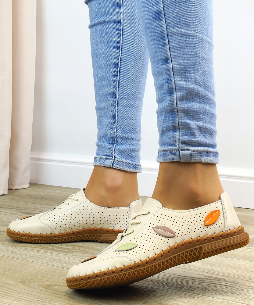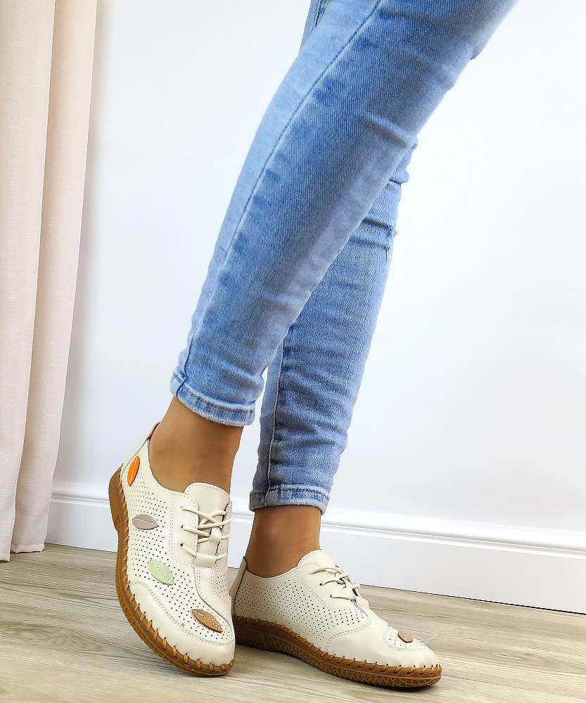 Štýlové a zároveň mimoriadne pohodlné kožené topánky v jemnej béžovej farbe. Perforovaný zvršok zabezpečuje výbornú priedušnosť, vďaka čomu sú ideálne aj na teplejšie dni. Mäkký vnútorný materiál a ľahká konštrukcia poskytujú maximálny komfort pri celodennom nosení. Jedinečný dizajn dopĺňa farebný motív listov na zvyšku topánka, ktorý dodáva obuvi svieži a originálny vzhľad.