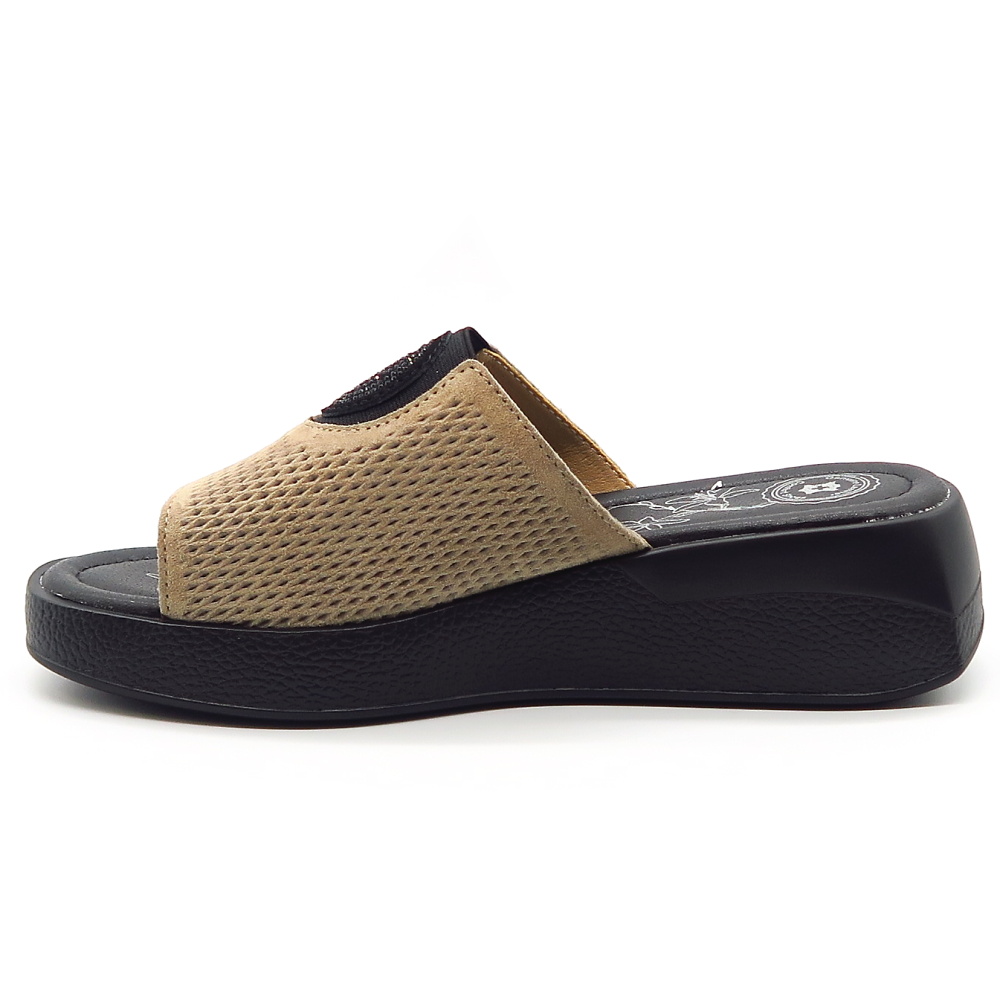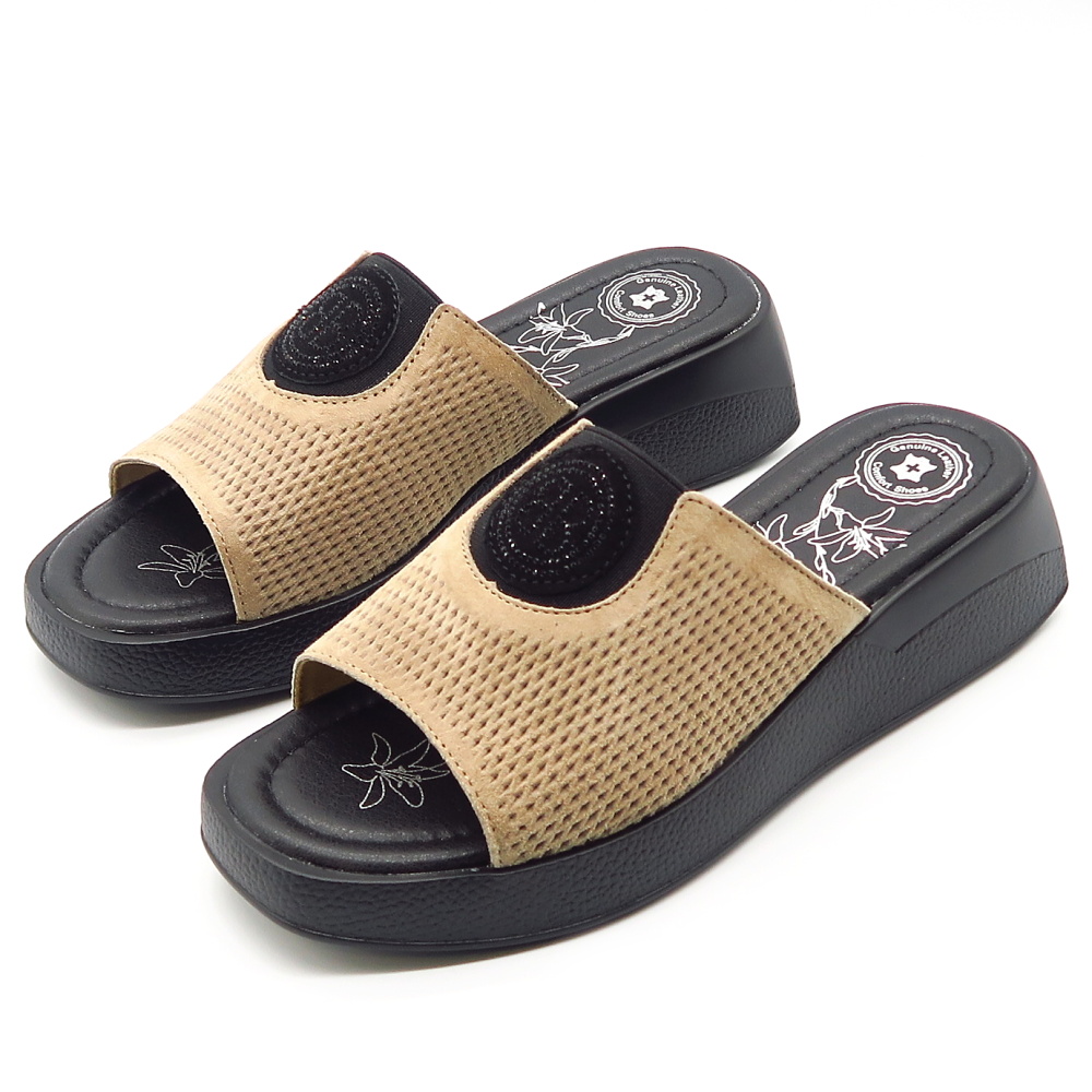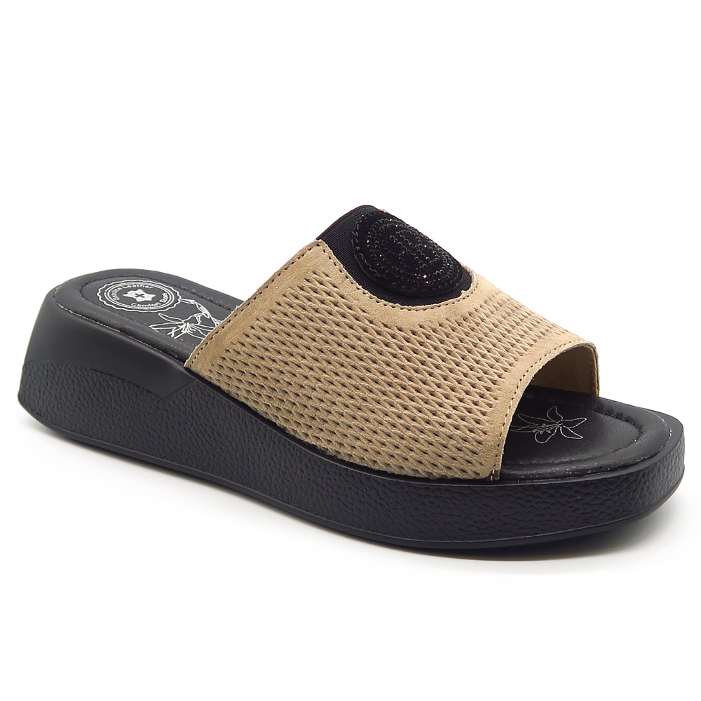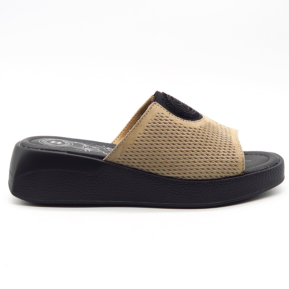 Pohodlné dámske vsuvky, ktoré si zamilujete na prvé obutie. Neutrálna béžová farba pôsobí moderne a zároveň ľahko zapadne do každodenného šatníka. Mäkký, priedušný zvršok s jemnou štruktúrou sa prispôsobí chodidlu a zabezpečí komfort počas celého dňa. Dominantným prvkom je štýlová aplikácia na priehlavku, ktorá dodáva jednoduchému dizajnu zaujímavý akcent.