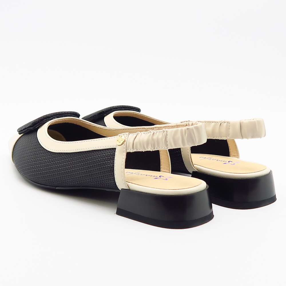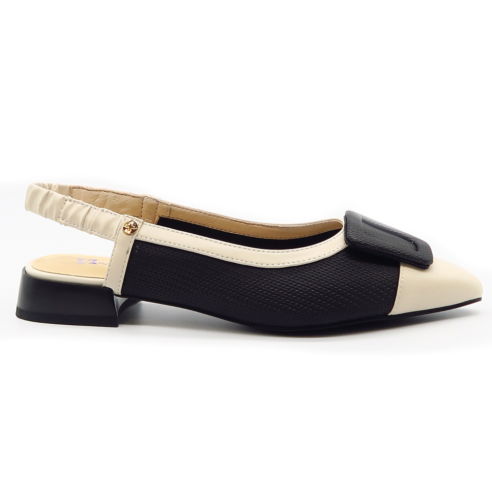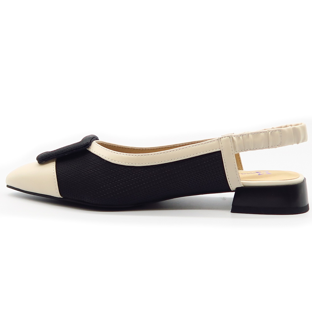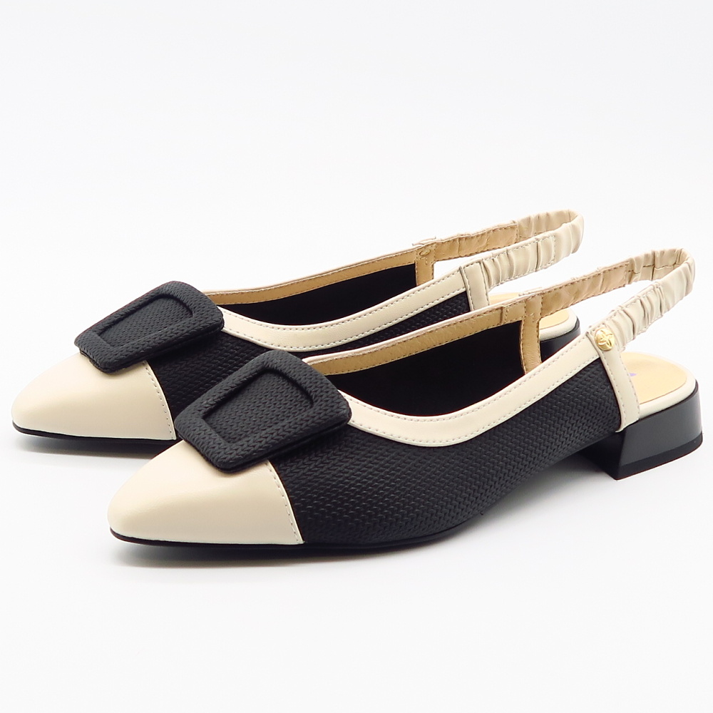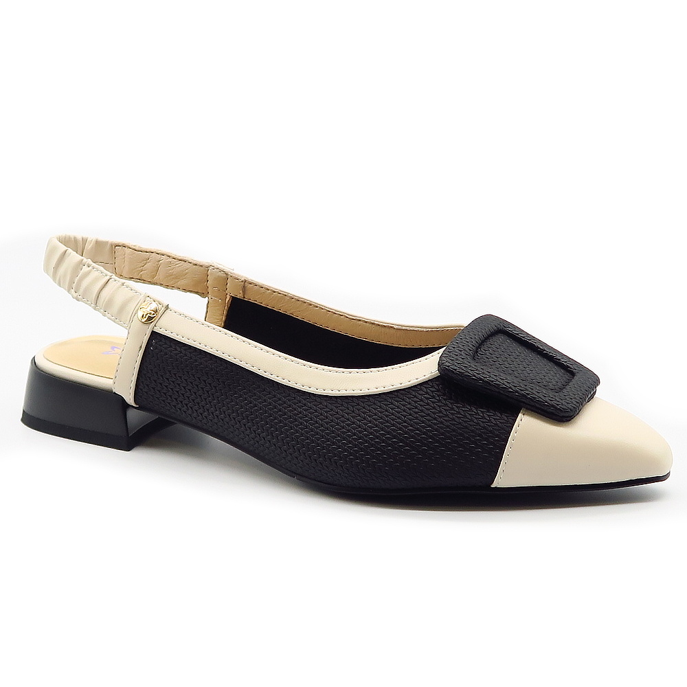 Elegantné dámske lodičky značky MACIEJKA, ktoré zaujmú originálnym dizajnom a maximálnym pohodlím. Model v béžovo-čiernej kombinácii spájajú hladkú kožu s trendy pletenou textúrou, čím vytvárajú moderný a zároveň nadčasový vzhľad. Špicatá špička opticky zoštíhľuje nohu a dodáva modelu eleganciu, zatiaľ čo pružný ramienok na päte zabezpečuje pohodlné obúvanie a perfektné prispôsobenie. Výrazným prvkom je štýlová aplikácia na priehlavku.