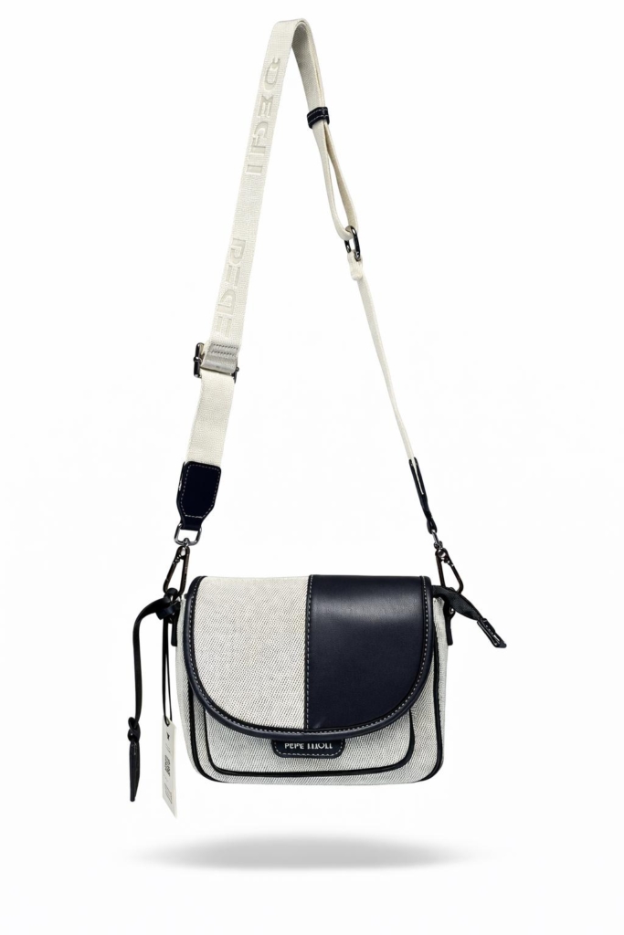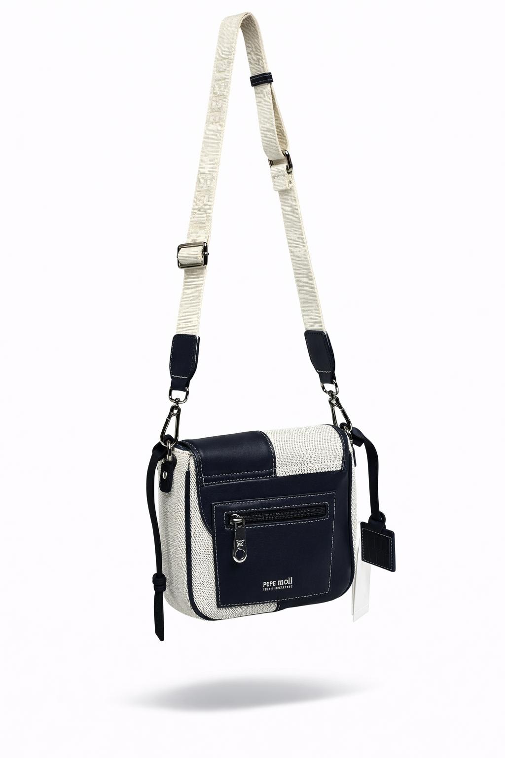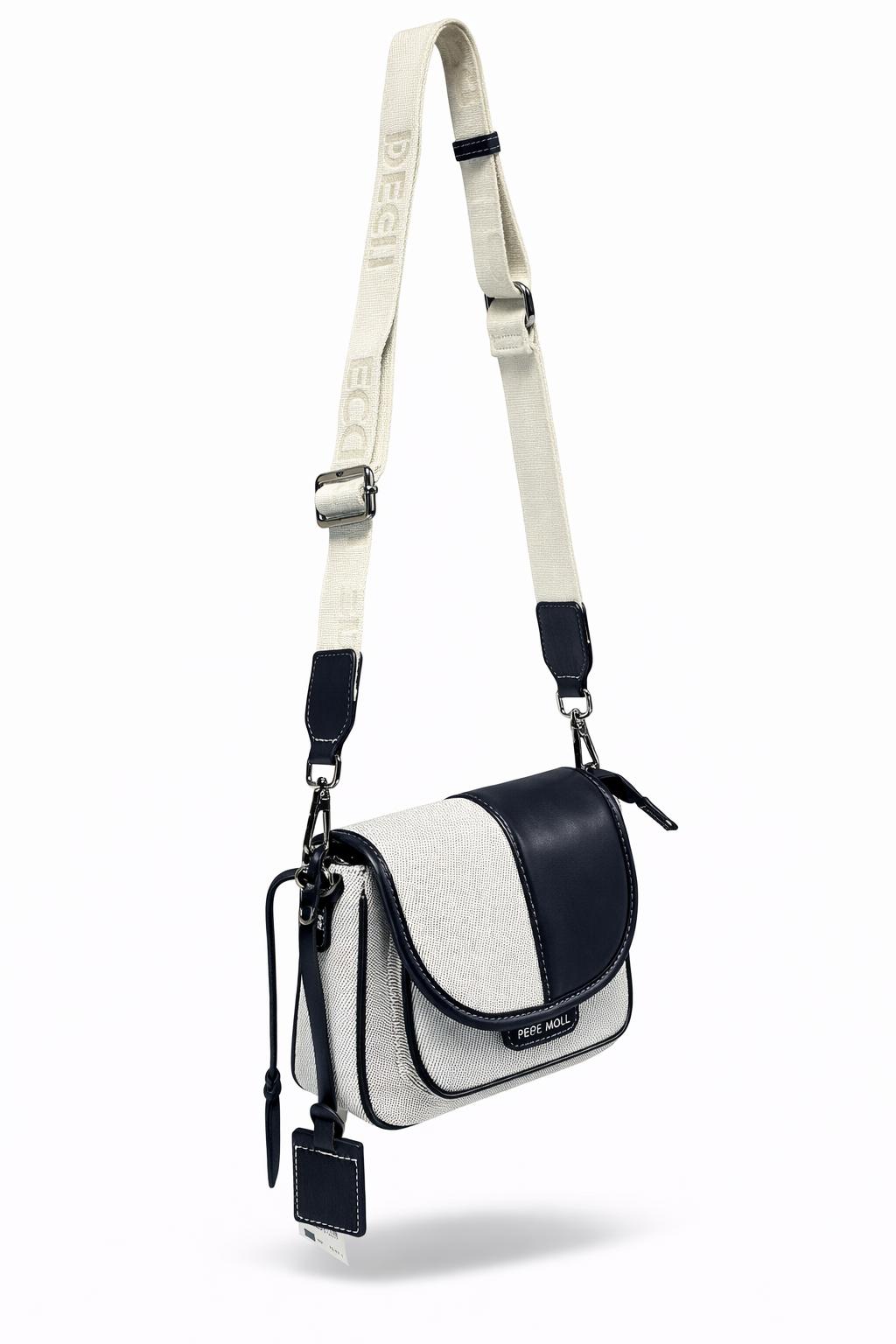 Kvalitná kabelka od značky PEPE MOLL. Model v béžovo modrej farbe. Zvršok vyrobený z ekologickej kože a textilu.