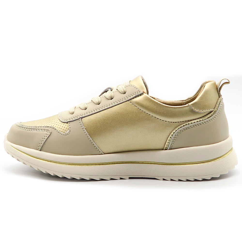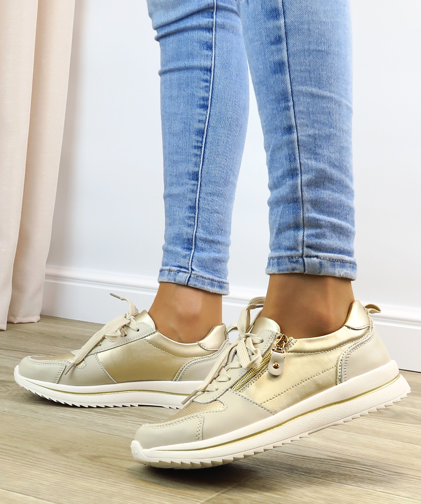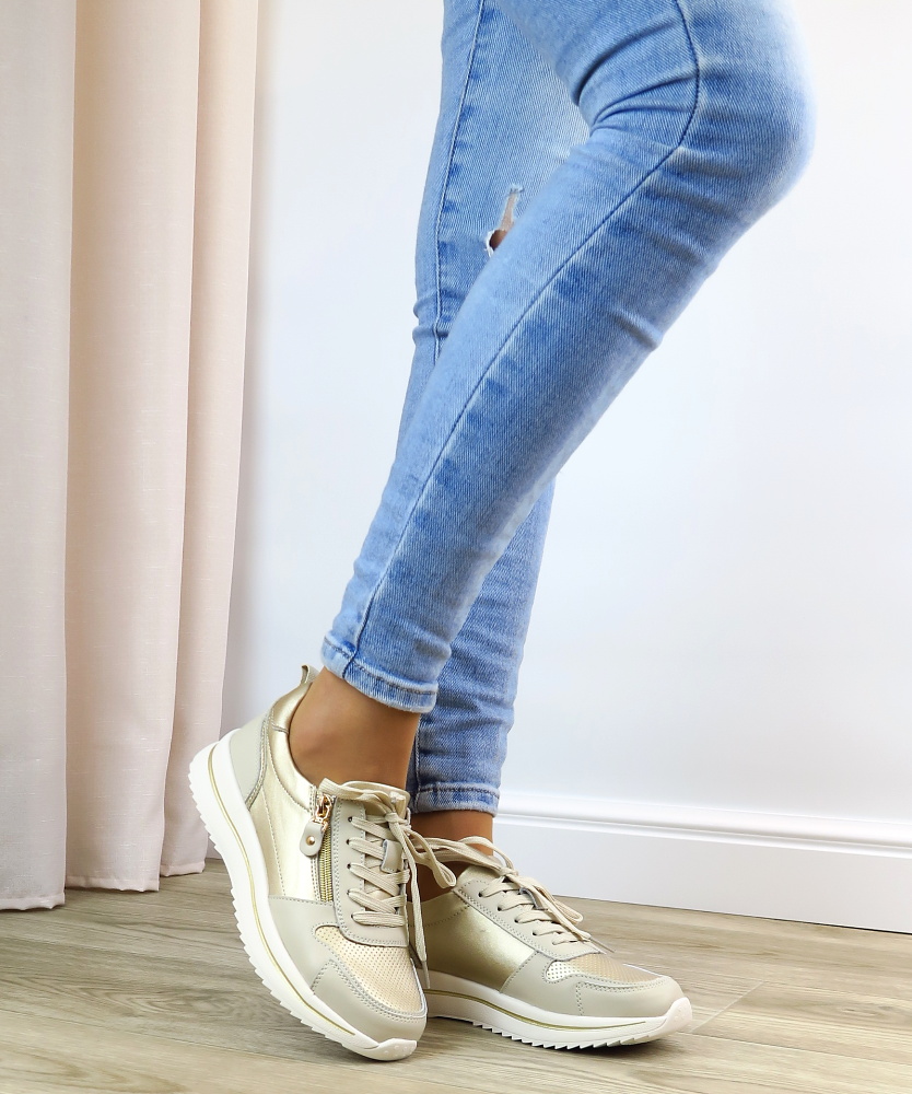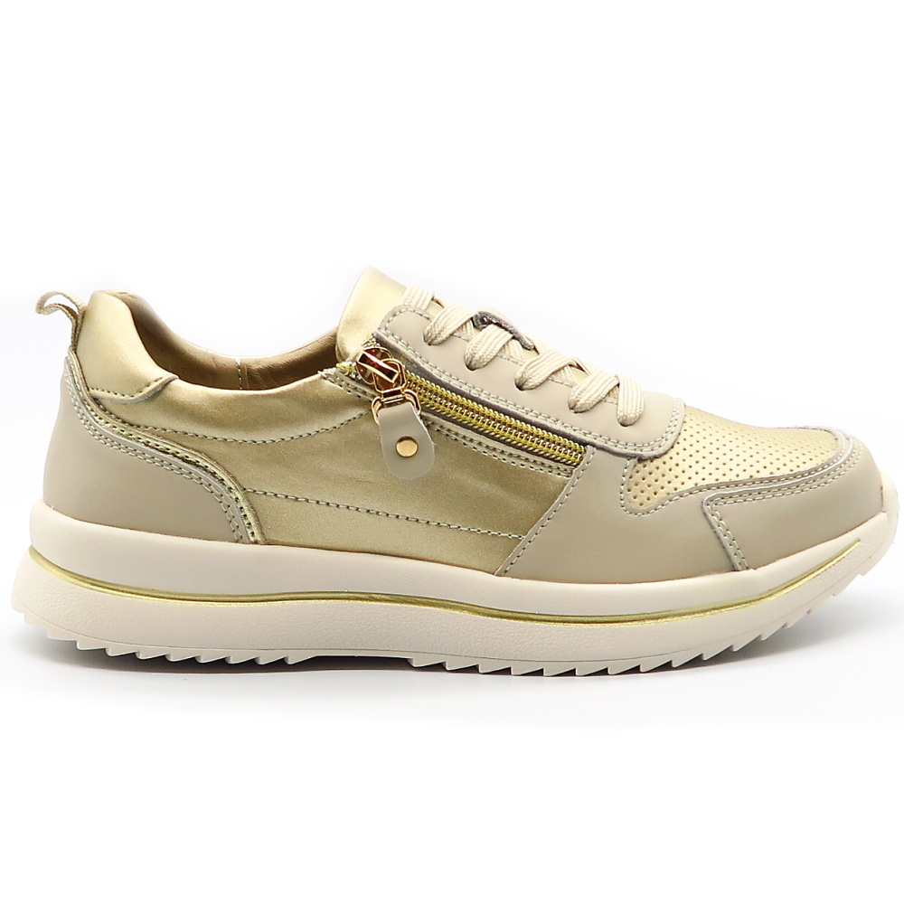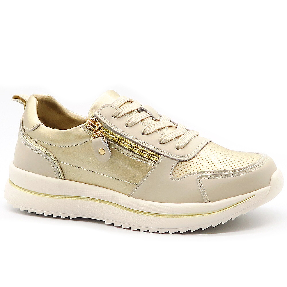 Dámske trendové tenisky značky EVENTO. Model v béžovo -zlatom odtieni. Zvršok vyrobený z prírodnej kože. Ľahko sa kombinujú so športovým aj elegantnejším outfitom – od riflí až po šaty. Praktický bočný zips umožňuje rýchle aj pohodlné obúvanie bez nutnosti neustáleho viazania šnúrok. Mäkká vnútorná výstelka poskytuje komfort aj pri celodennom nosení, zatiaľ čo pevný podrážka zabezpečuje stabilitu a istý krok.