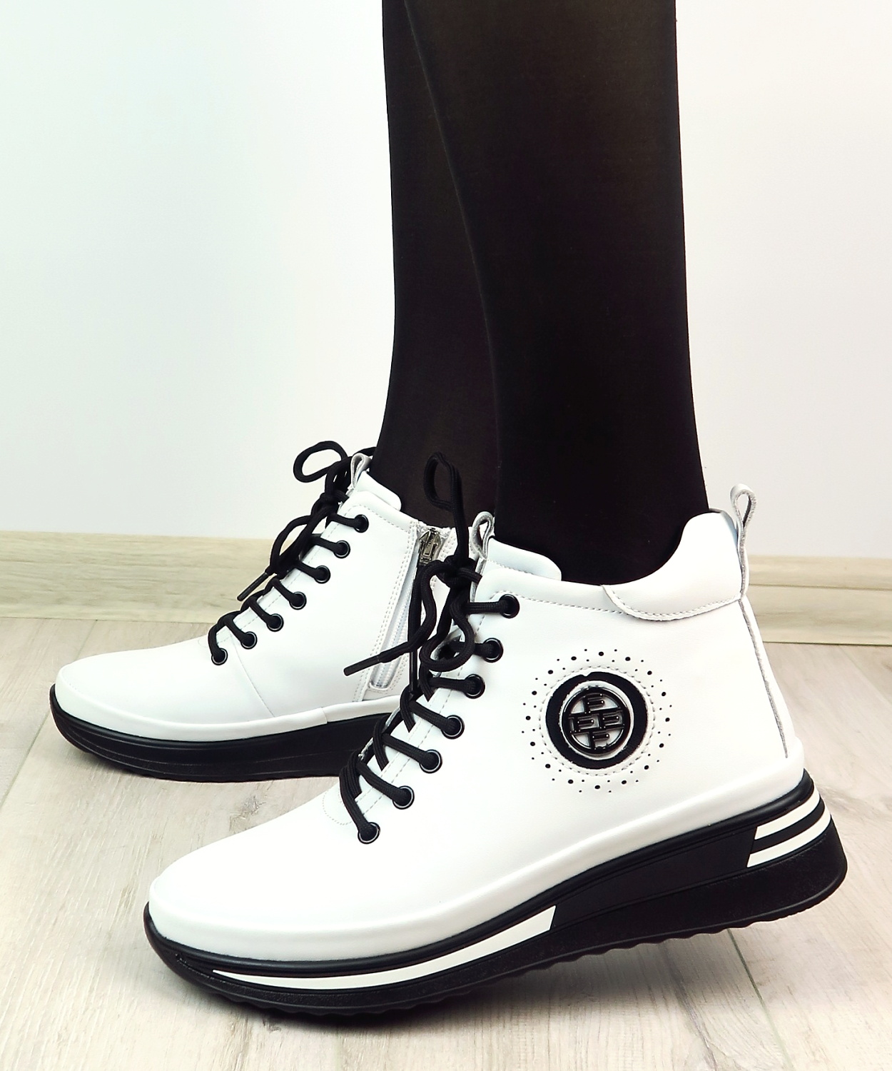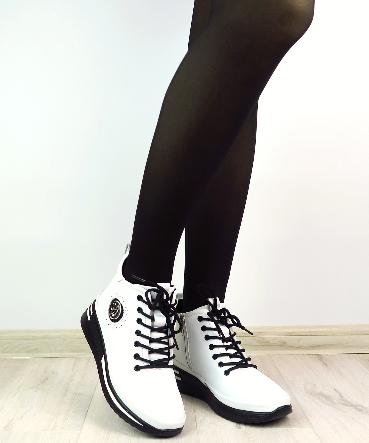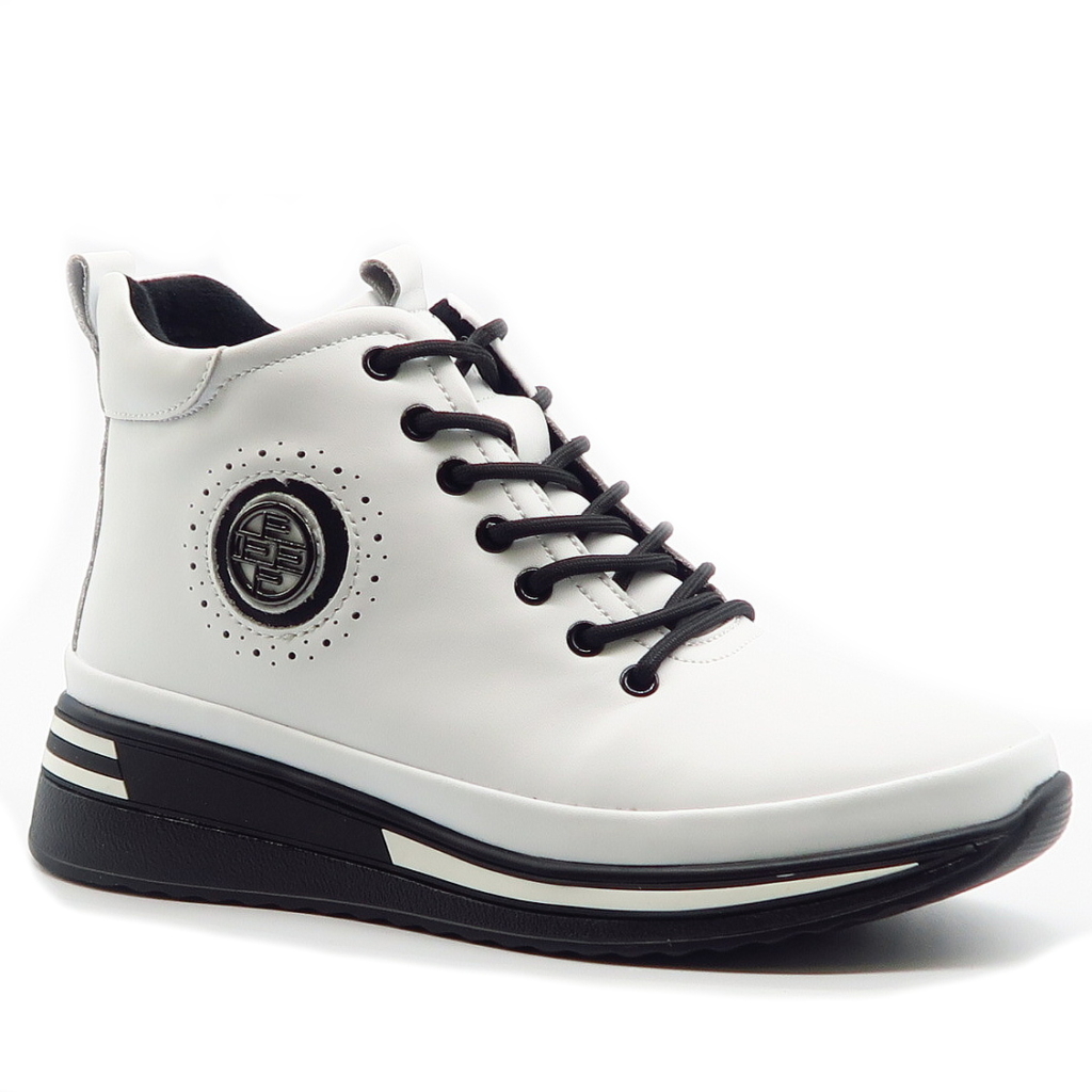 Trendové členkové topánky značky FILIPPO. Model v bielej farbe s kontrastnými čiernymi detailmi. Zvršok tvorí prírodná koža. Na boku sa nachádza ozdobné logo v kruhovom dizajne. Topánky majú zvýšenú podrážku, ktorá poskytuje pohodlné nosenie. Moderný kúsok , ktorý na nohe pekne vynikne.