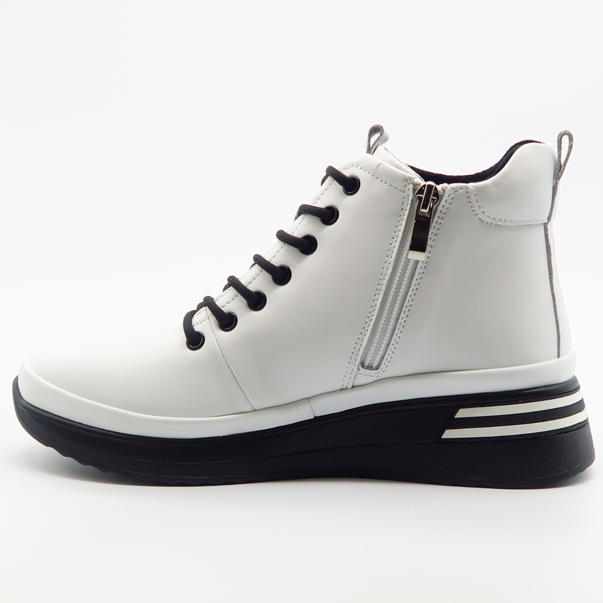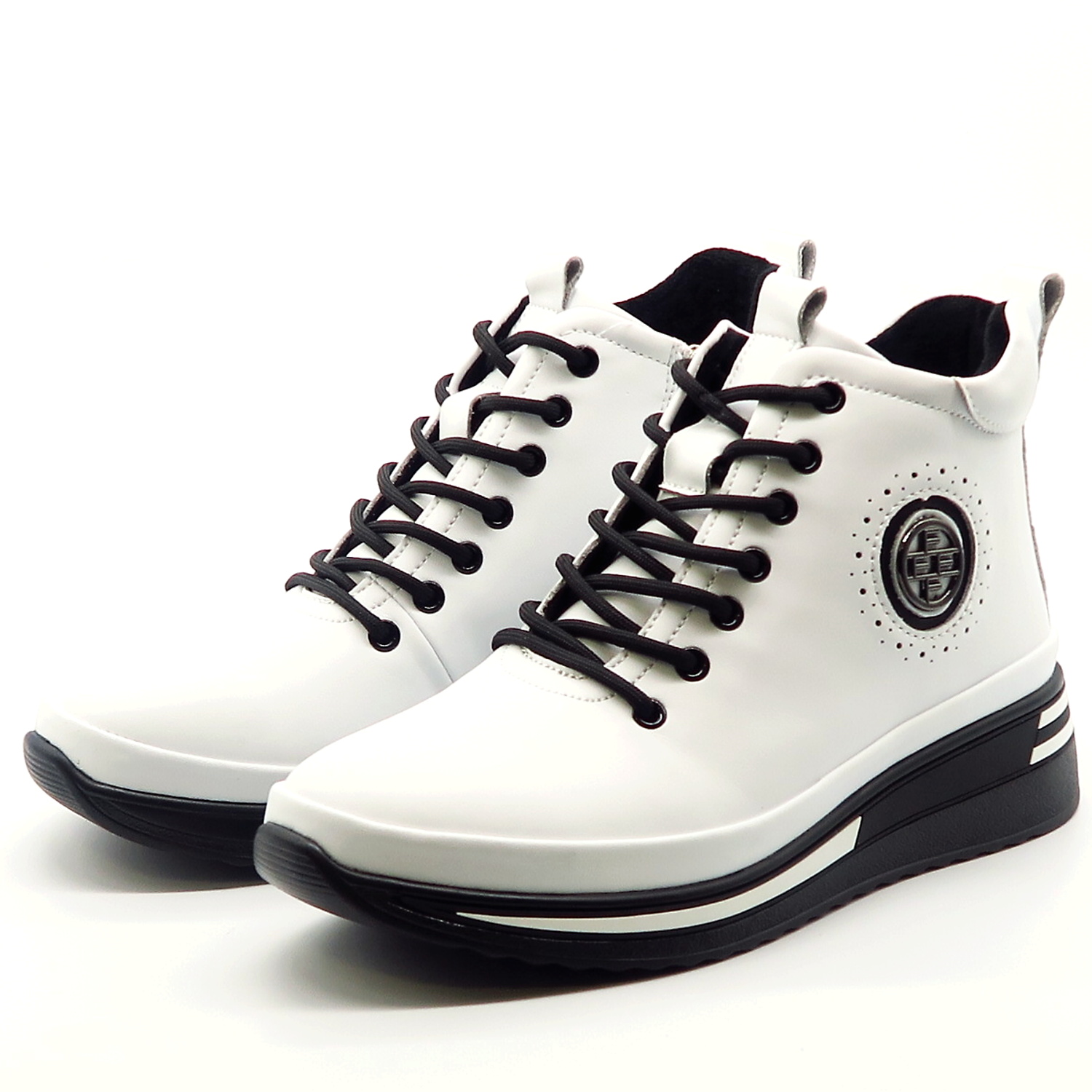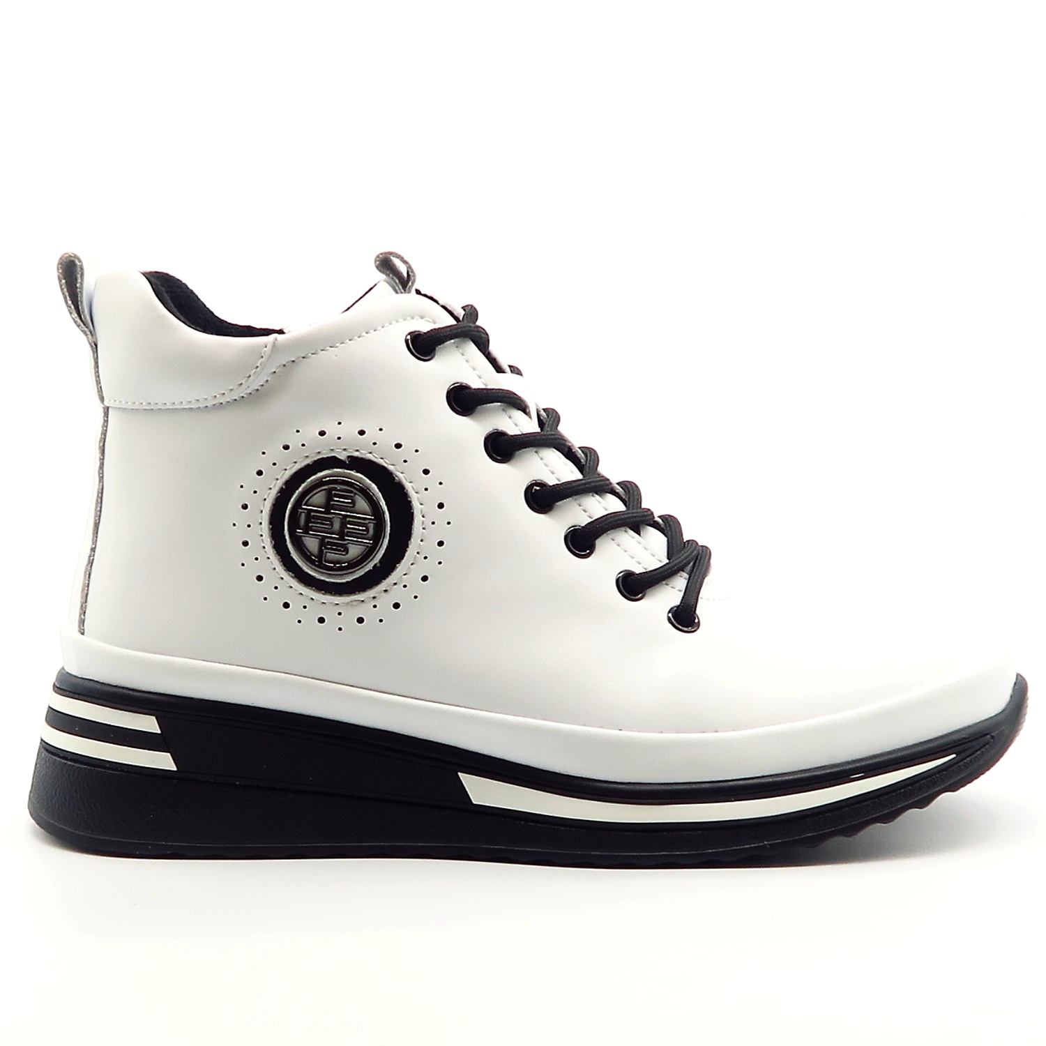 Trendové členkové topánky značky FILIPPO. Model v bielej farbe s kontrastnými čiernymi detailmi. Zvršok tvorí prírodná koža. Na boku sa nachádza ozdobné logo v kruhovom dizajne. Topánky majú zvýšenú podrážku, ktorá poskytuje pohodlné nosenie. Moderný kúsok , ktorý na nohe pekne vynikne.