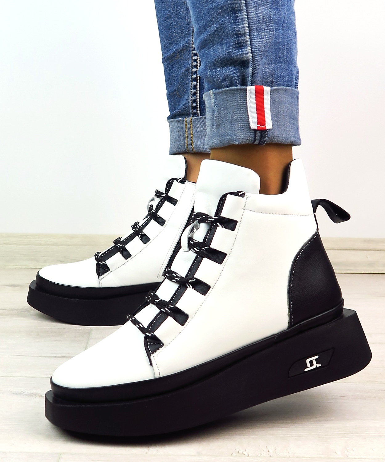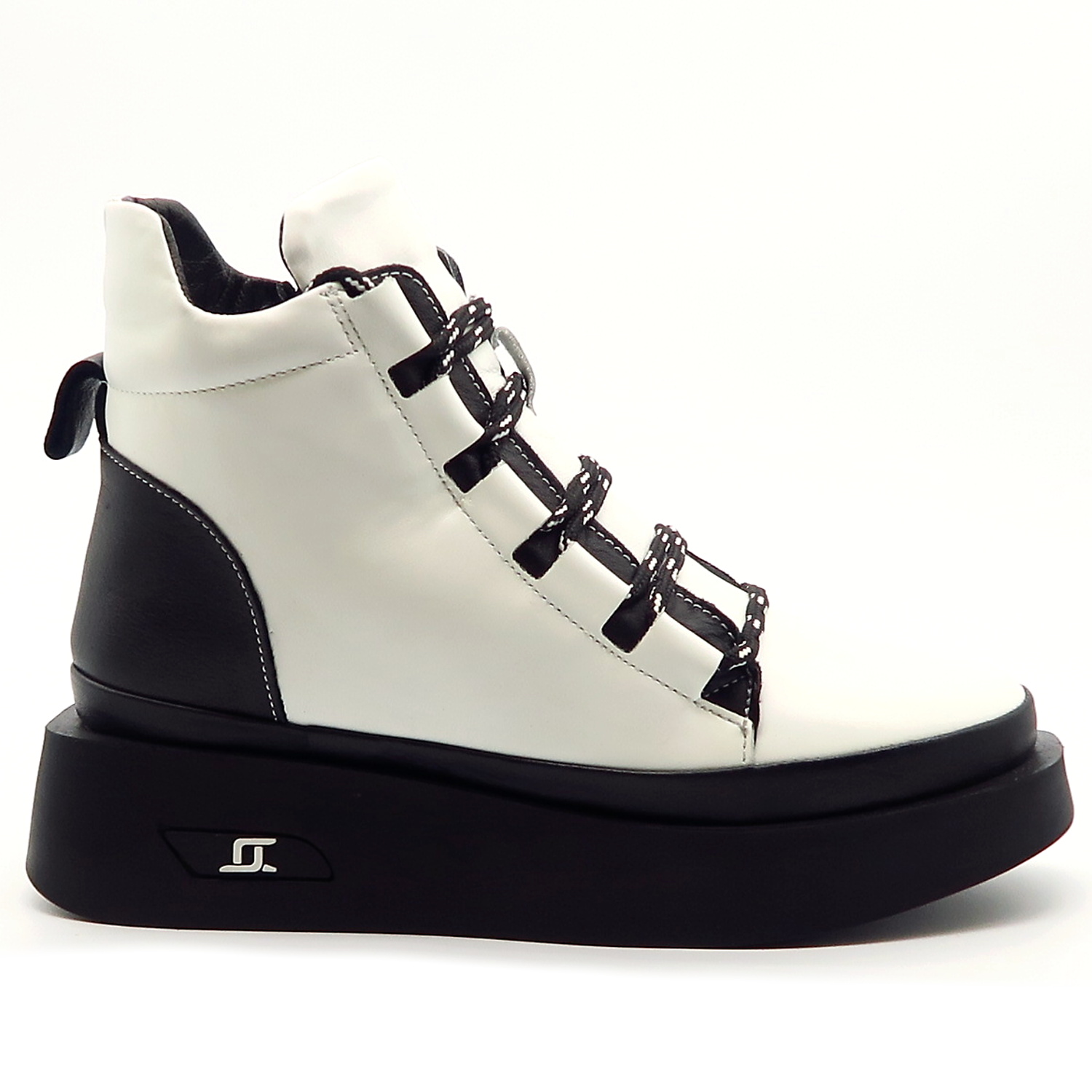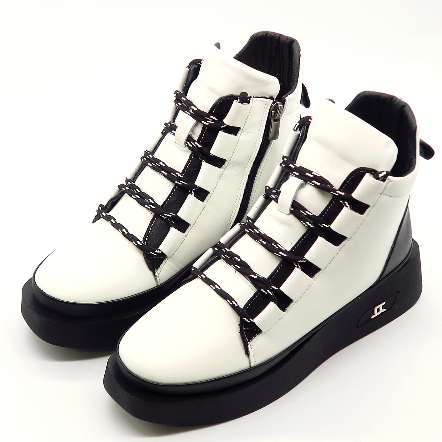 Dámske topánky značky KLOP. Tento model prináša moderný vzhľad v kontrastnej čierno bielej kombinácii, ktorá pôsobí štýlovo a nadčasovo. Zvršok z prírodnej kože doplnený výrazným šnurovaním s čierno-bielymi šnúrkami, ktoré pôsobia originálne a športovo. Topánky sú extra ľahké a mäkké, vďaka čomu sa budete cítiť komfortne počas celého dňa. Zateplené sú kožušinou.