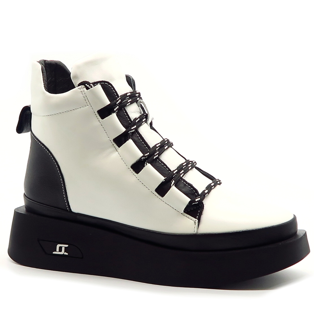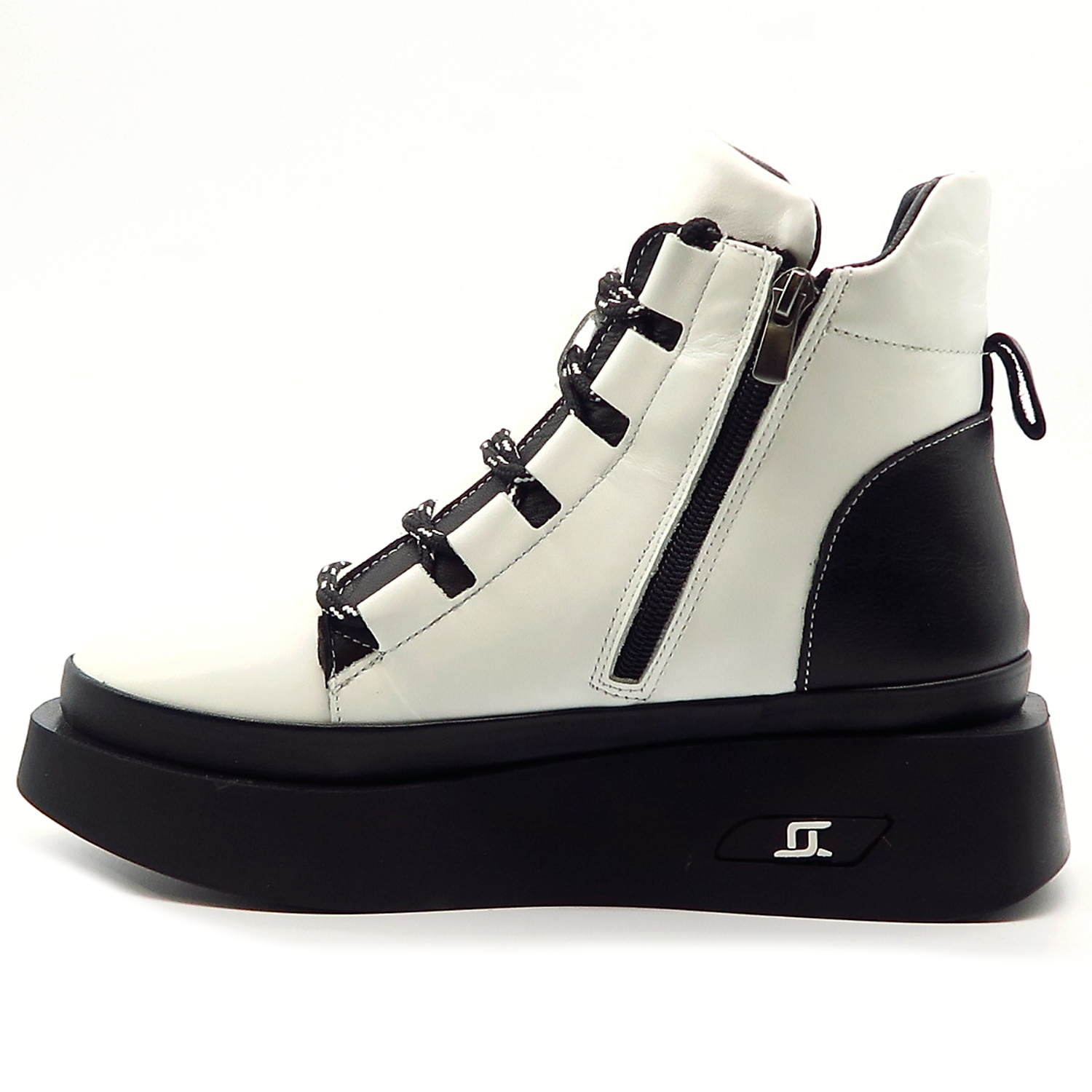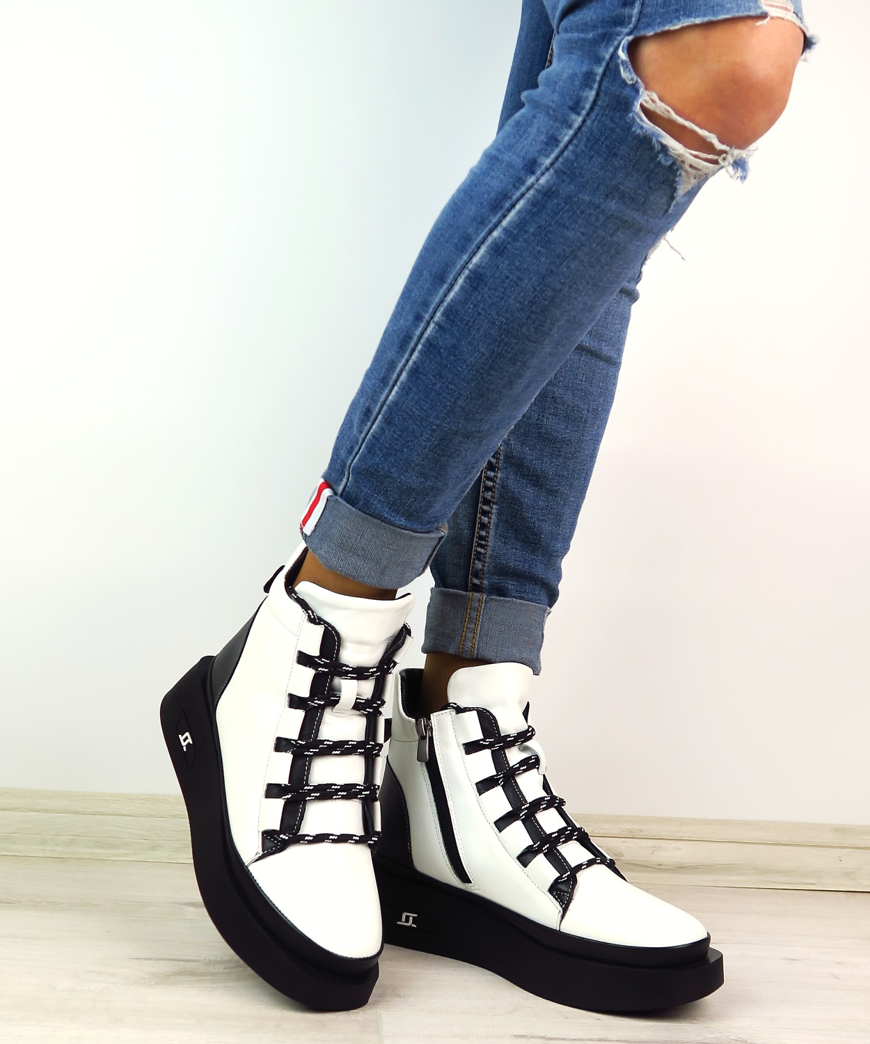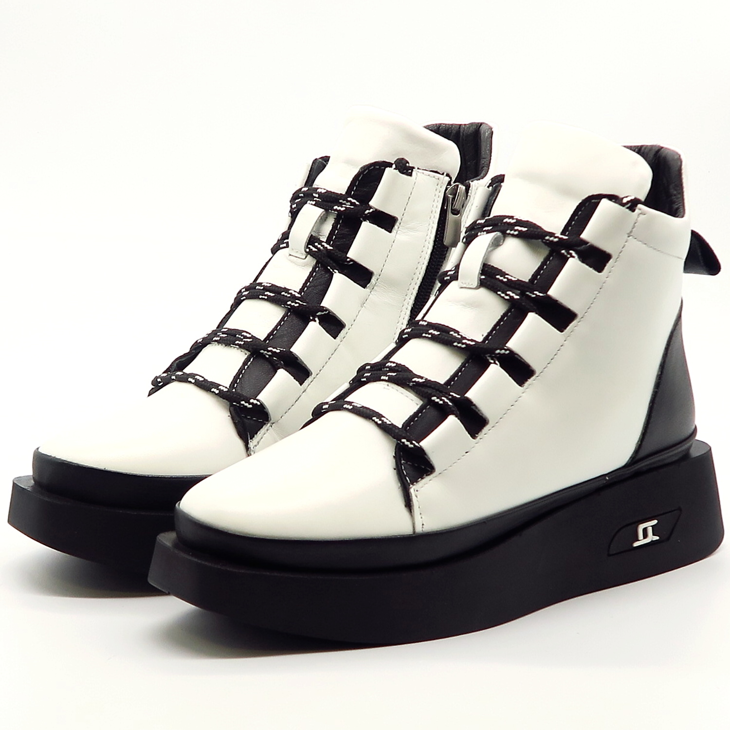 Dámske topánky značky KLOP. Tento model prináša moderný vzhľad v kontrastnej čierno bielej kombinácii, ktorá pôsobí štýlovo a nadčasovo. Zvršok z prírodnej kože doplnený výrazným šnurovaním s čierno-bielymi šnúrkami, ktoré pôsobia originálne a športovo. Topánky sú extra ľahké a mäkké, vďaka čomu sa budete cítiť komfortne počas celého dňa. Zateplené sú kožušinou.