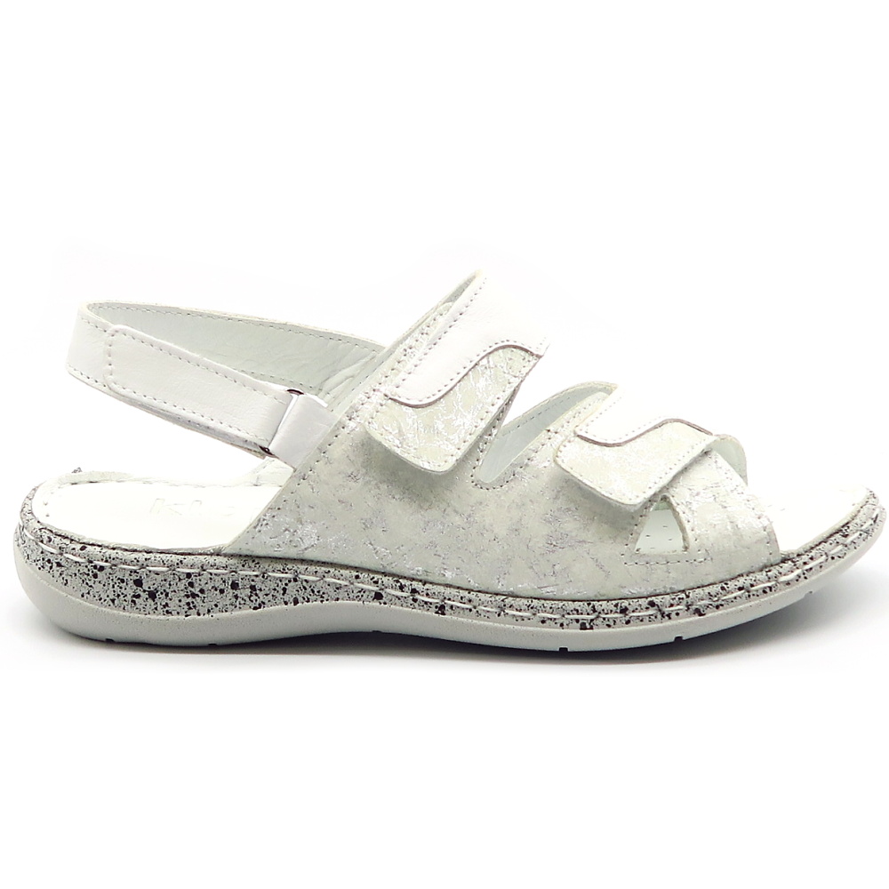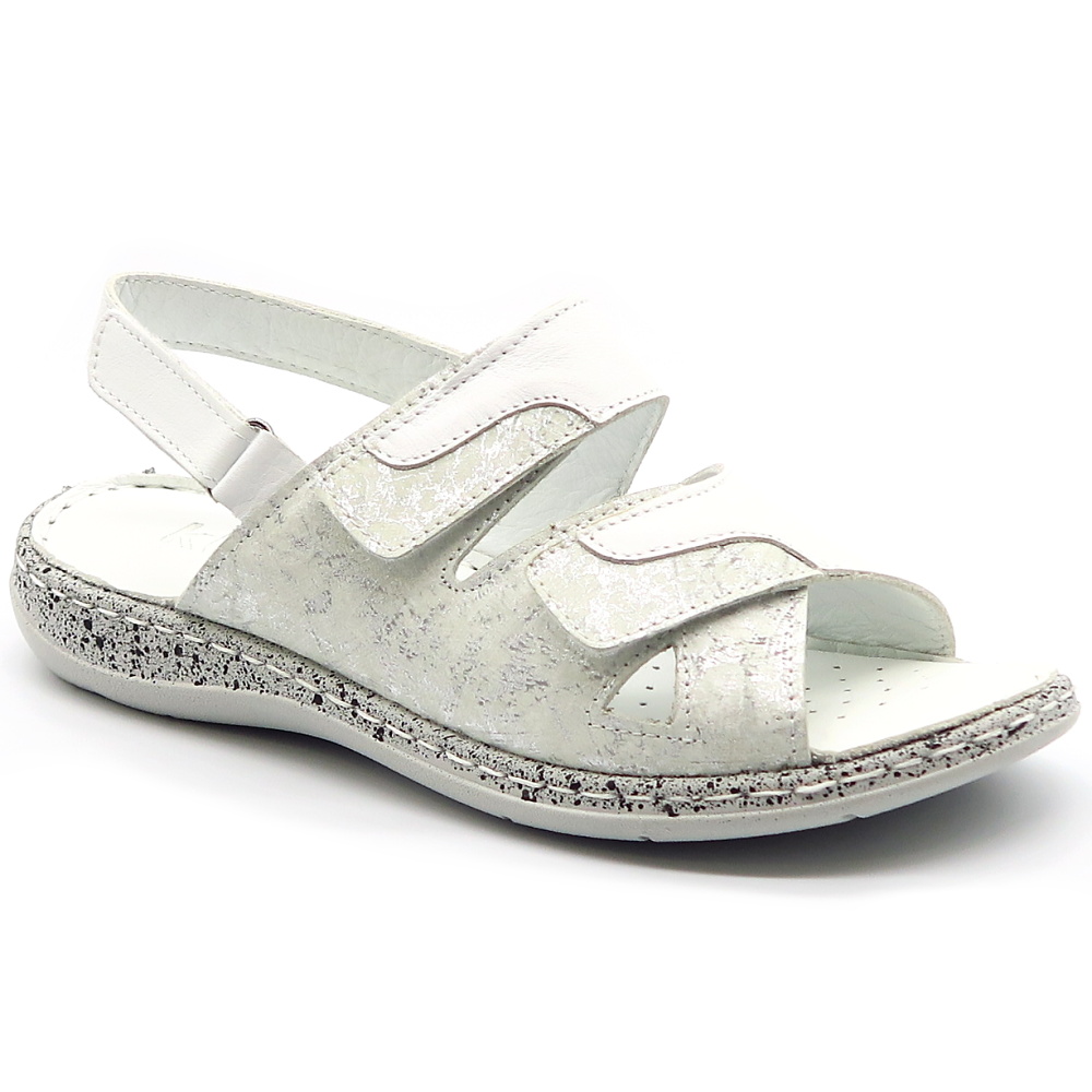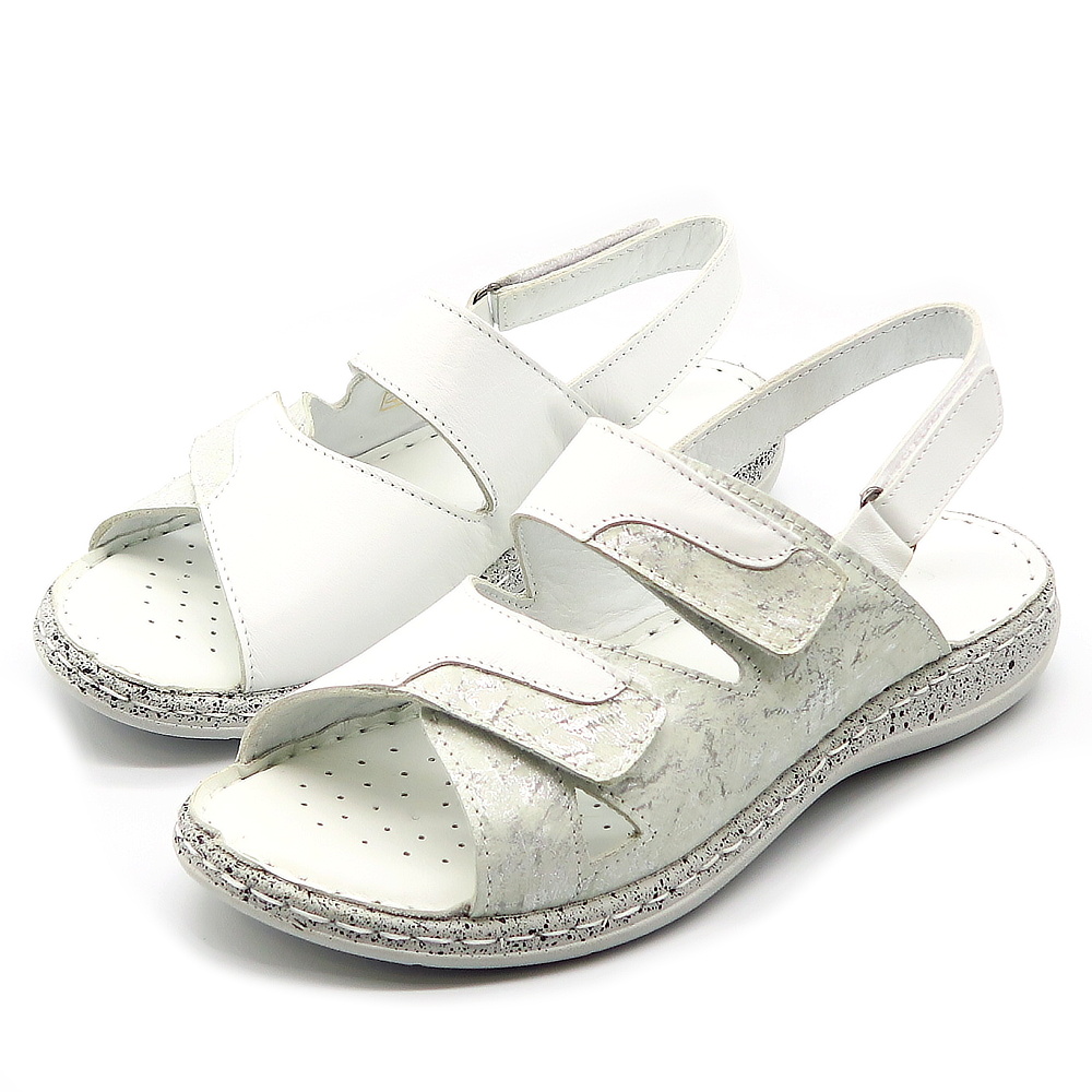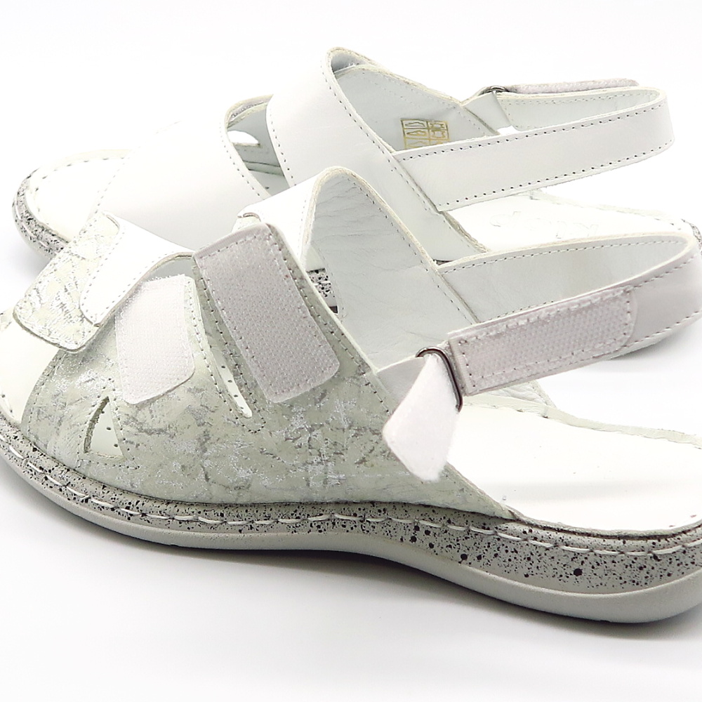Dámske pohodlné sandále značky KLOP. Biela farba so strieborným odleskom dodáva sandálom štýlový vzhľad, ktorý sa ľahko kombinuje s rôznymi outfitmi. Vďaka praktickému zapínaniu na suchý zips sa sandále ľahko prispôsobia chodidlu a umožňujú rýchle a pohodlné obúvanie. Mäkká, kožená tvarovaná stielka poskytuje maximálny komfort a príjemný pocit aj pri dlhšom nosení. Sandále vhodné aj na širšie chodidlá.
