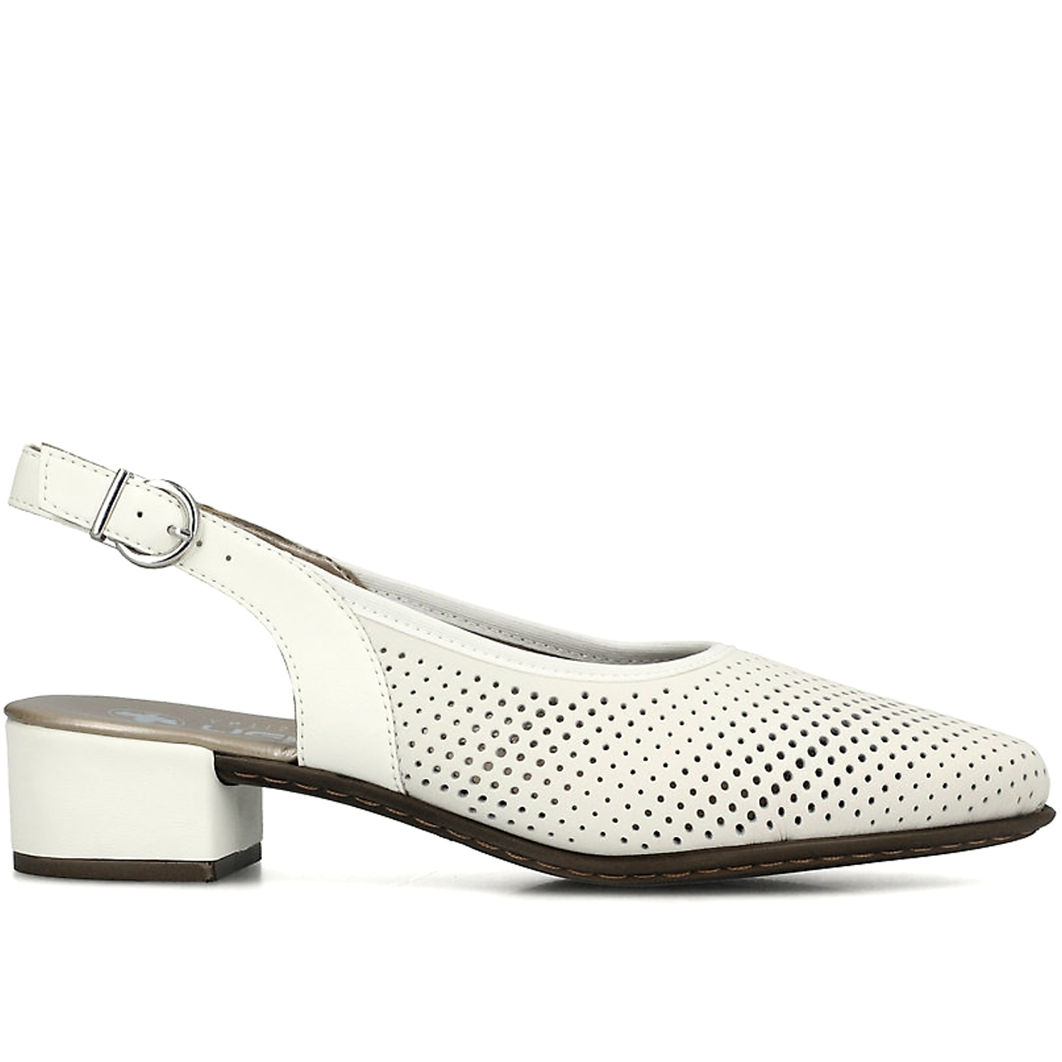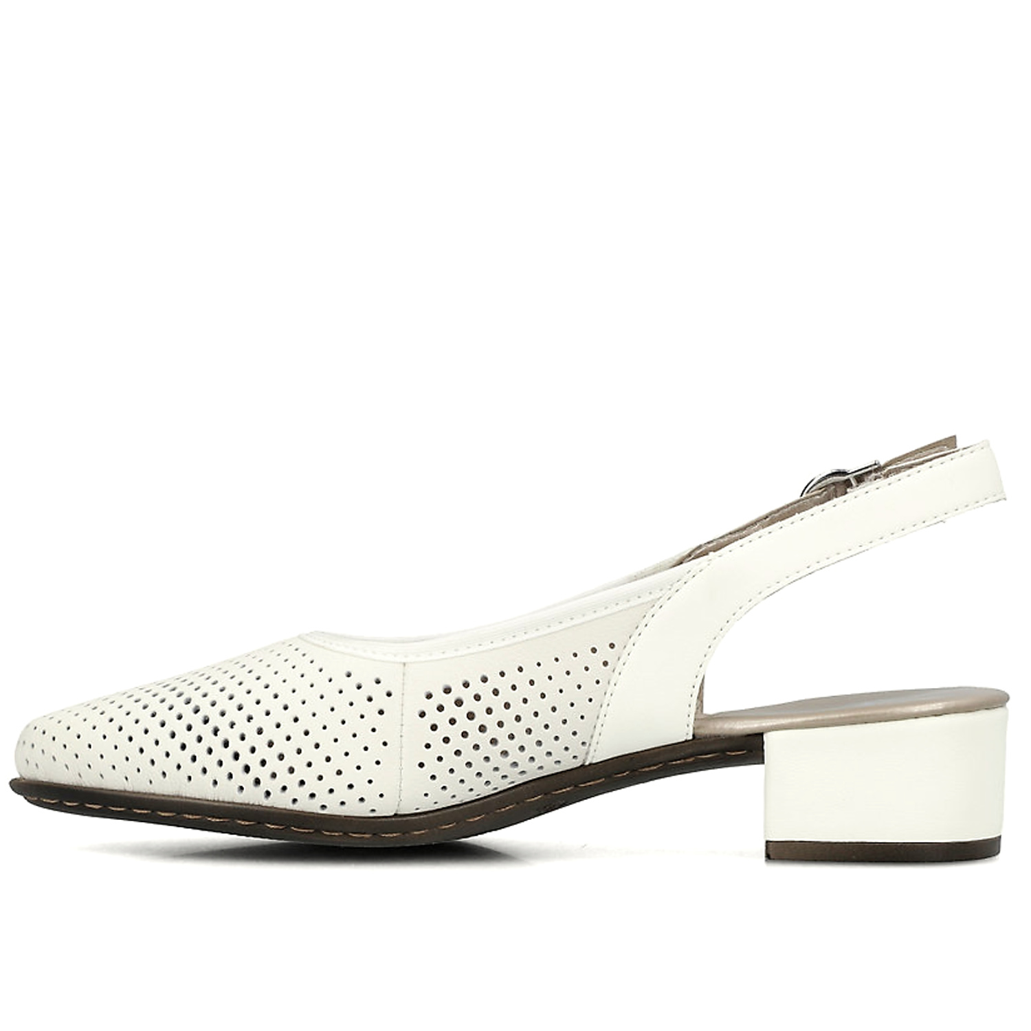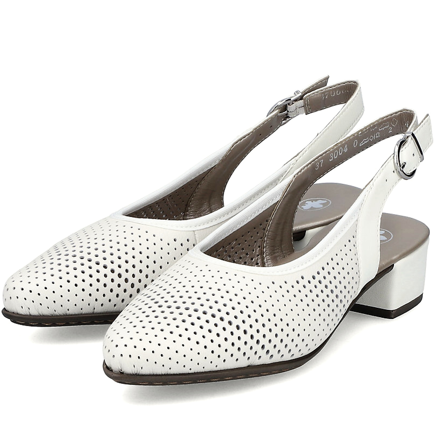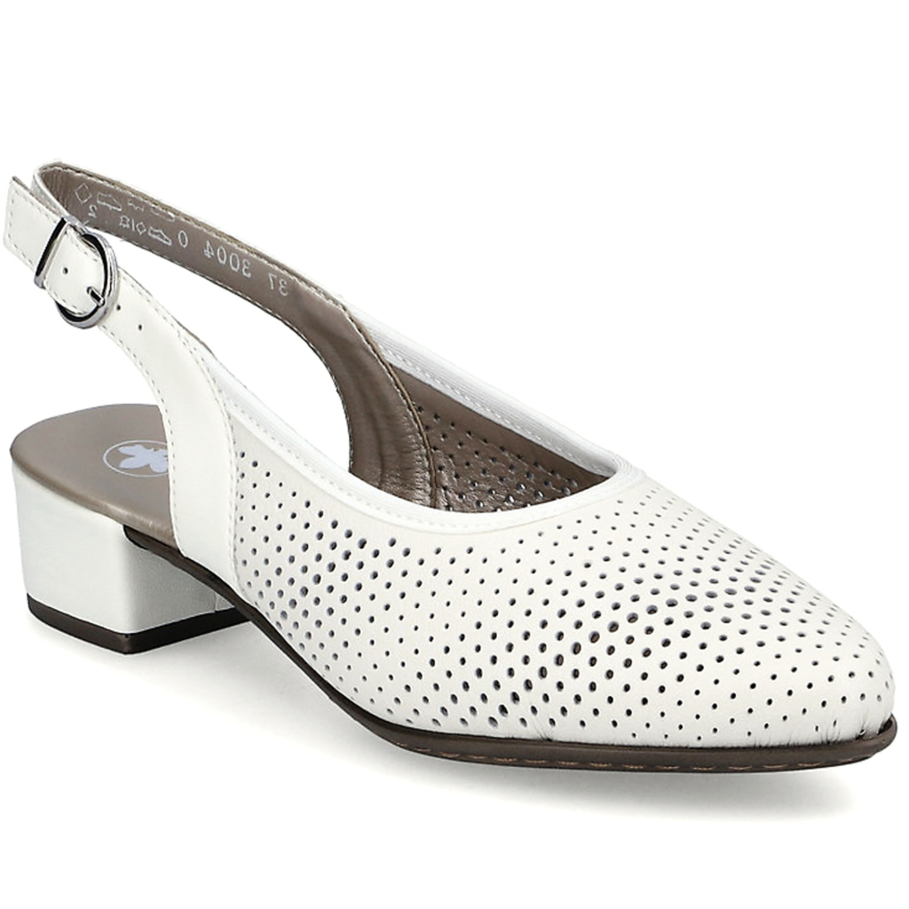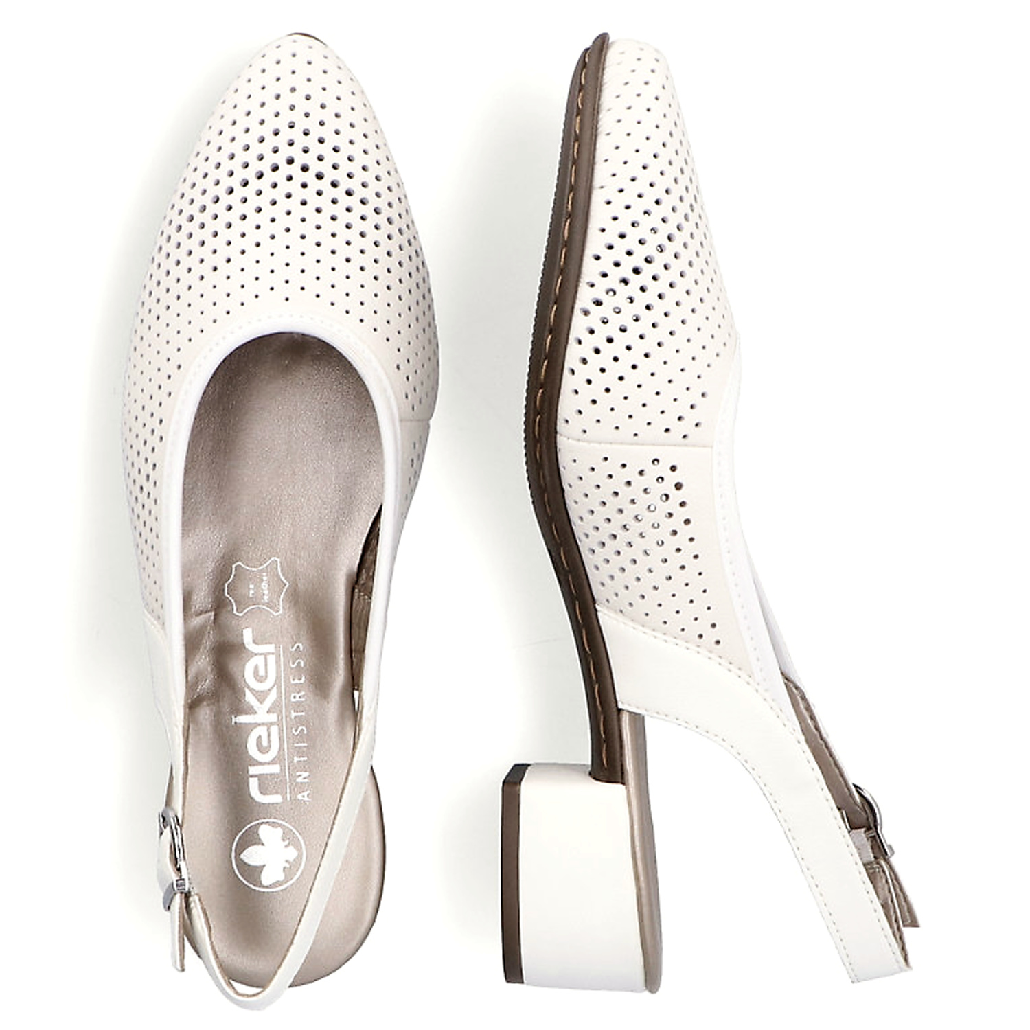 Elegantné dámske sandále značky RIEKER v bielej farbe, ktoré spájajú štýlový vzhľad s maximálnym pohodlím. Zvršok je zdobený modernou perforáciou, vďaka ktorej sú sandále priedušné a vhodné aj na teplé dni. Uzatvorená špička chráni prsty dodáva topánkam elegantnejší charakter. Sandále majú stabilný nízky podpätok, ktorý zabezpečuje komfort pri chôdzi a je ideálny aj na celodenné nosenie. Mäkká stielka s technológiou ANTISTRESS tlmí nárazy a znižuje únavu nôh.