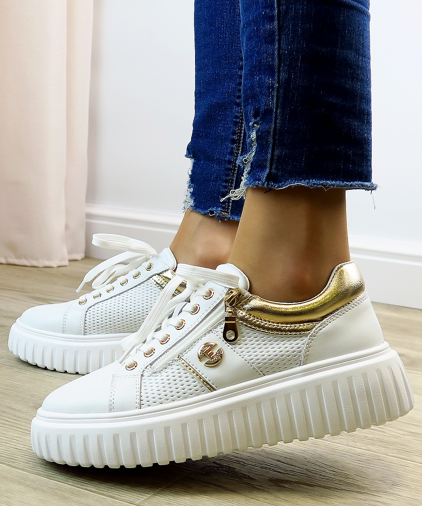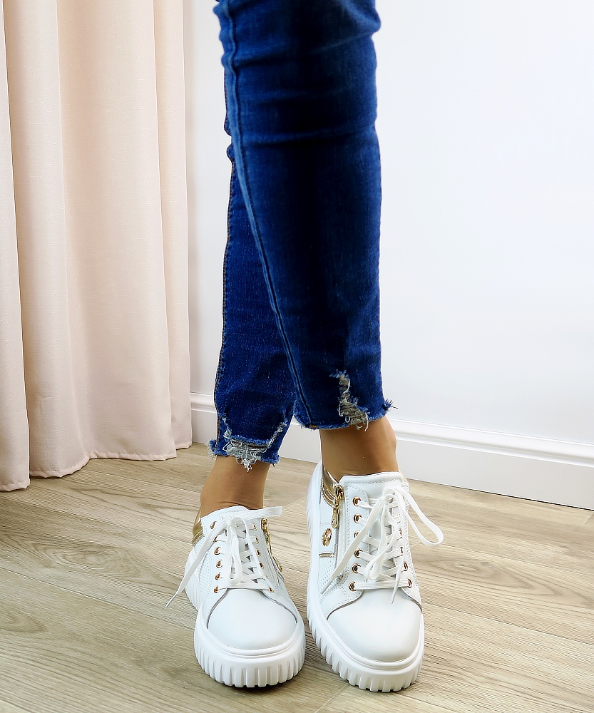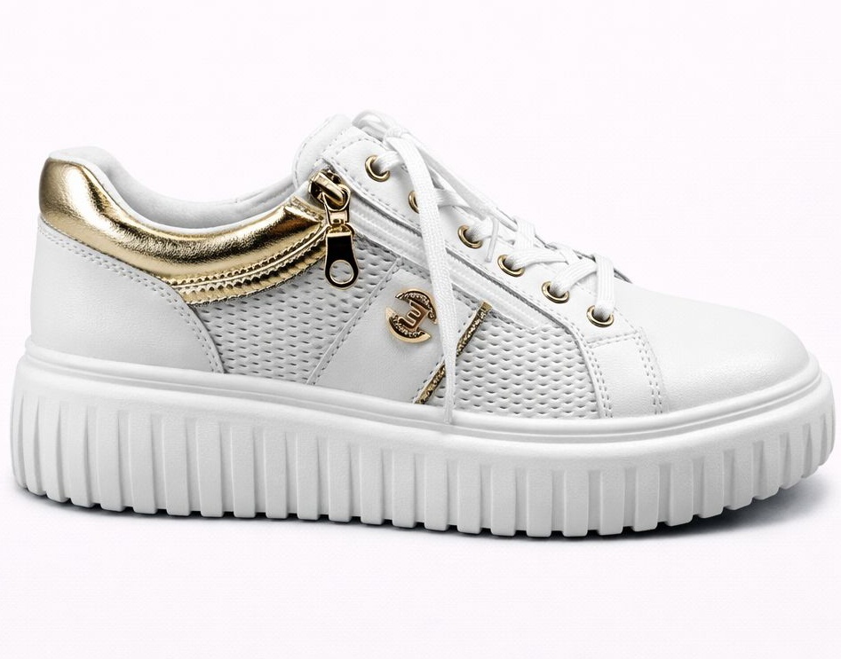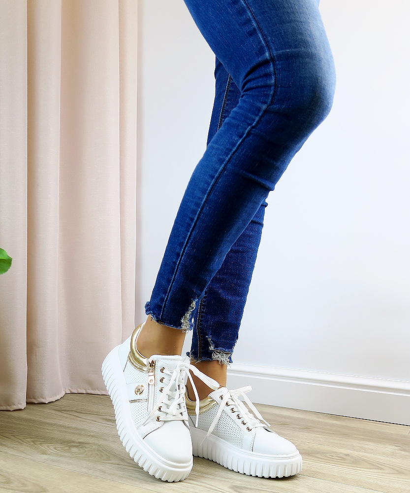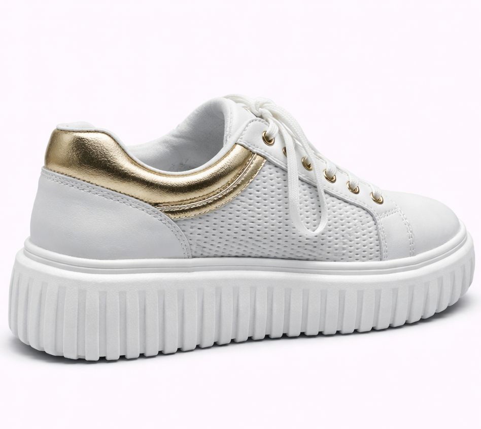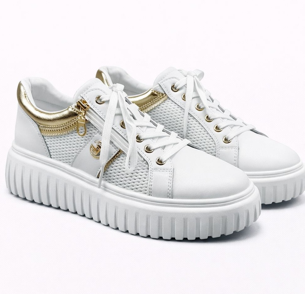 Štýlové dámske tenisky, ktoré spájajú eleganciu s maximálnym komfortom. Moderný biely dizajn je doplnený luxusnými zlatými detailmi, ktoré dodávajú obuvi jedinečný a sofistikovaný vzhľad. Praktický bočný zips uľahčuje obúvanie, zatiaľ čo klasické šnurovanie zabezpečuje perfektné prispôsobenie nohe. Hrubšia, výrazne tvarovaná podrážka nielenže vyzerá trendy, ale zároveň poskytuje pohodlie pri celodennom nosení. Perforované detaily na bokoch zabezpečujú lepšiu priedušnosť.
