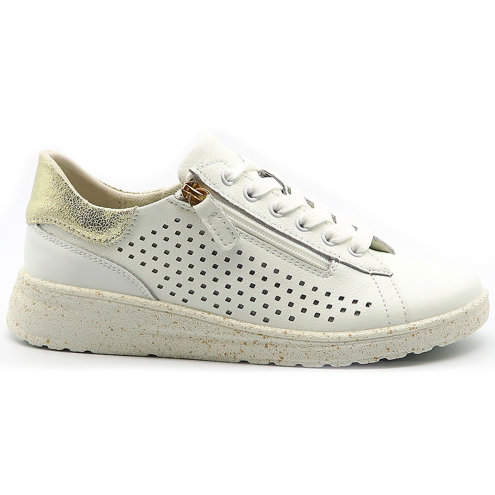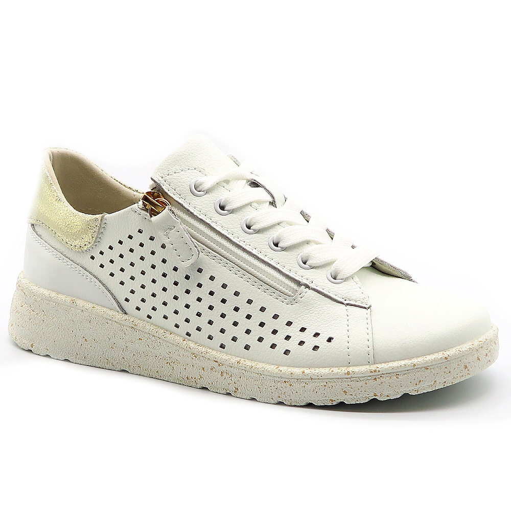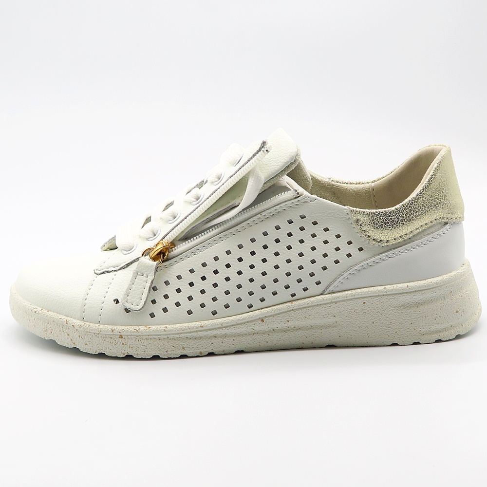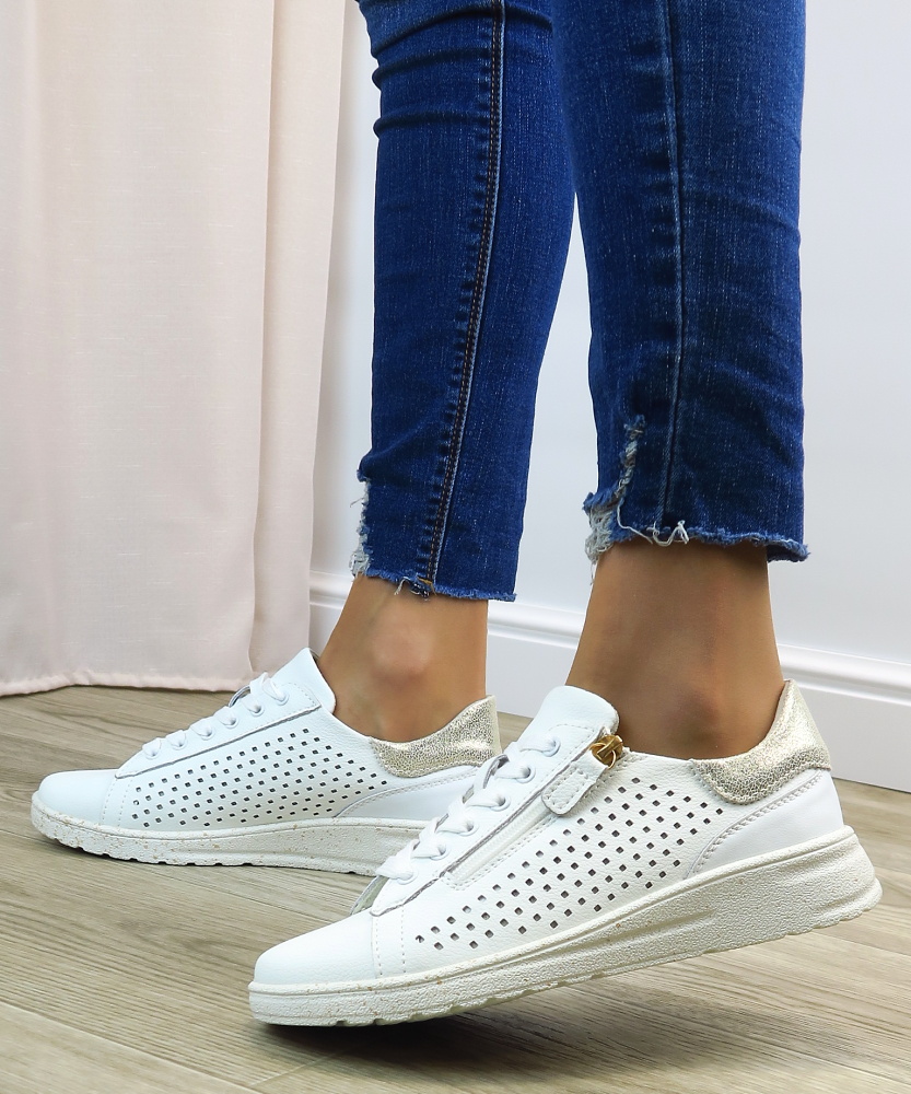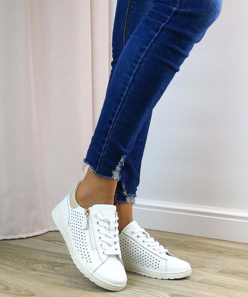 Tieto dámske tenisky v klasickej bielej farbe sú ideálnym kúskom do každého šatníka. Vďaka svojmu jednoduchému a nadčasovému dizajnu sa ľahko kombinujú so športovým aj elegantnejším outfitom – od riflí až po šaty. Praktický bočný zips umožňuje rýchle aj pohodlné obúvanie bez nutnosti neustáleho viazania šnúrok. Mäkká vnútorná výstelka poskytuje komfort aj pri celodennom nosení, zatiaľ čo pevná podrážka zabezpečuje stabilitu a istý krok.