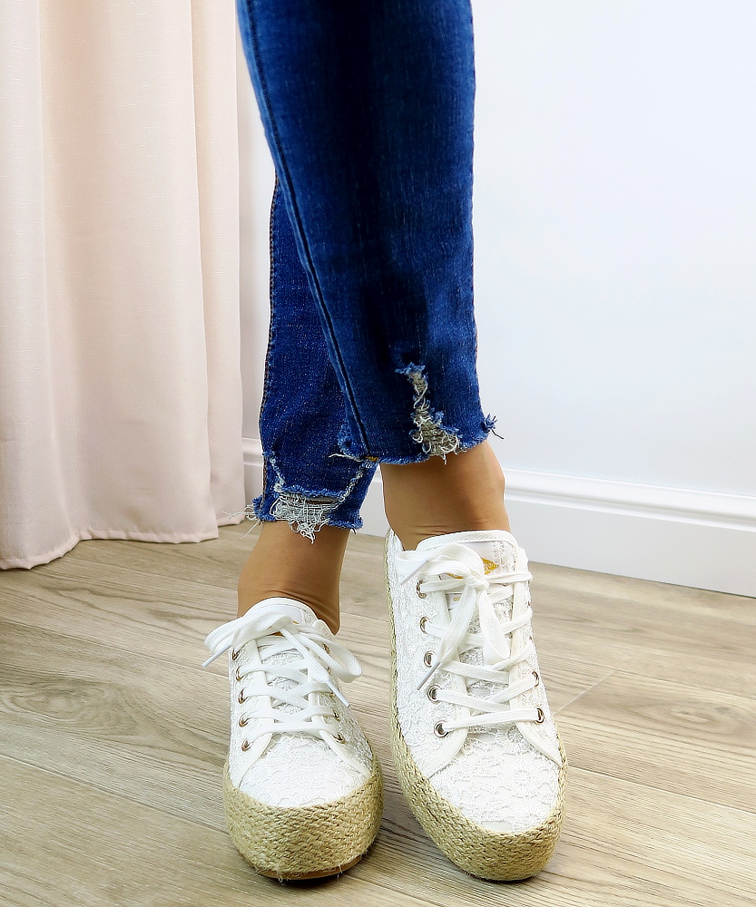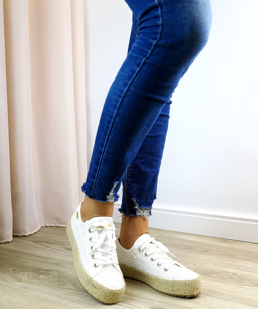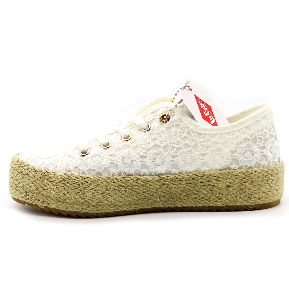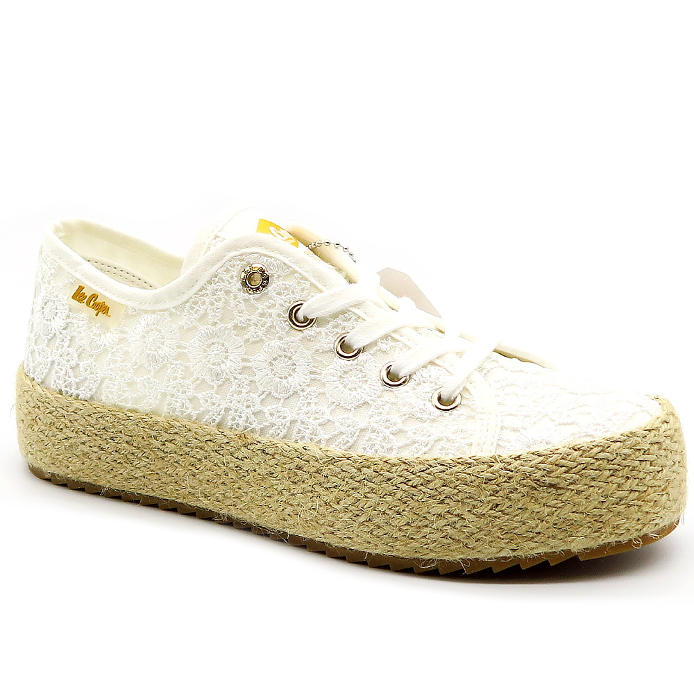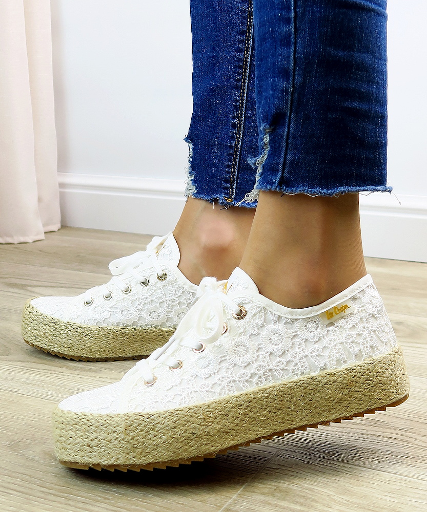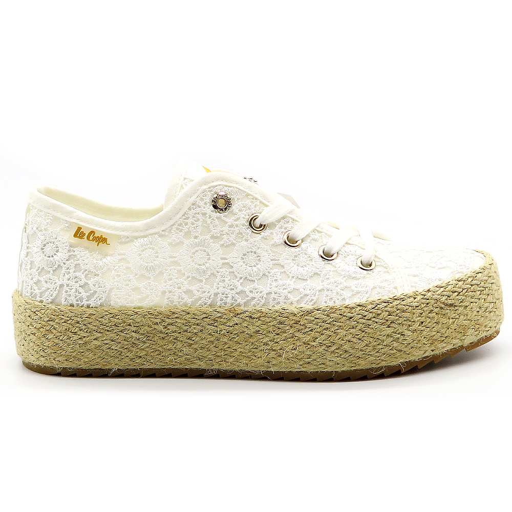 Táto štýlová tenisky značky LEE COOPER v sebe dokonale kombinuje ležérnosť a prírodný vzhľad. Zvršok je vyrobený z textilného materiálu v bielej farbe, ktorý pôsobí ľahko vzdušne ideálny na teplejšie dni. Najvýraznejším prvkom je hrubá platformová podrážka, ktorá je opletená prírodným jutovým vláknom. Celkový dizajn dopĺňa jemná čipka na vrchnej časti. Sú skvelou voľbou pre milovníkov pohodlia a originality.