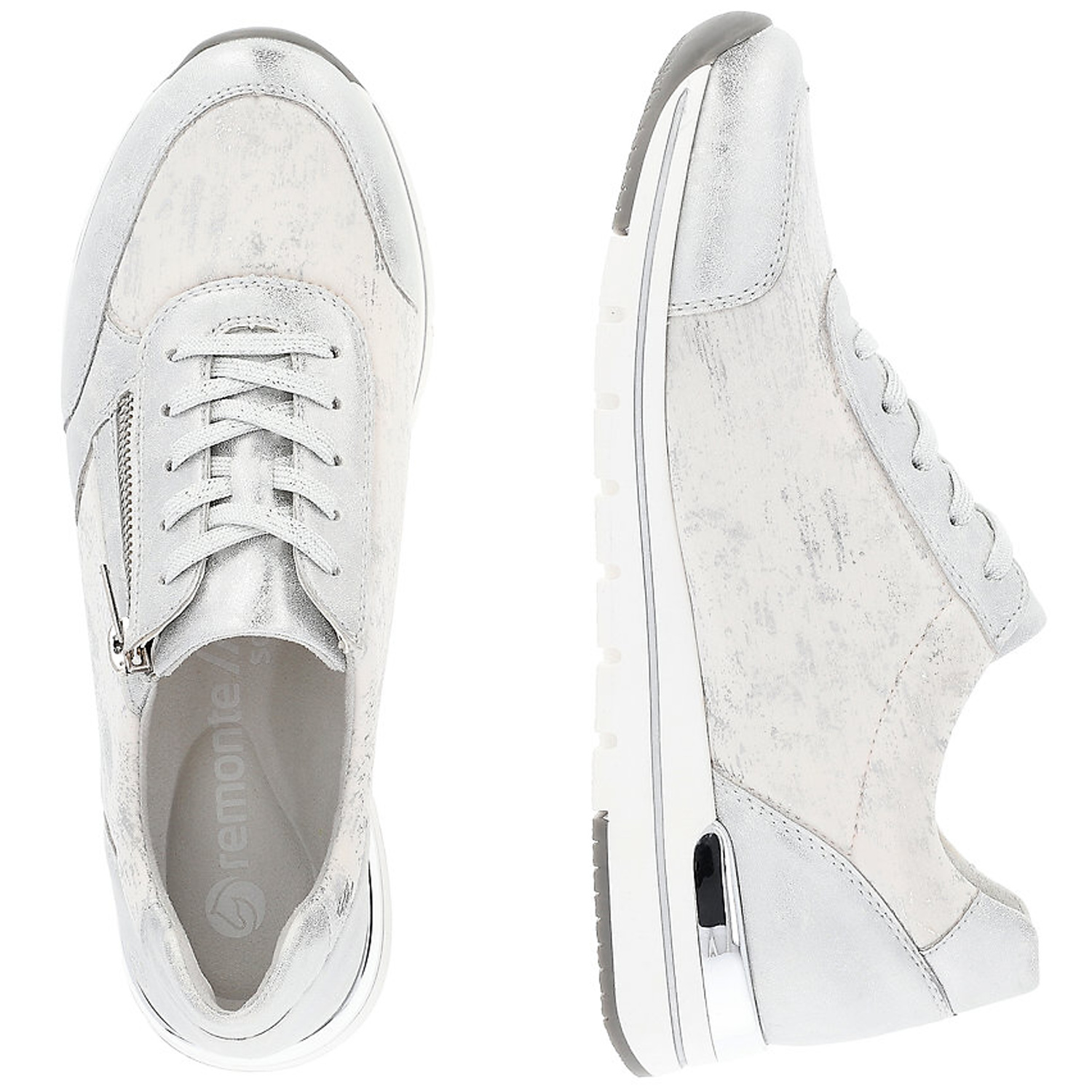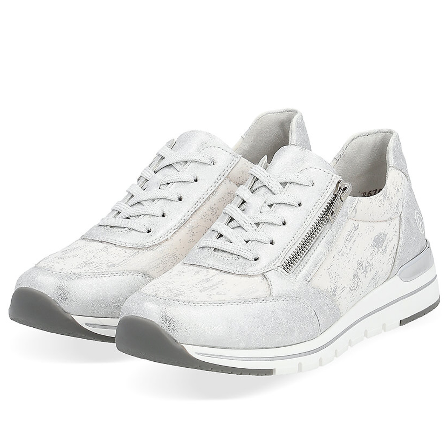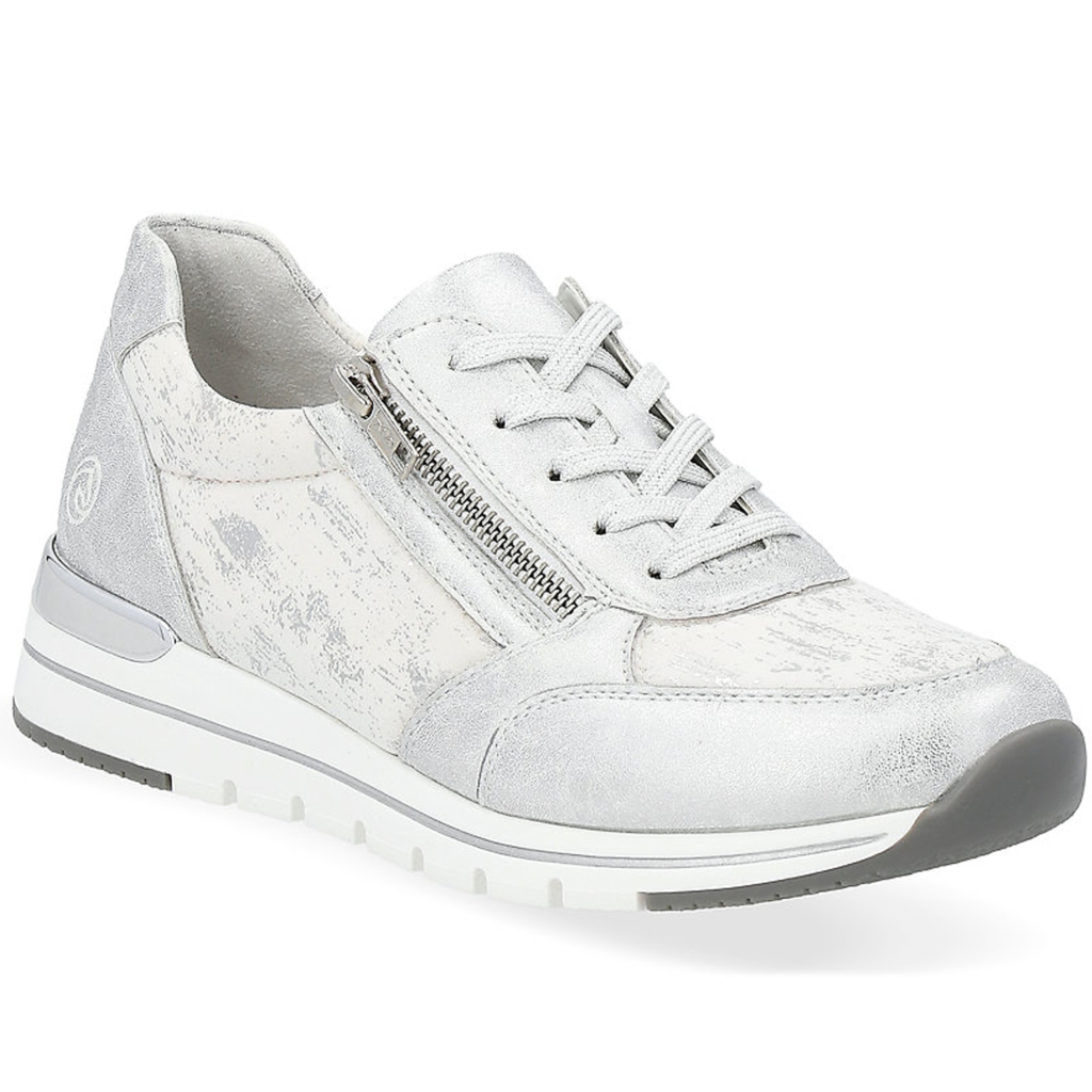 Dámske tenisky od kvalitnej nemeckej značky REMONTE. Model v bielej farbe doplnená jemným strieborným efektom. Praktická kombinácia šnurovania a bočného zipsu umožňuje jednoduché a rýchle obúvanie. Mäkká vyberateľná stielka poskytuje príjemný došľap a pohodlie aj pri dlhšej chôdzi. Ľahká, pružná podrážka tlmí nárazy a zaručuje stabilitu.