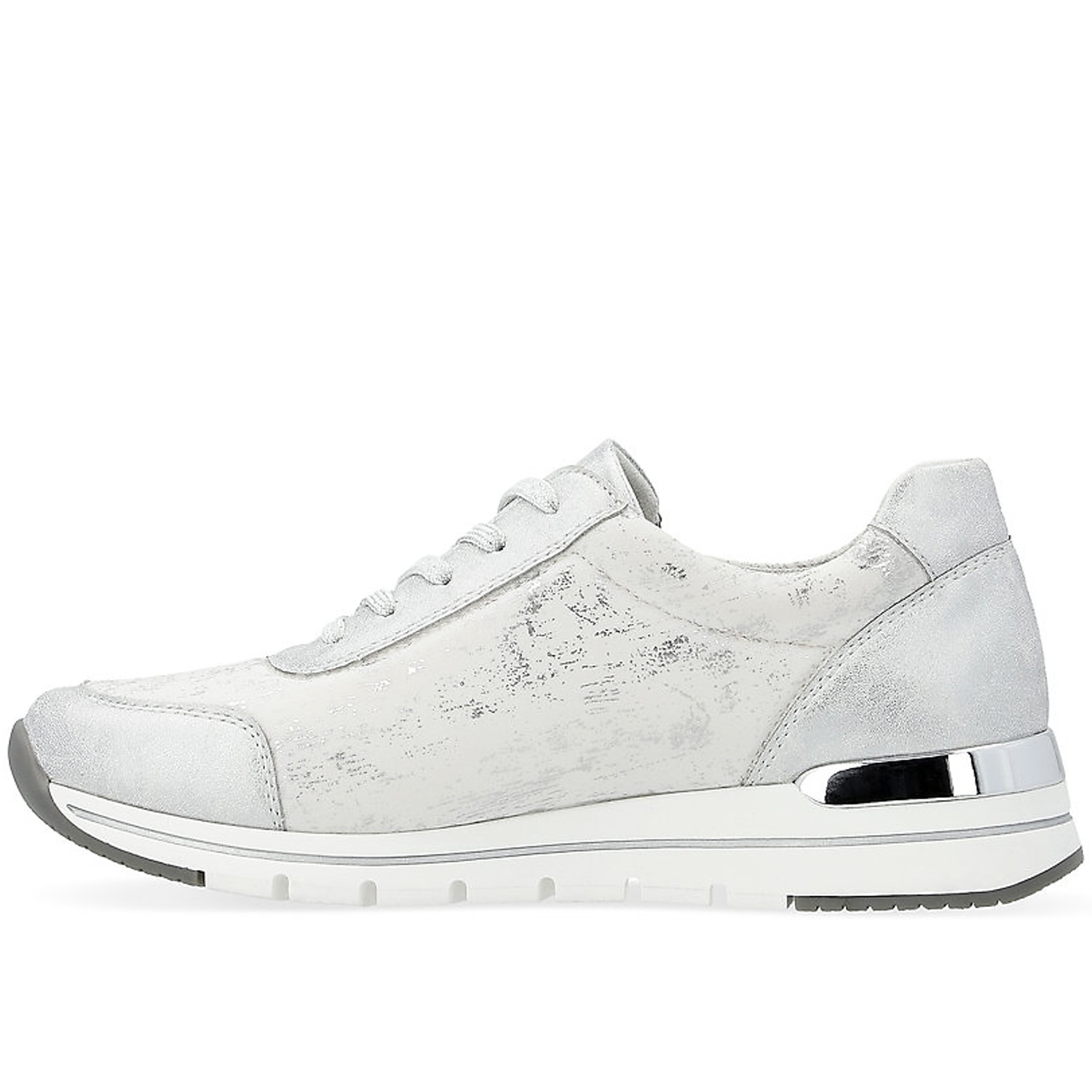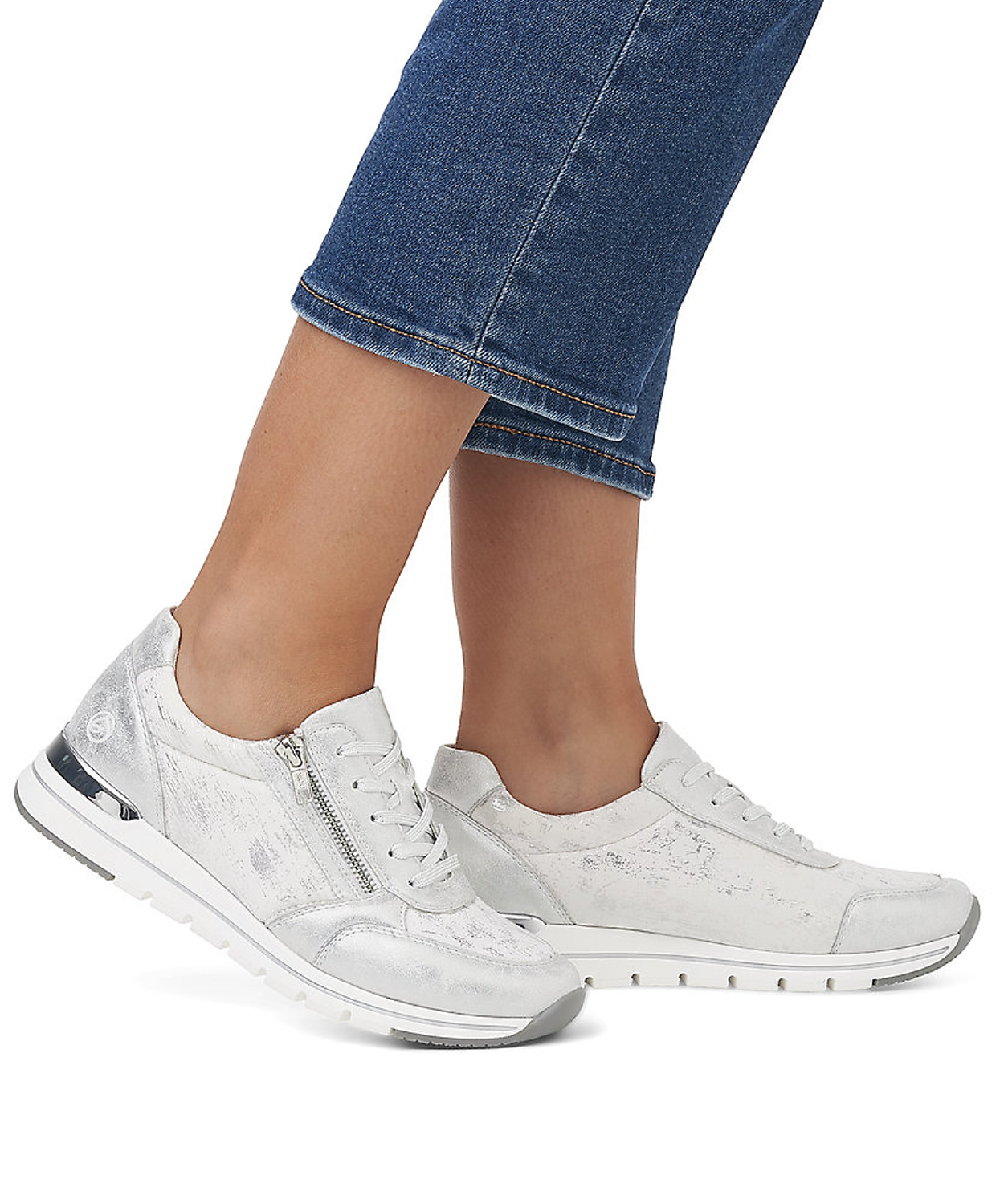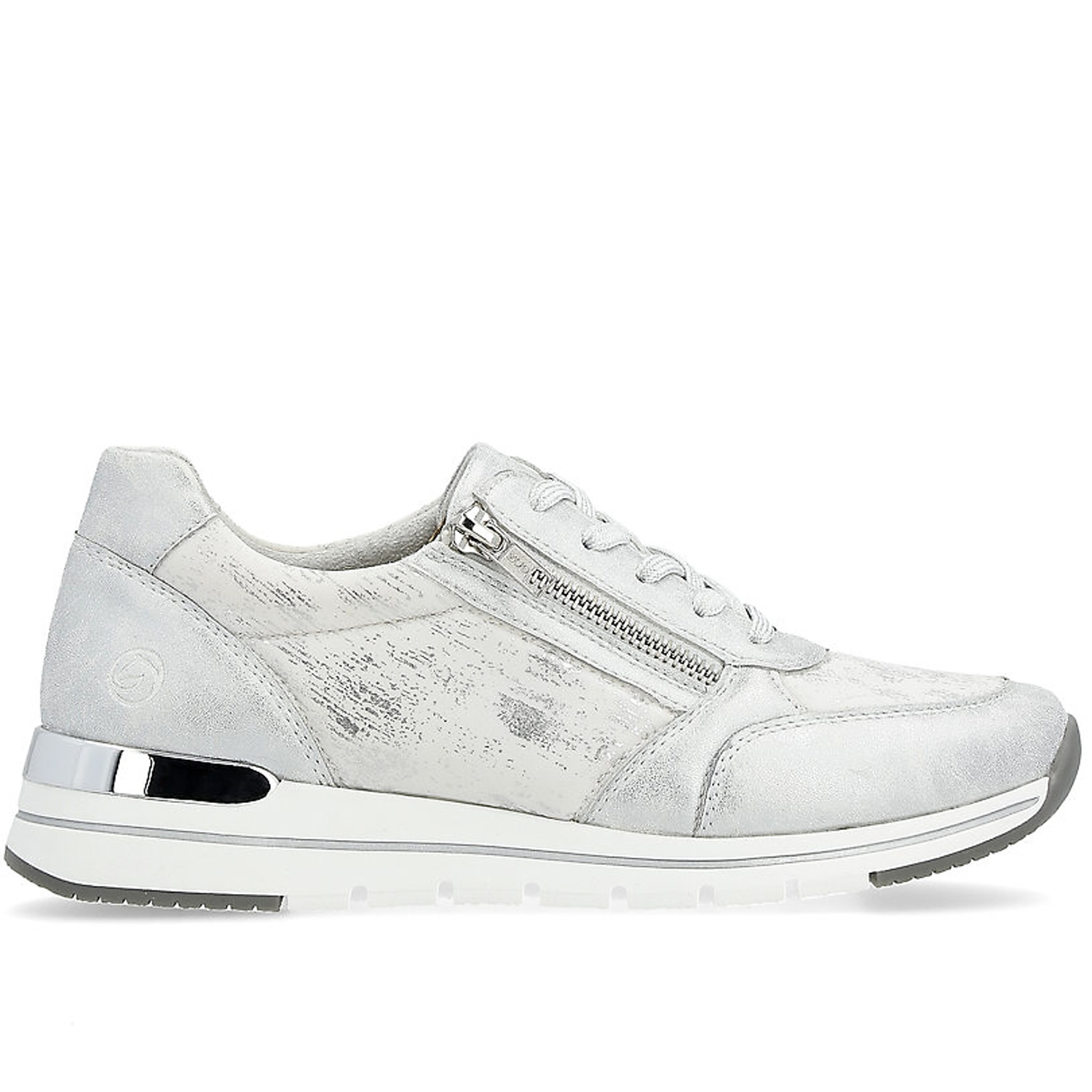 Dámske tenisky od kvalitnej nemeckej značky REMONTE. Model v bielej farbe doplnená jemným strieborným efektom. Praktická kombinácia šnurovania a bočného zipsu umožňuje jednoduché a rýchle obúvanie. Mäkká vyberateľná stielka poskytuje príjemný došľap a pohodlie aj pri dlhšej chôdzi. Ľahká, pružná podrážka tlmí nárazy a zaručuje stabilitu.