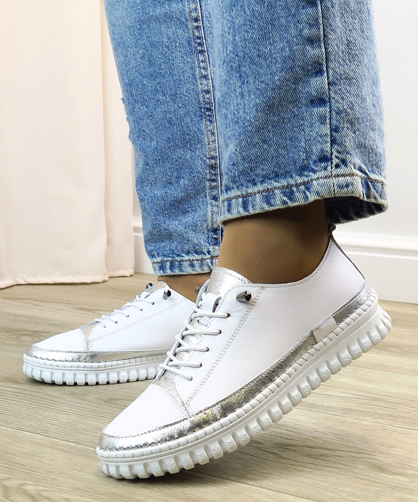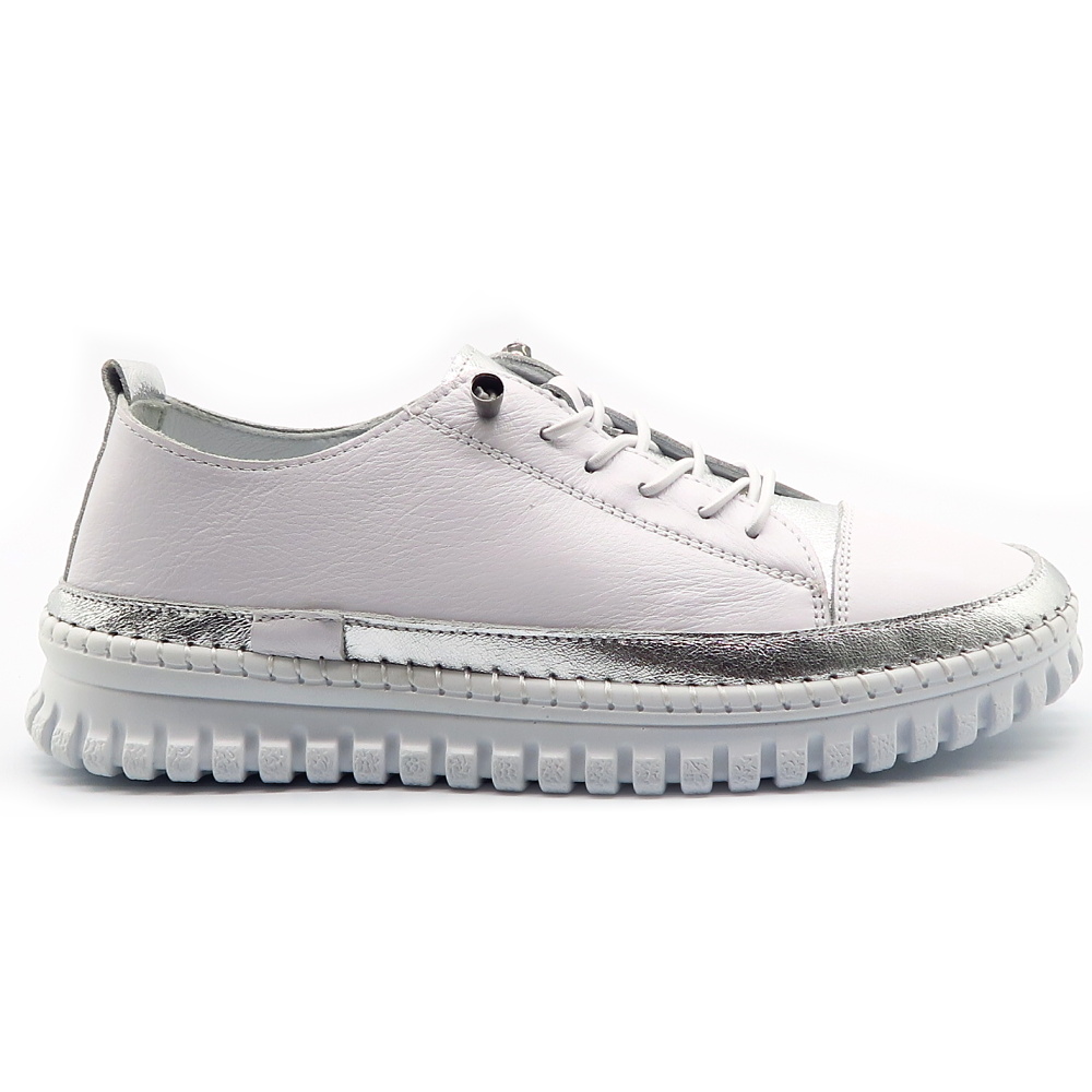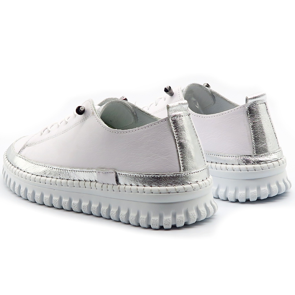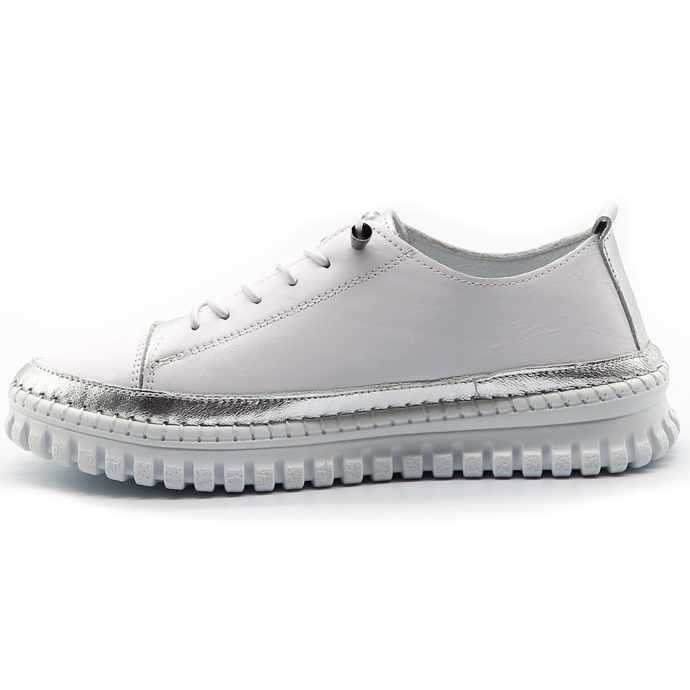Objav dokonalú kombináciu pohodlia a jemnej elegancie s týmito ľahkými teniskami, ktoré sú navrhnuté pre maximálny komfort počas celého dňa. Pružná podrážka sa prirodzene prispôsobí pohybu chodidla a zabezpečí mäkký došľap pri každom kroku. Minimalistický biely dizajn doplnený o jemné metalické detaily dodáva teniskám moderný a svieži vzhľad, ktorý sa ľahko kombinuje. Mäkký kožený zvršok a jednoduché elastické šnurovanie zaručujú pohodlné nosenie.