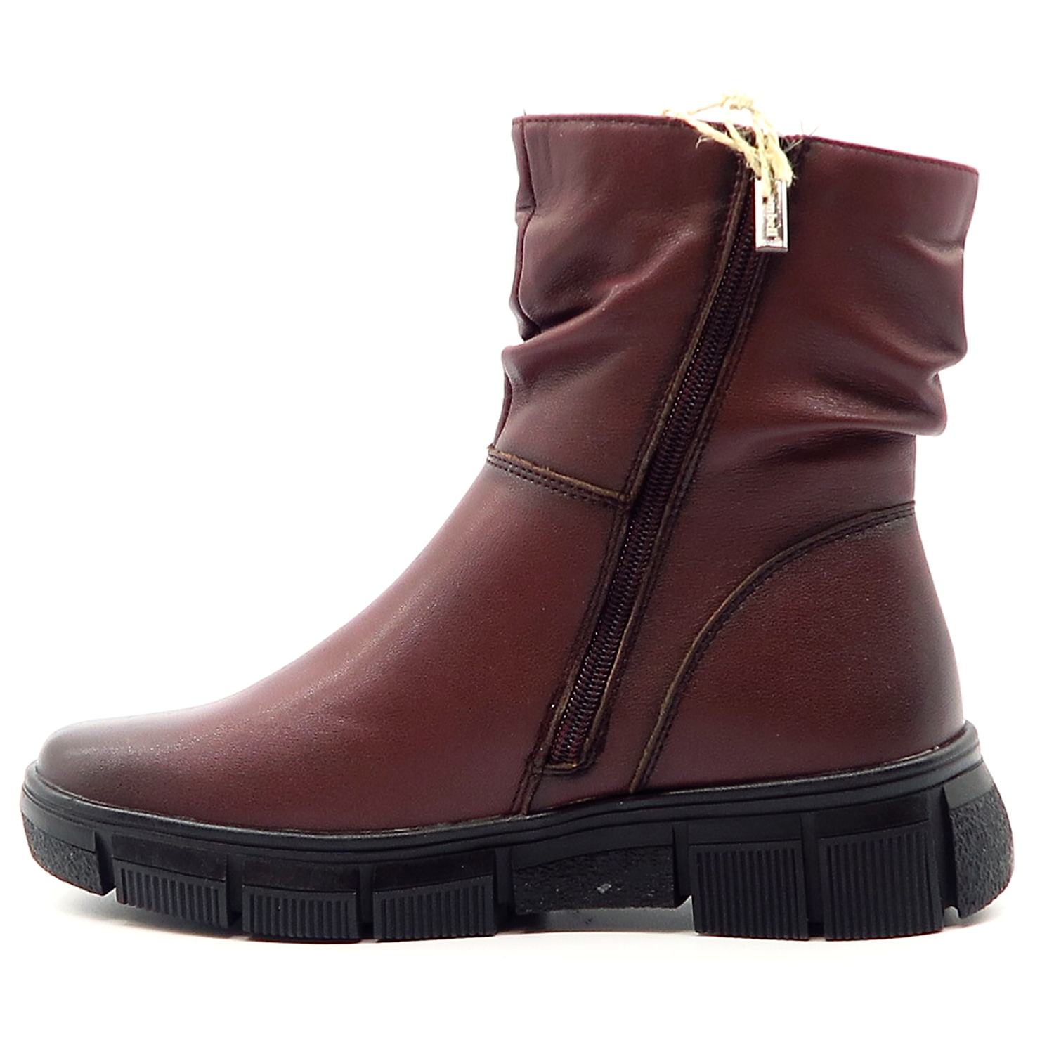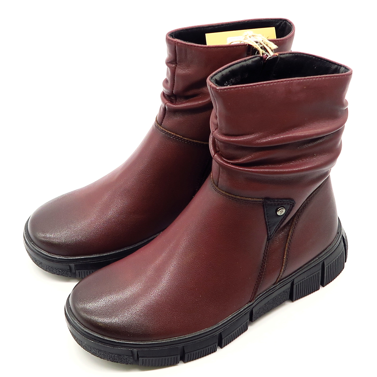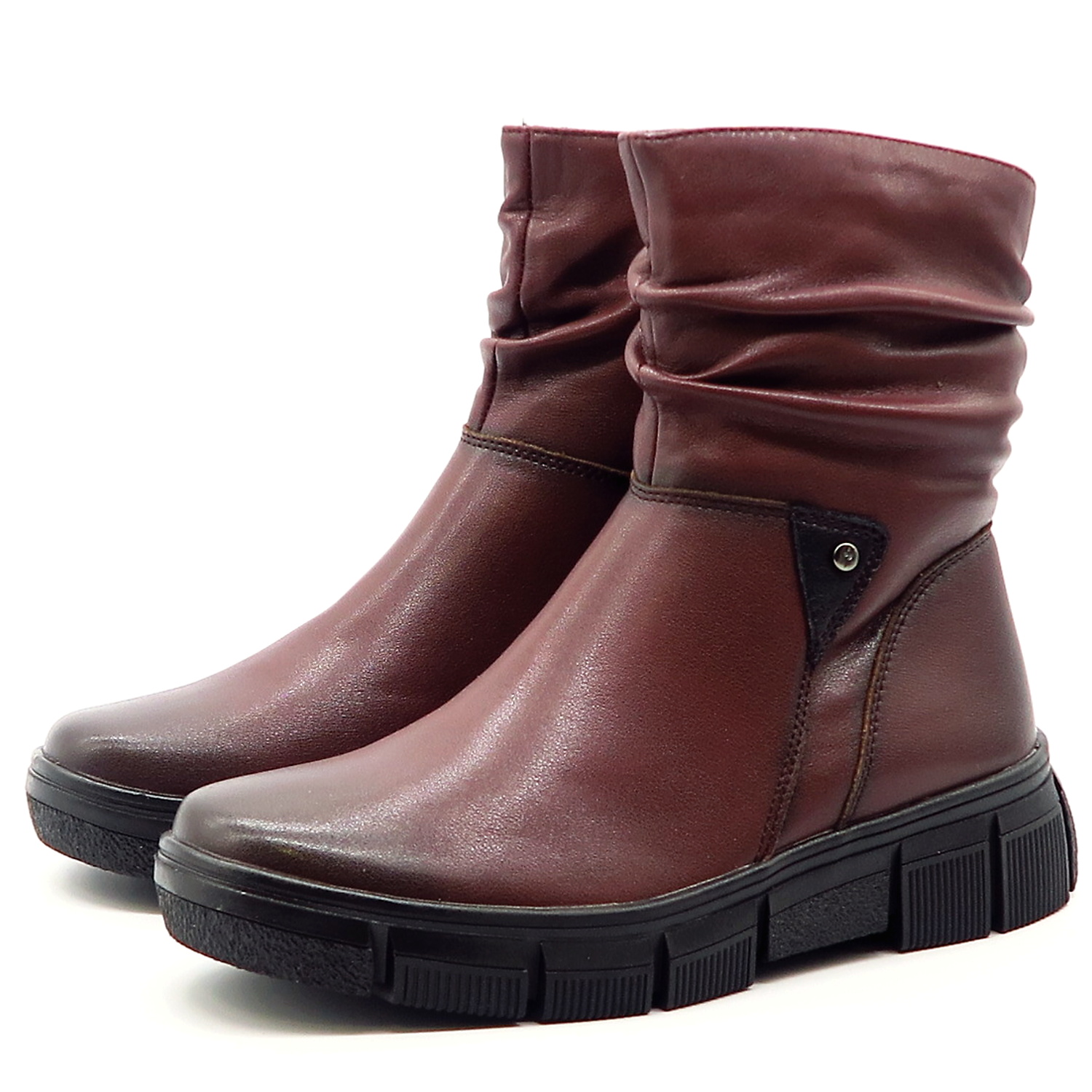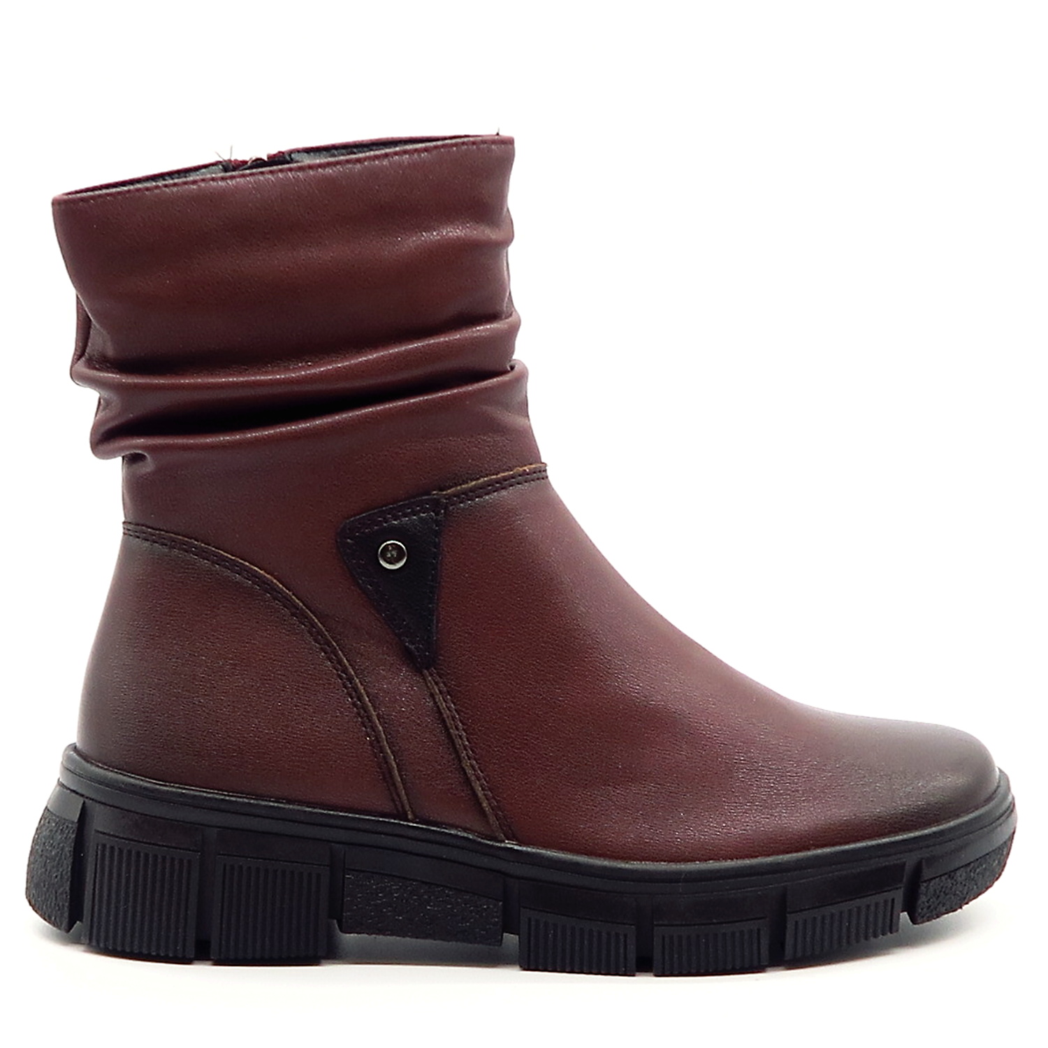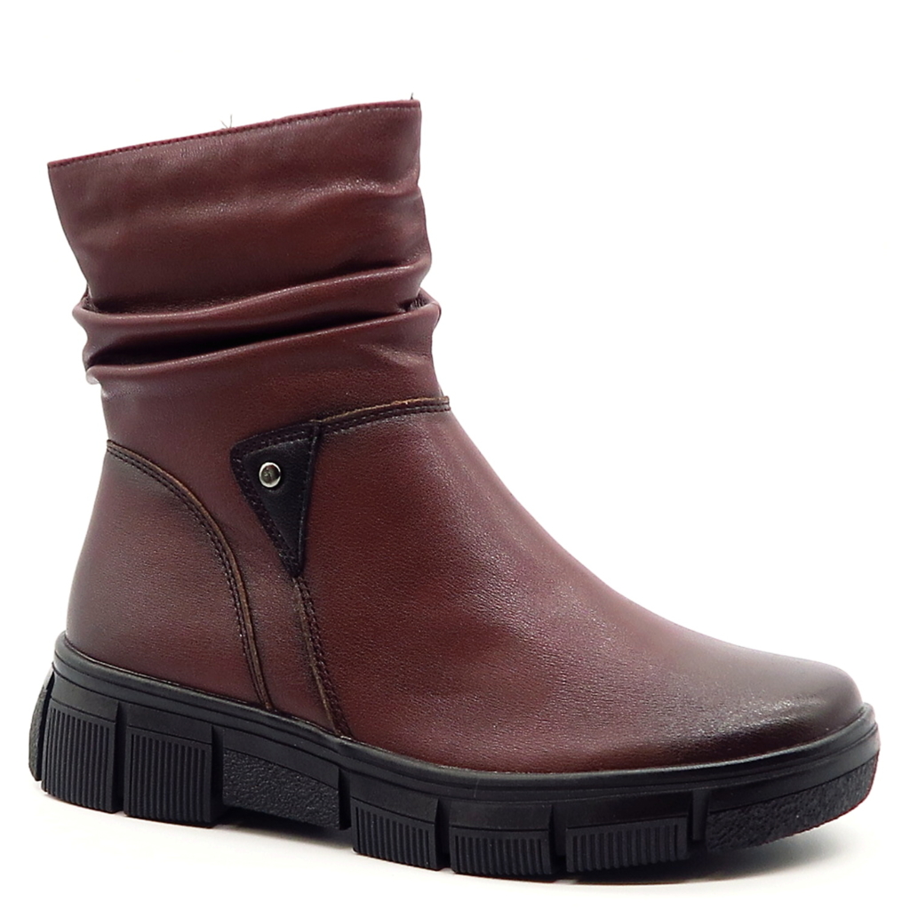 Čierne členkové topánky značky CAMBELL. Model v bordovej farbe. Zvršok vyrobený z prírodnej kože. Jednoduchý, čistý dizajn je doplnený jemným prešitím a mierne riaseným detailom v oblasti členka. Hrubá podrážka zabezpečuje stabilitu a komfort pri chôdzi, vďaka čomu sú topánky ideálne na každodenné nosenie. Vhodné na širšie chodidlá. Počas chladných dní Vás zahreje hrubšia kožušina vo vnútri.