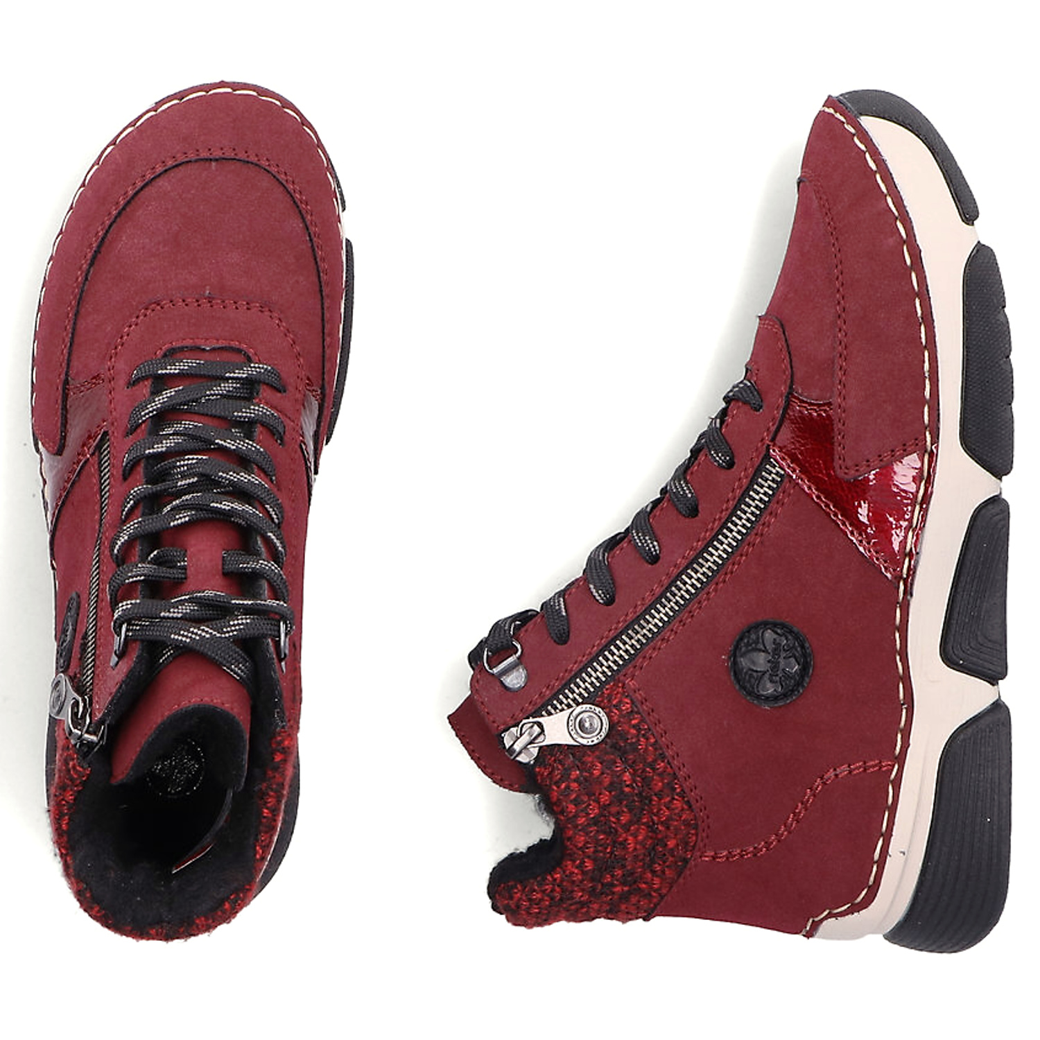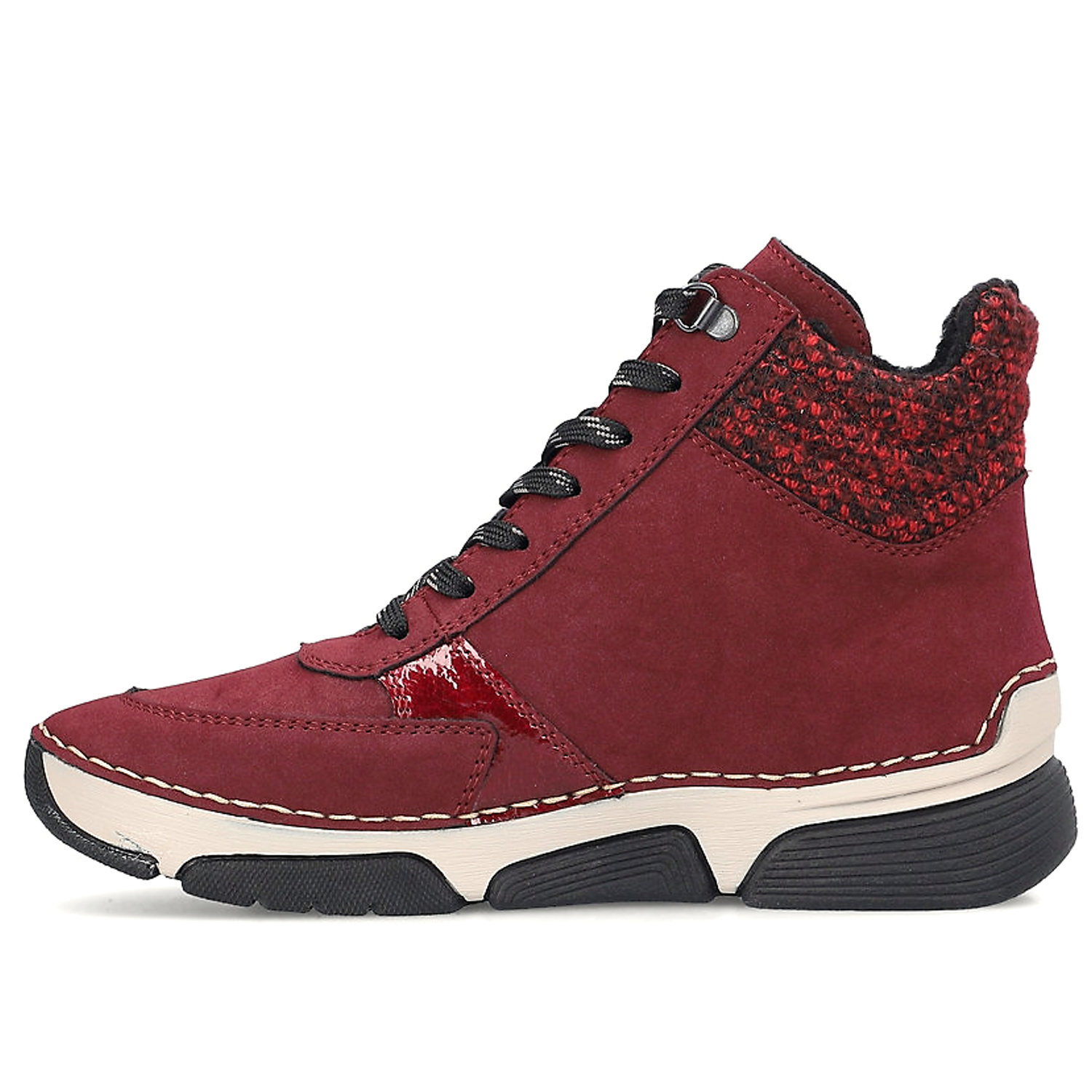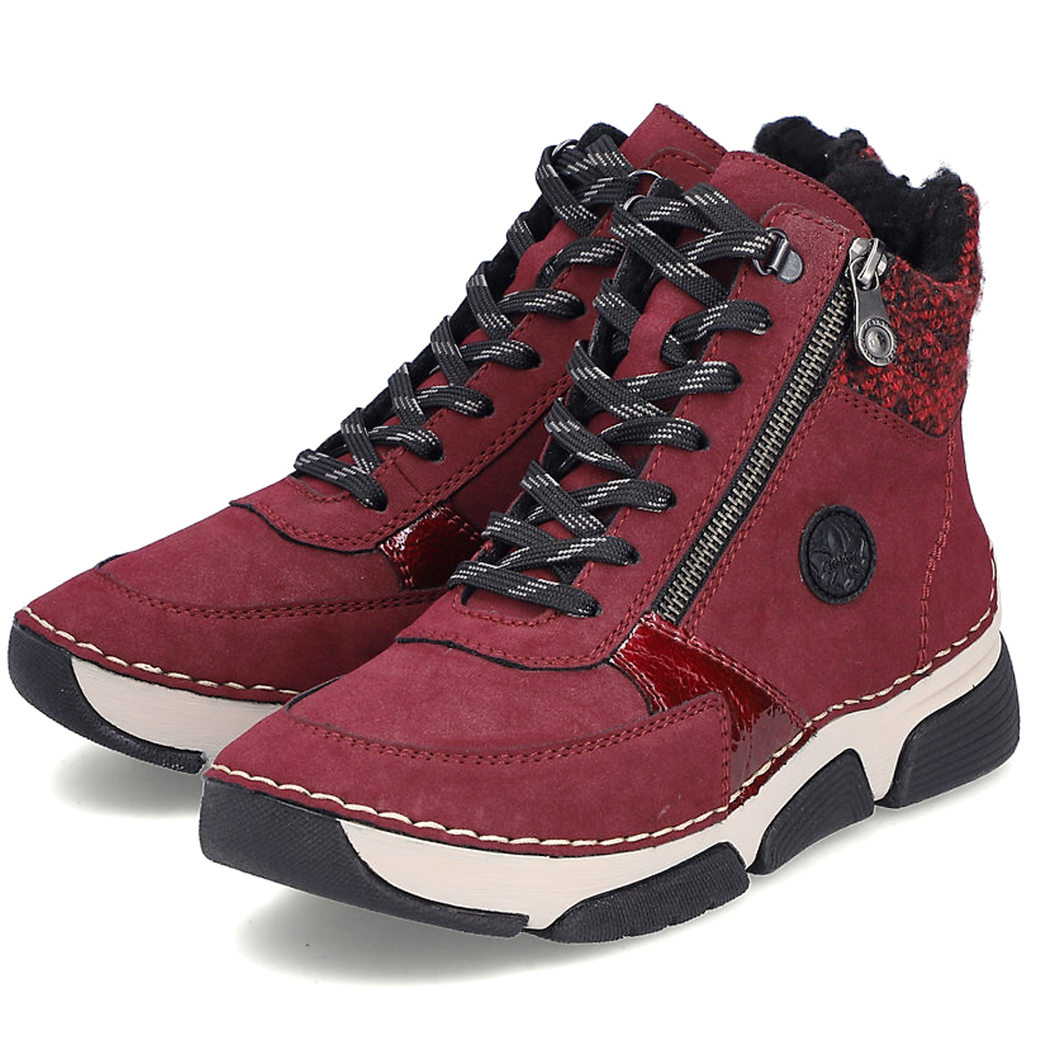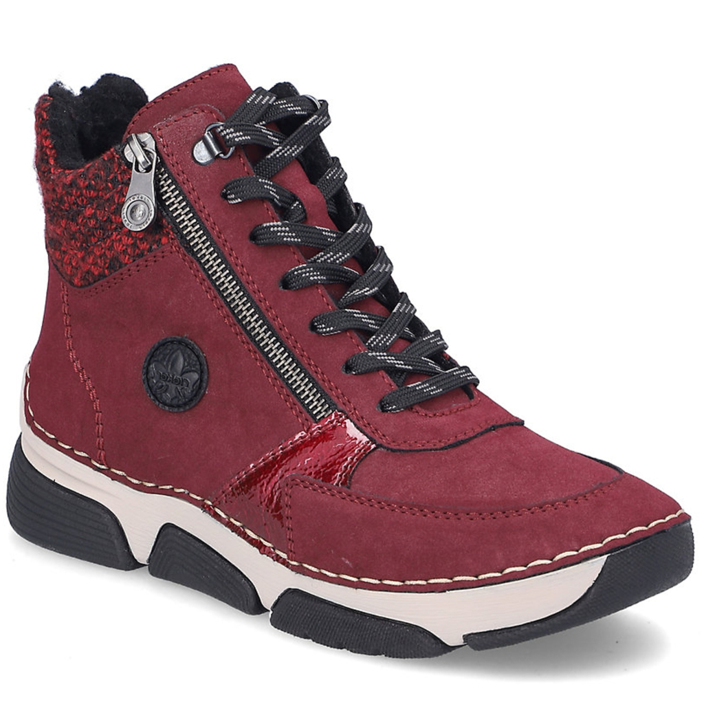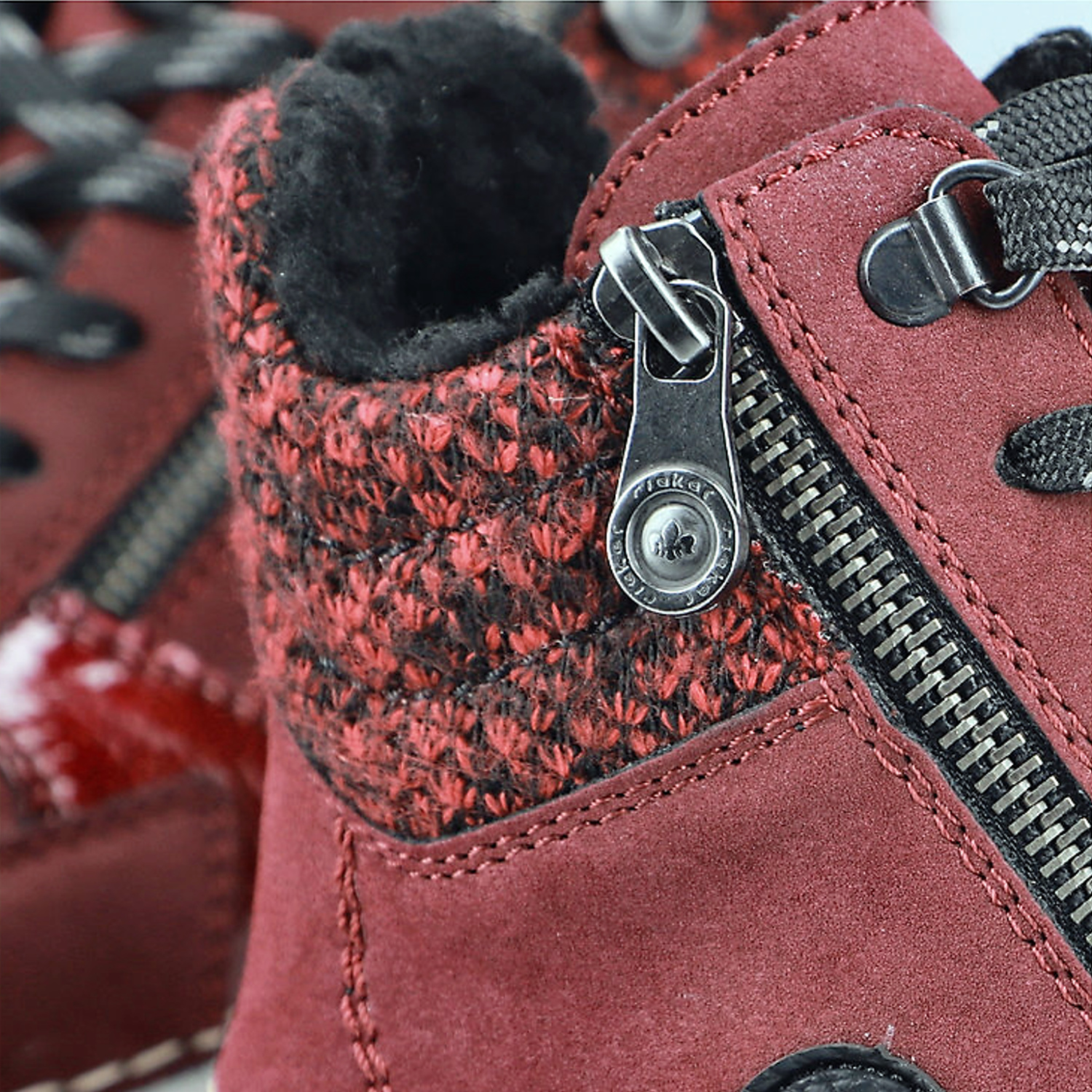 Dámske členkové topánky značky RIEKER , ktoré spájajú komfort a funkčnosť v elegantnom štýle. Vďaka technológii AntiStress sú maximálne ohybné, čo uľahčuje krok a znižuje únavu chodidla. Model v krásnej bordovej farbe. Zvršok vyrobený z ekologickej kože. Vnútro je zateplené mäkkou kožušinou – ideálne na zimné obdobie. Podrážka je ľahká a tlmiaca, čím poskytuje stabilitu a komfort pri každom kroku. Zapínanie – šnurovanie a bočný zips.