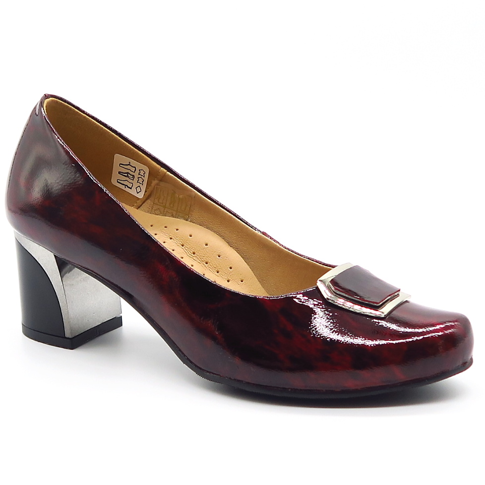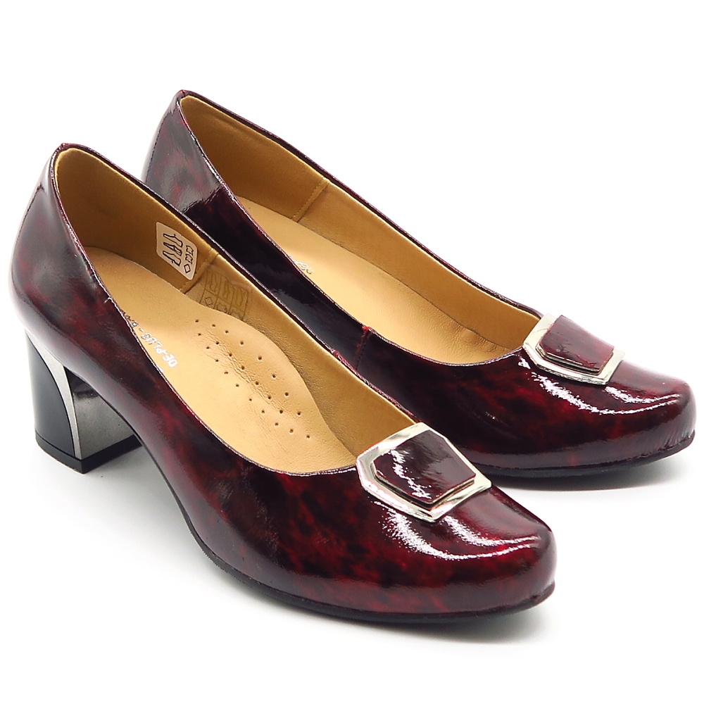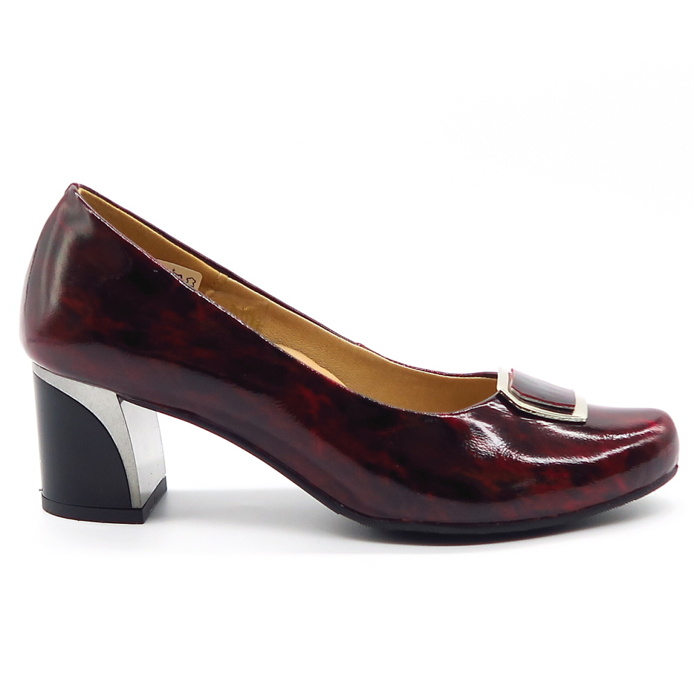 Doprajte si pohodlie a štýl týmito exkluzívnymi lodičkami. Model v bordovej farbe v elegantnom lakovanom prevedení. Vyrobené z prírodnej kože. Ergonomický tvarovaná vnútorná stielka Vám zaisti maximálnu oporu pre chodidla. Hrubý podpätok zaistí komfortný krok. Strieborná ozdoba v prednej časti dodáva topánkam exkluzívny vzhľad. Perfektne na každodenné nosenie aj špeciálne príležitosti! Model vhodný na širšie chodidla.