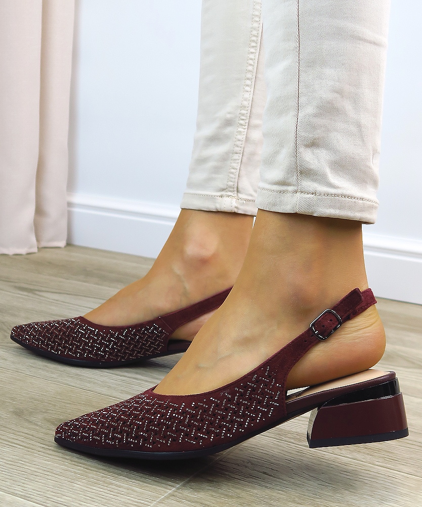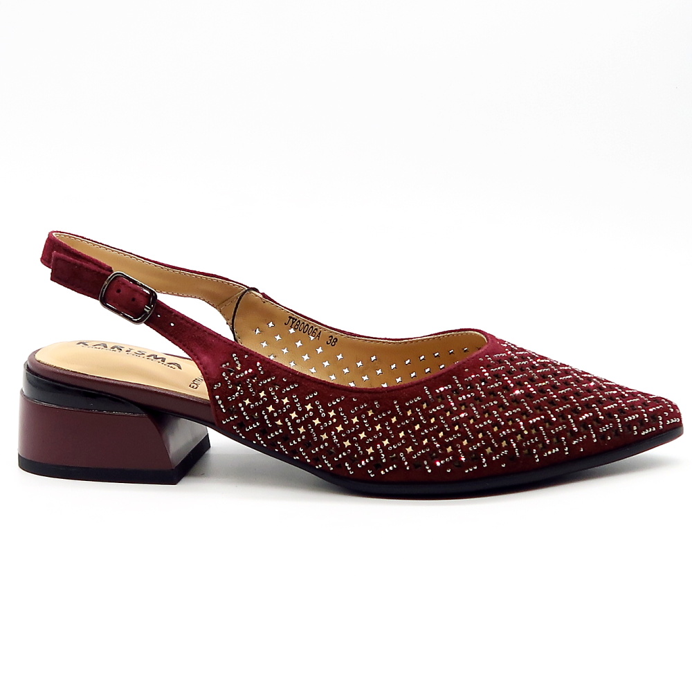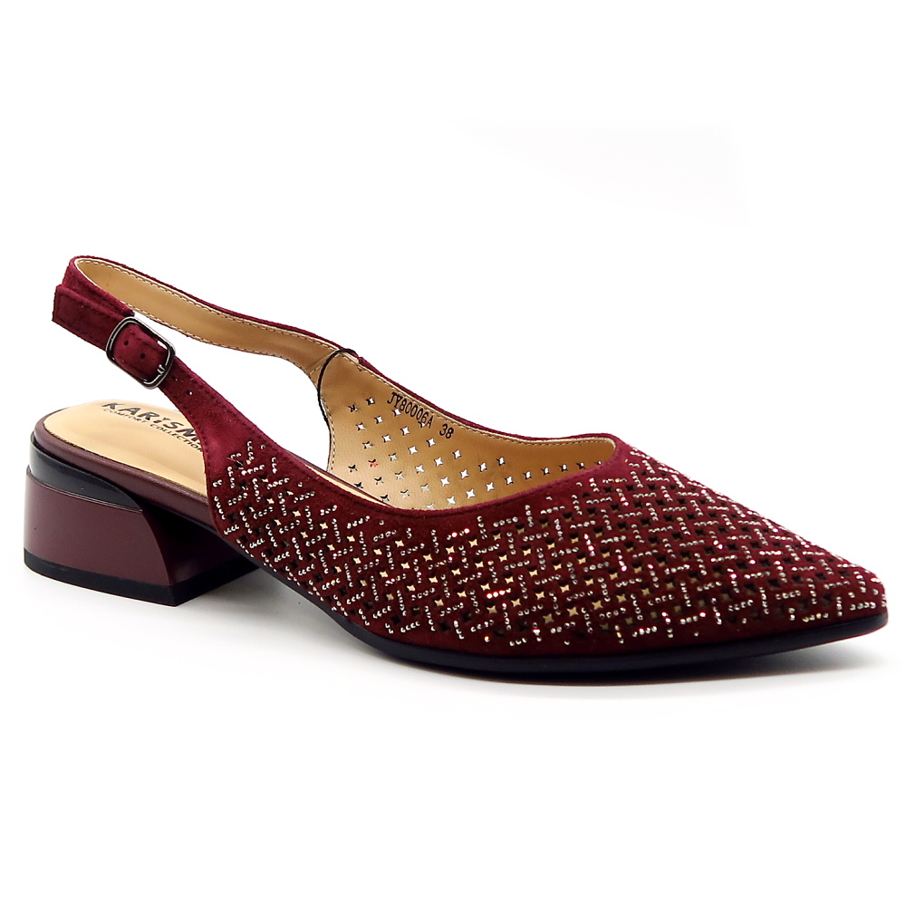 Elegantné dámske sandále značky KARISMA. Model v krásnej bordovej farbe s jemnými trblietavými kamienkami. Zvršok vyrobený z prírodnej kože. Sandále na pohodlnom nízkom podpätku s nastaviteľným ramienkom okolo päty pre lepšie prispôsobenie a stabilitu pri chôdzi. Jemný perforovaný zvršok zabezpečuje priedušnosť a komfort počas celého dňa. Mäkká vnútorná stielka poskytuje príjemný pocit pri nosení.