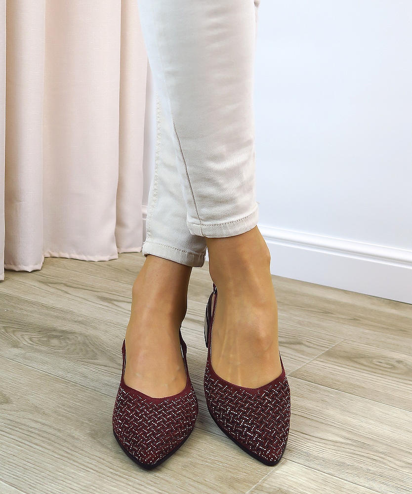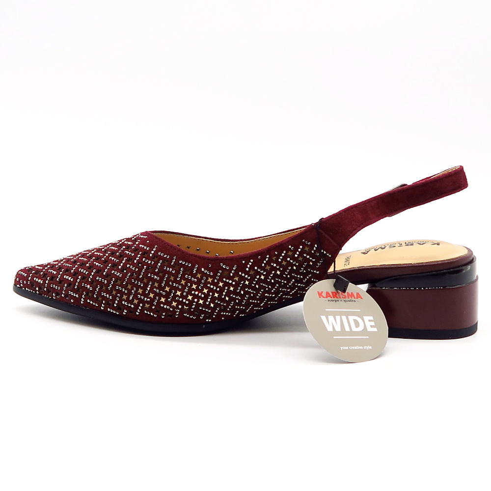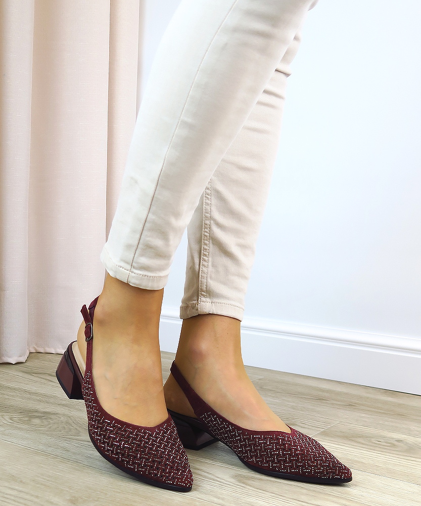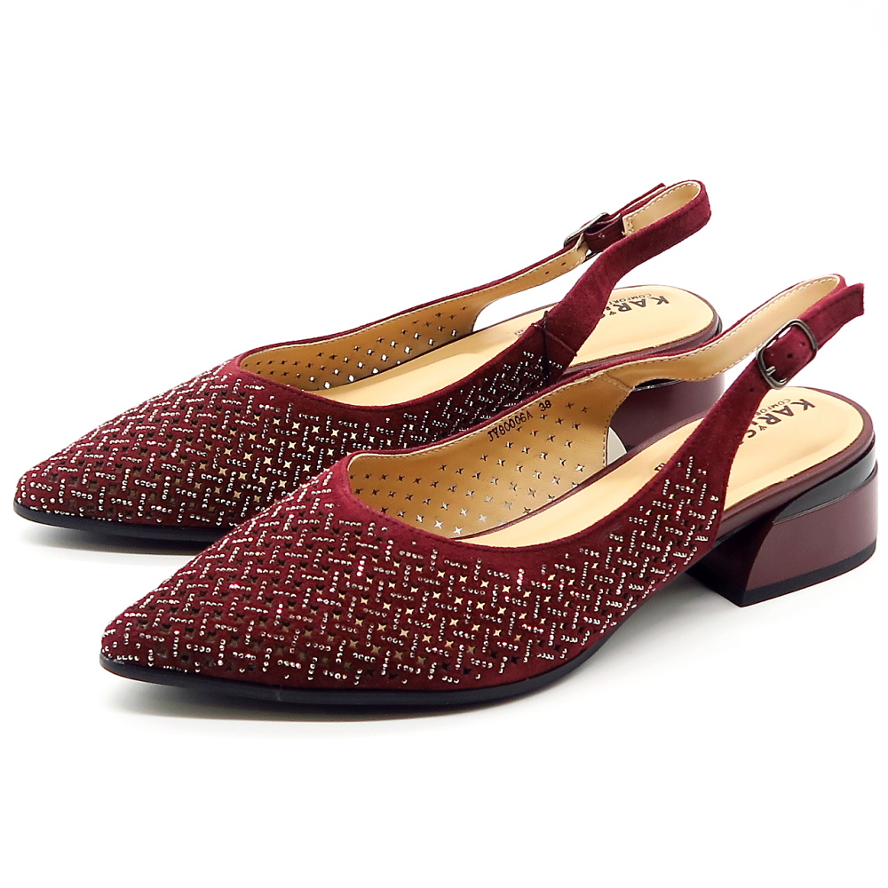 Elegantné dámske sandále značky KARISMA. Model v krásnej bordovej farbe s jemnými trblietavými kamienkami. Zvršok vyrobený z prírodnej kože. Sandále na pohodlnom nízkom podpätku s nastaviteľným ramienkom okolo päty pre lepšie prispôsobenie a stabilitu pri chôdzi. Jemný perforovaný zvršok zabezpečuje priedušnosť a komfort počas celého dňa. Mäkká vnútorná stielka poskytuje príjemný pocit pri nosení.