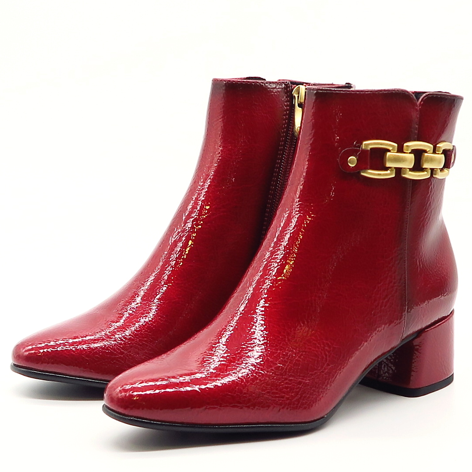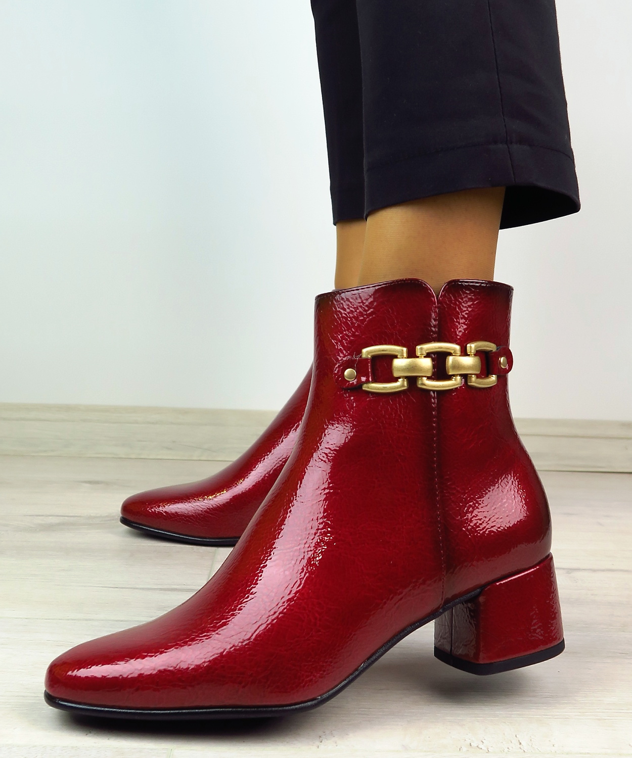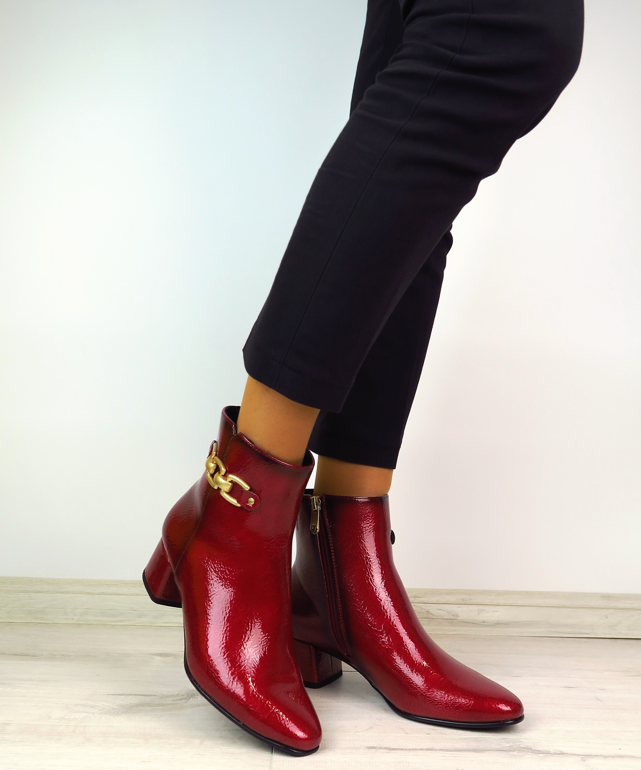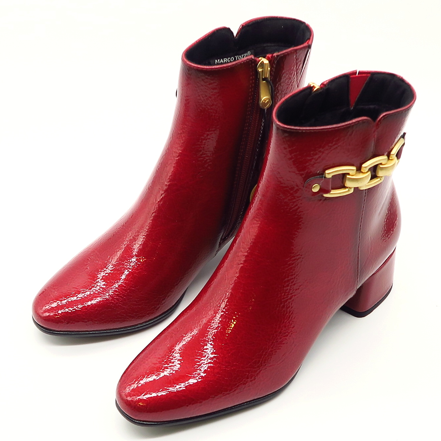 Elegantné členkové topánky MARCO TOZZI v elegantnom červenom prevedení upútajú na prvý pohľad svojím lakovaným povrchom. Výrazným detailom je zlatá ozdobná retiazka po boku, ktorá dodáva obuvi luxusný vzhľad. Stabilný širší podpätok poskytuje pohodlie pri chôdzi a zároveň pôsobí veľmi štýlovo. Ideálny model na oživenie jesenných či zimných outfitov – či už k nohaviciam, šatám alebo sukni.