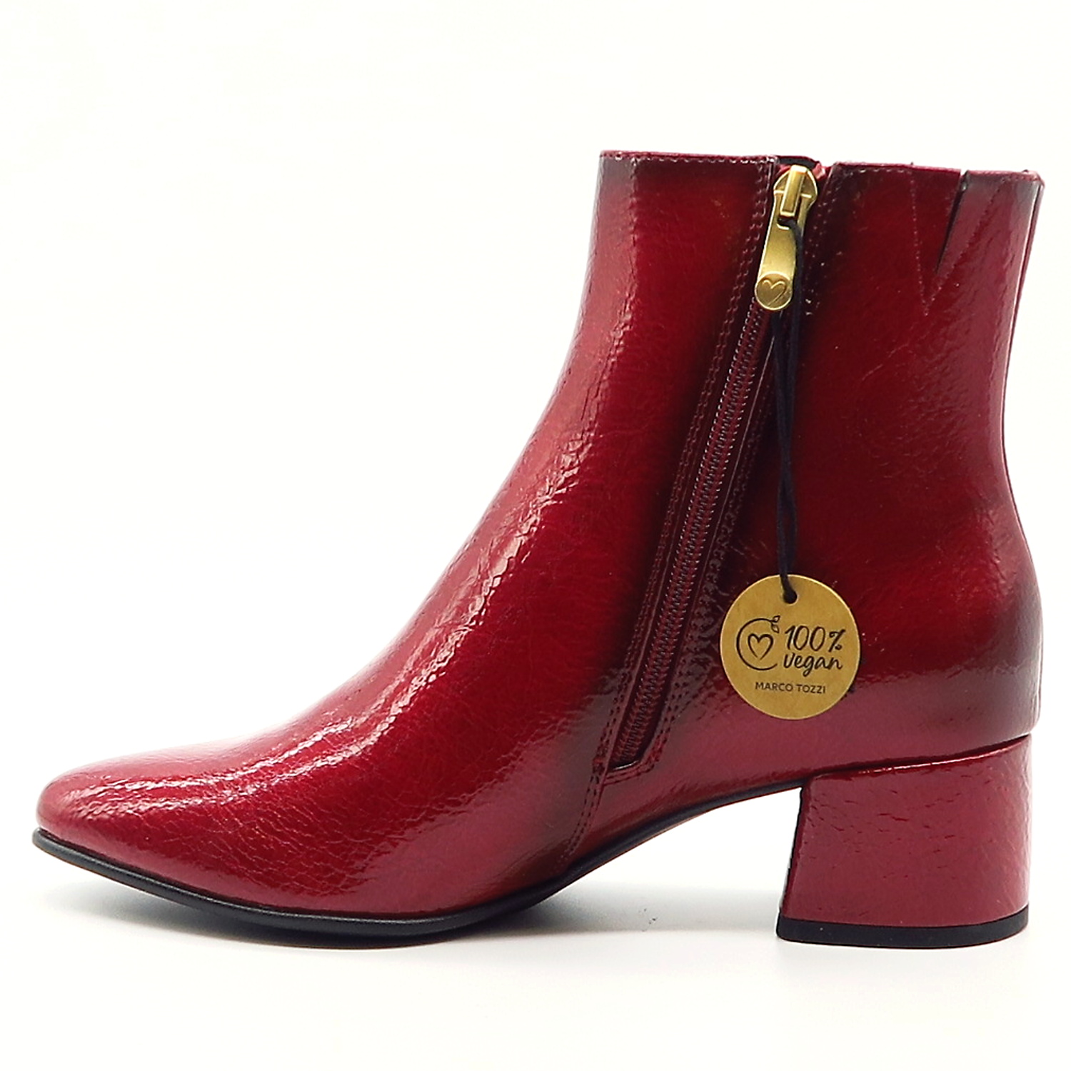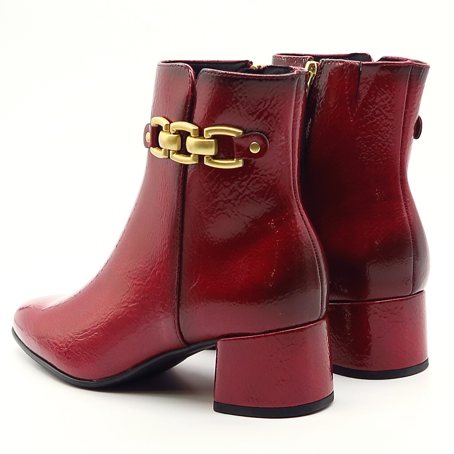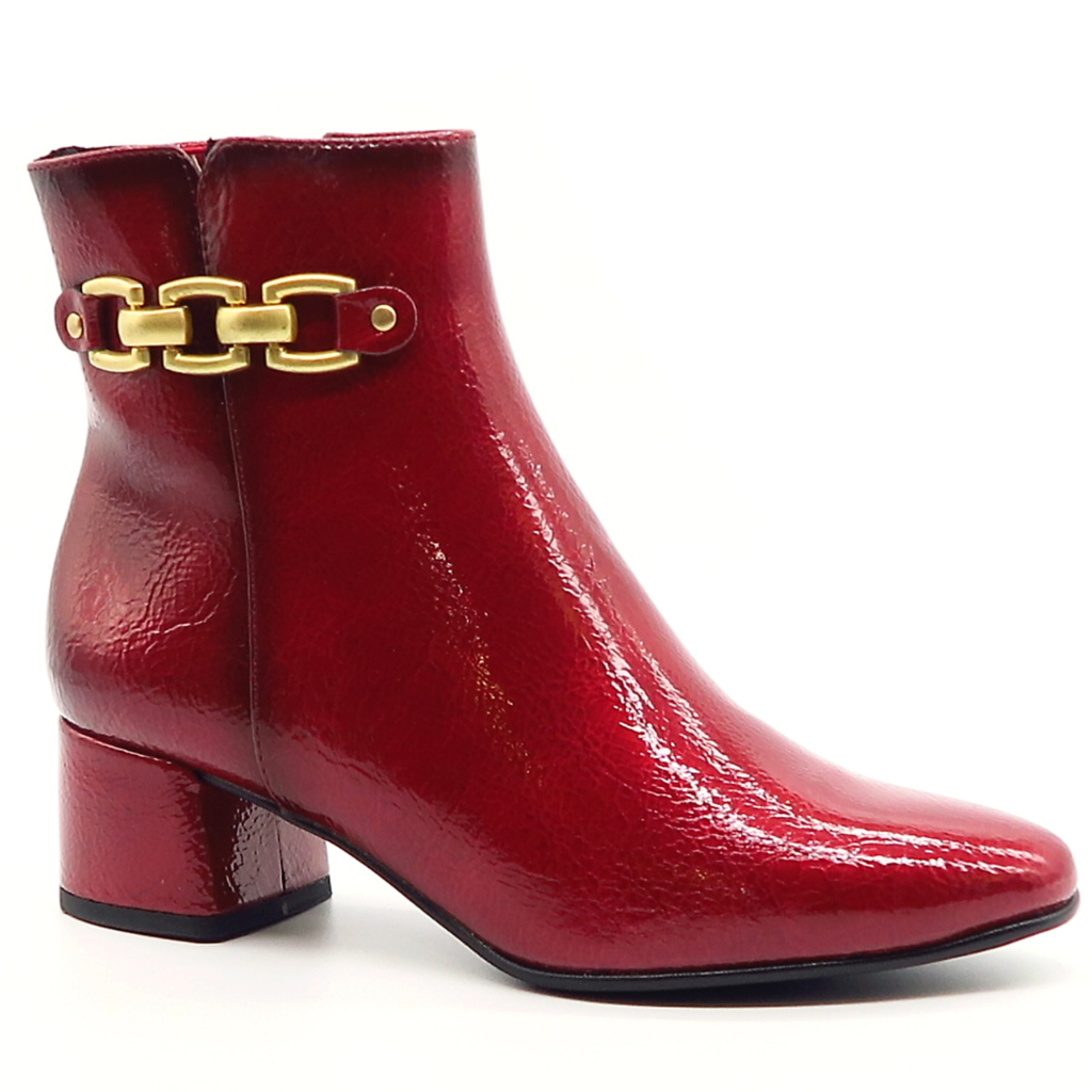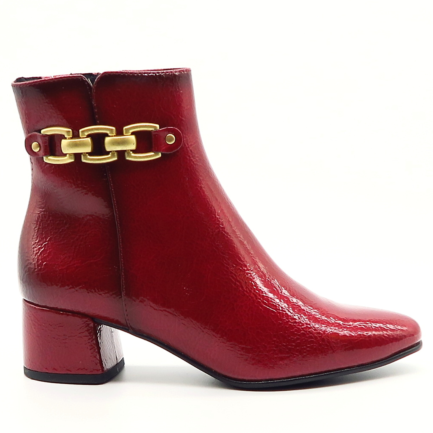 Elegantné členkové topánky MARCO TOZZI v elegantnom červenom prevedení upútajú na prvý pohľad svojím lakovaným povrchom. Výrazným detailom je zlatá ozdobná retiazka po boku, ktorá dodáva obuvi luxusný vzhľad. Stabilný širší podpätok poskytuje pohodlie pri chôdzi a zároveň pôsobí veľmi štýlovo. Ideálny model na oživenie jesenných či zimných outfitov – či už k nohaviciam, šatám alebo sukni.