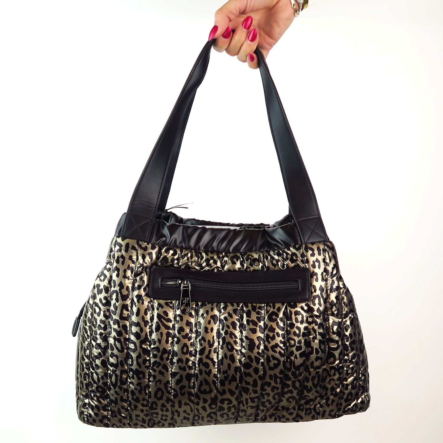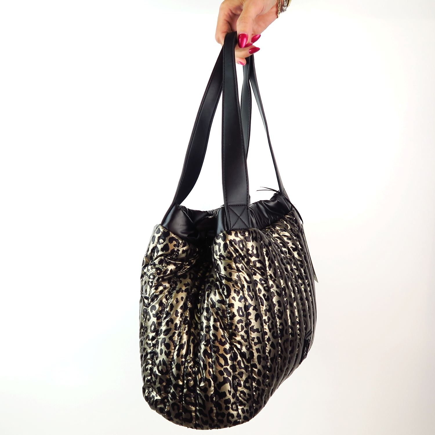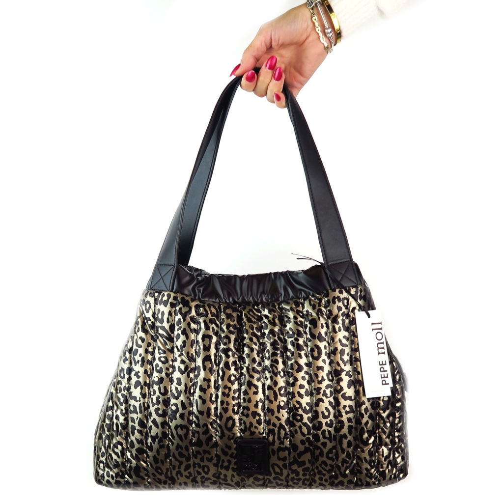 Kvalitná kabelka značky PEPE MOLL. Model v čiernej farbe s leopardím vzorom. Zvršok vyrobený z kvalitného textilného materiálu.