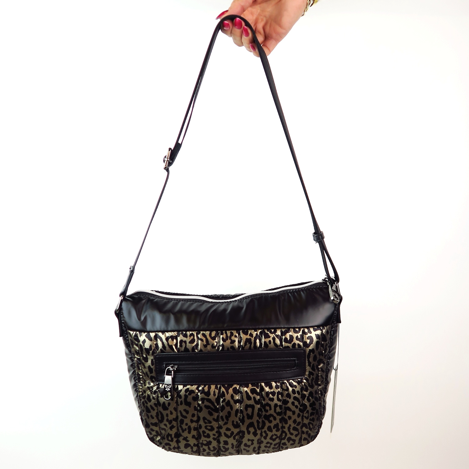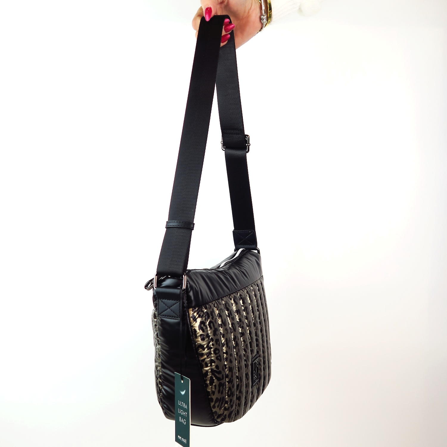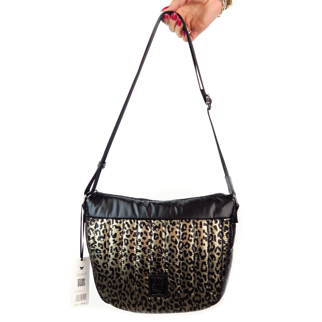 Kvalitná kabelka značky PEPE MOLL. Model v čiernej farbe s leopardím vzorom. Zvršok vyrobený z kvalitného textilného materiálu.