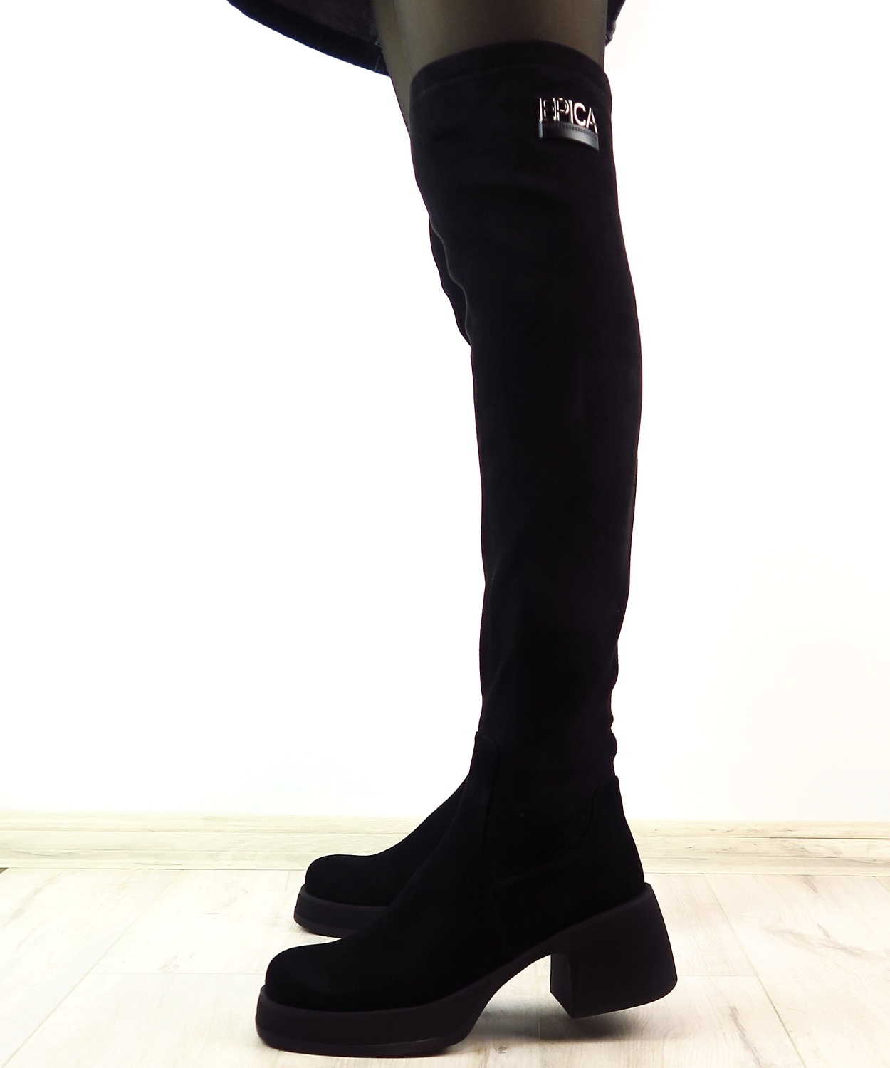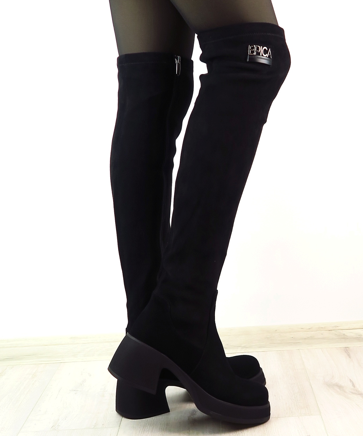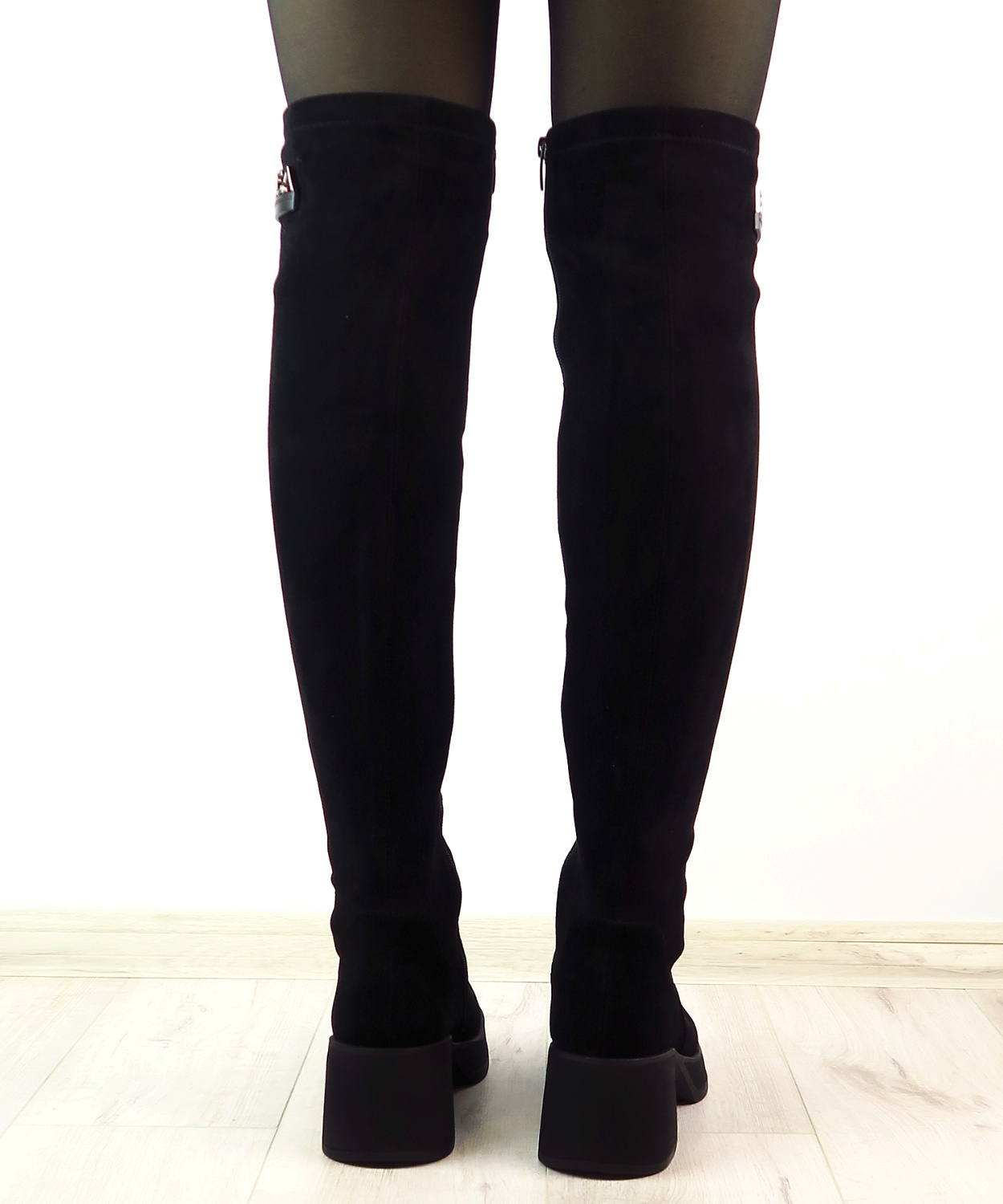 Elegantné, kožené čižmy, ktoré siahajú až nad kolená, sú stvorené pre sebavedomý a moderný look. Masívna platforma s hrubým podpätkom zaručujú pohodlné nosenie aj počas celého dňa a zároveň opticky predĺži nohy. Pekným doplnkom je strieborné logo značky na bočnej strane. Perfektné k šatám, sukniam aj úzkym nohaviciam, ideálne na jesenné a zimné obdobie. Vhodné na tenké lýtka.