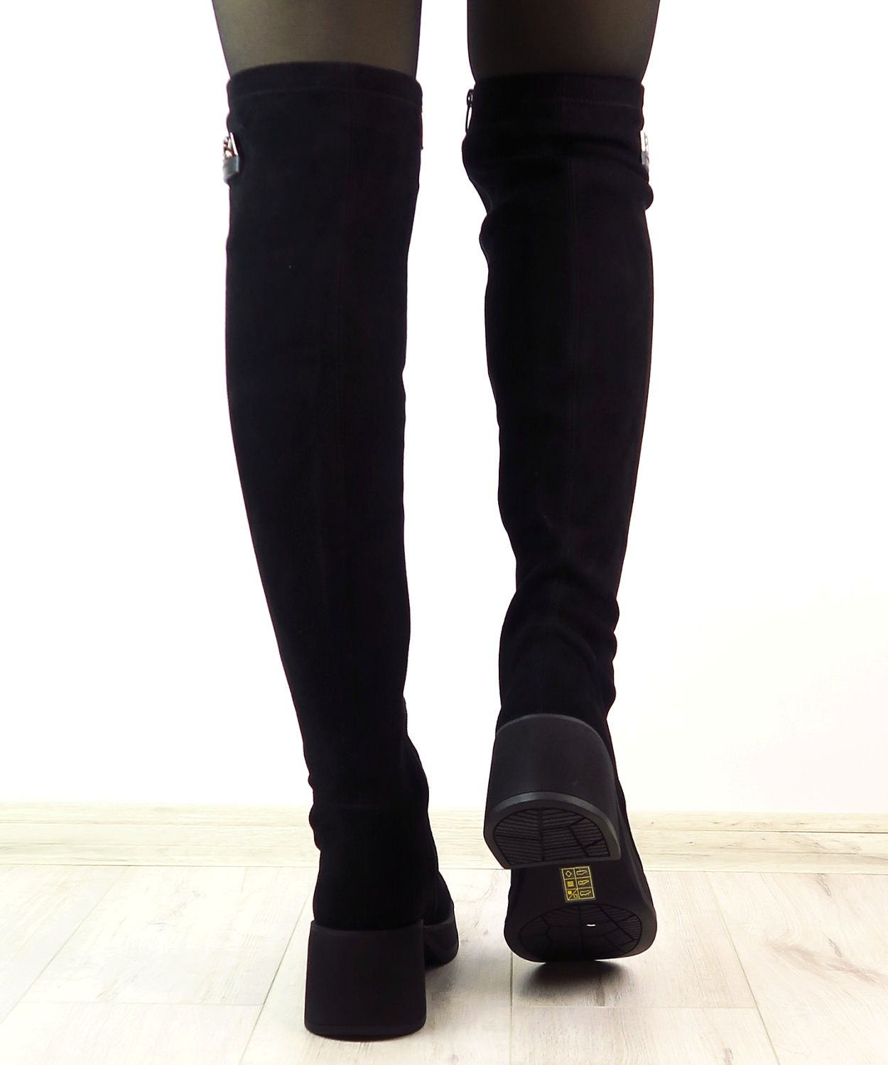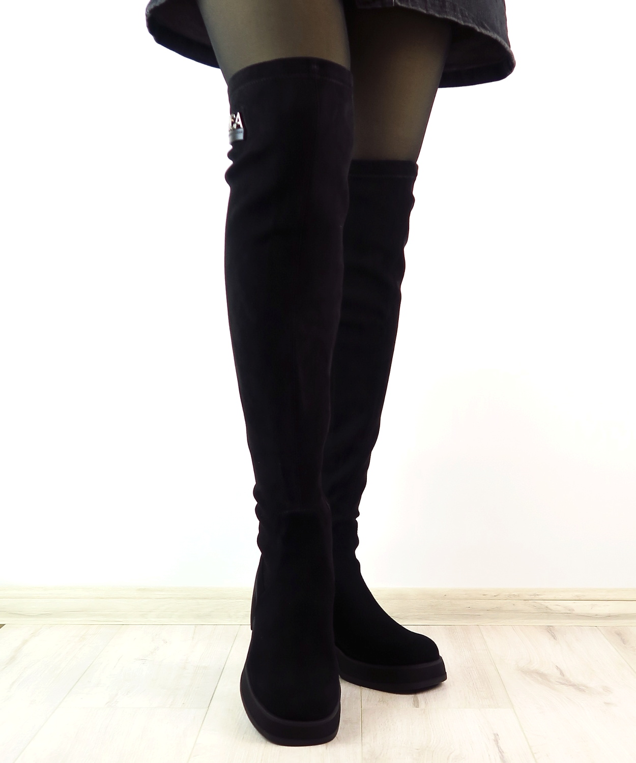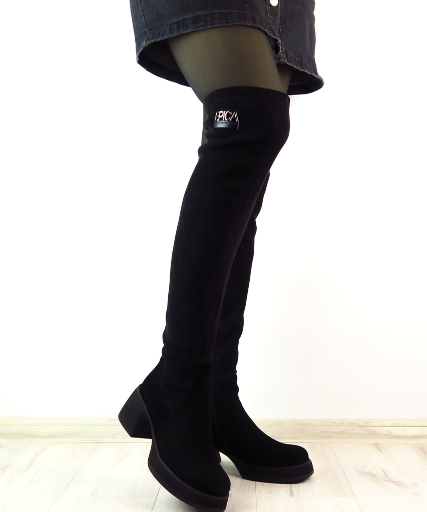 Elegantné, kožené čižmy, ktoré siahajú až nad kolená, sú stvorené pre sebavedomý a moderný look. Masívna platforma s hrubým podpätkom zaručujú pohodlné nosenie aj počas celého dňa a zároveň opticky predĺži nohy. Pekným doplnkom je strieborné logo značky na bočnej strane. Perfektné k šatám, sukniam aj úzkym nohaviciam, ideálne na jesenné a zimné obdobie. Vhodné na tenké lýtka.