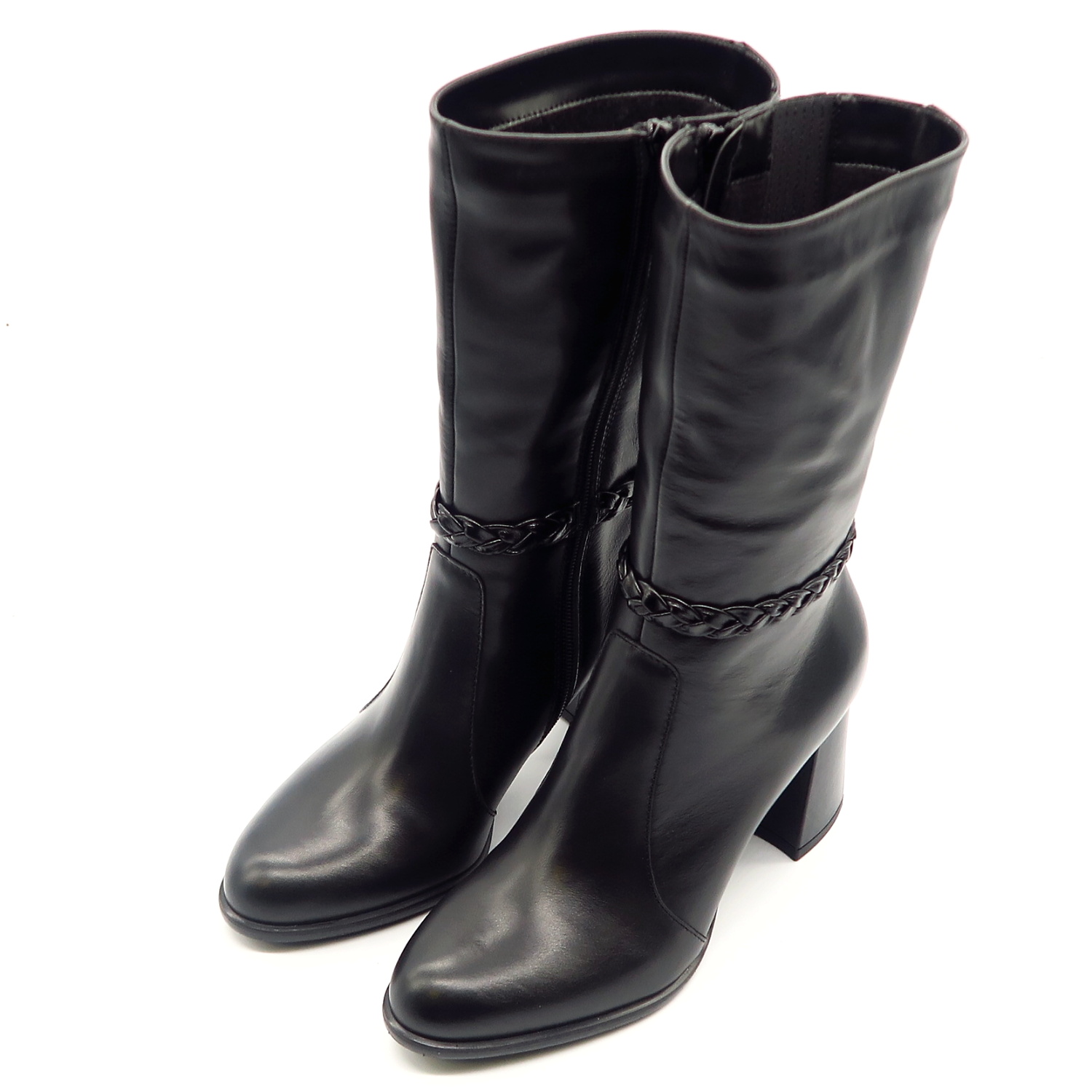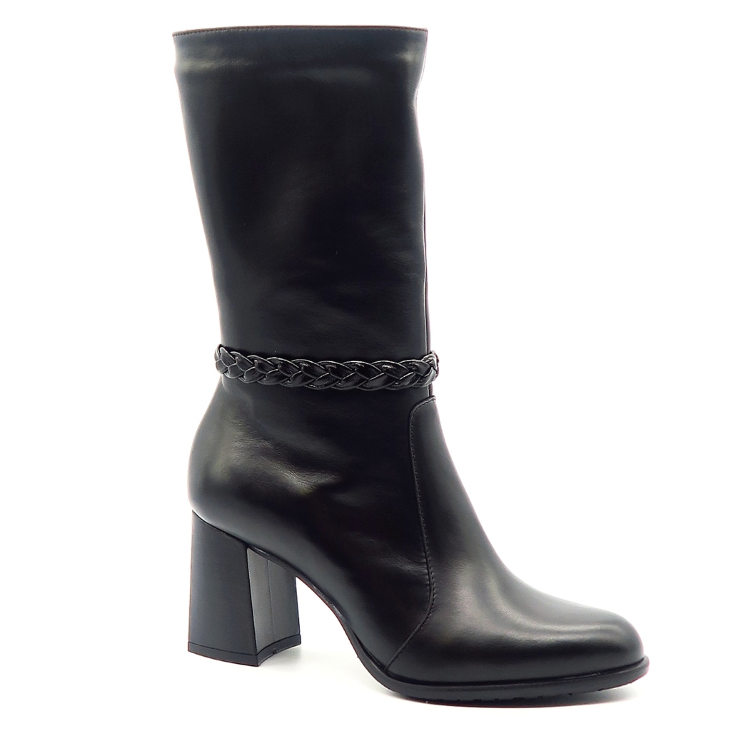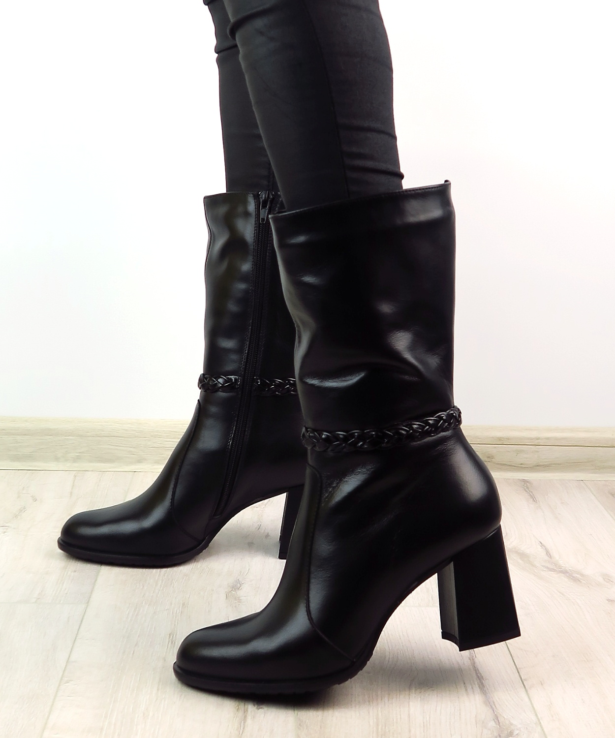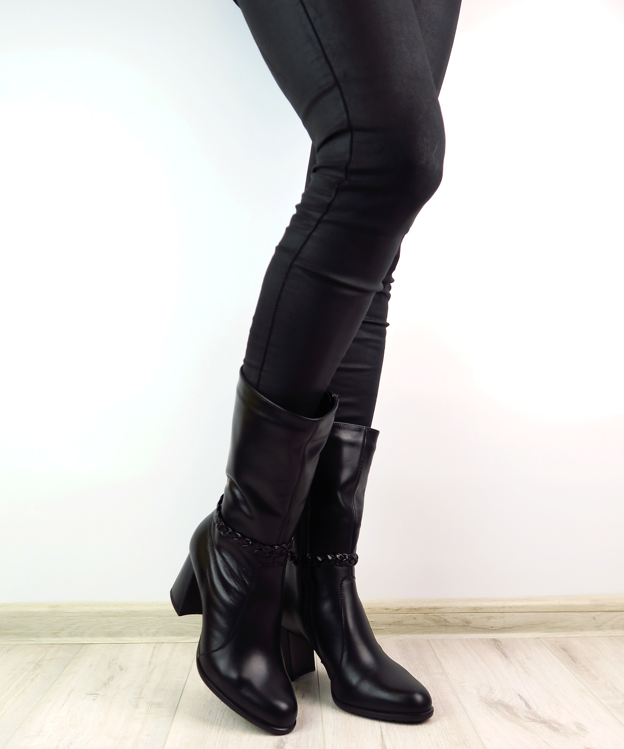 Štýlové dámske čižmy značky SALA. Model v čiernej farbe. Kožené čižmy, ktoré spájajú eleganciu s pohodlím. Ozdobný ramienok okolo členku dodáva topánkam luxusný vzhľad. Hrubší stabilný podpätok zabezpečuje maximálne pohodli pri chôdzi, vďaka čomu sú ideálne na každodenné nosenie. Tieto čižmy sú perfektnou voľbou pre ženy, ktoré hľadajú kombináciu kvality, štýlu a komfortu. Ich výhodou je nízka sára vďaka ktorej super sadnú aj na hrubšie lýtka.
