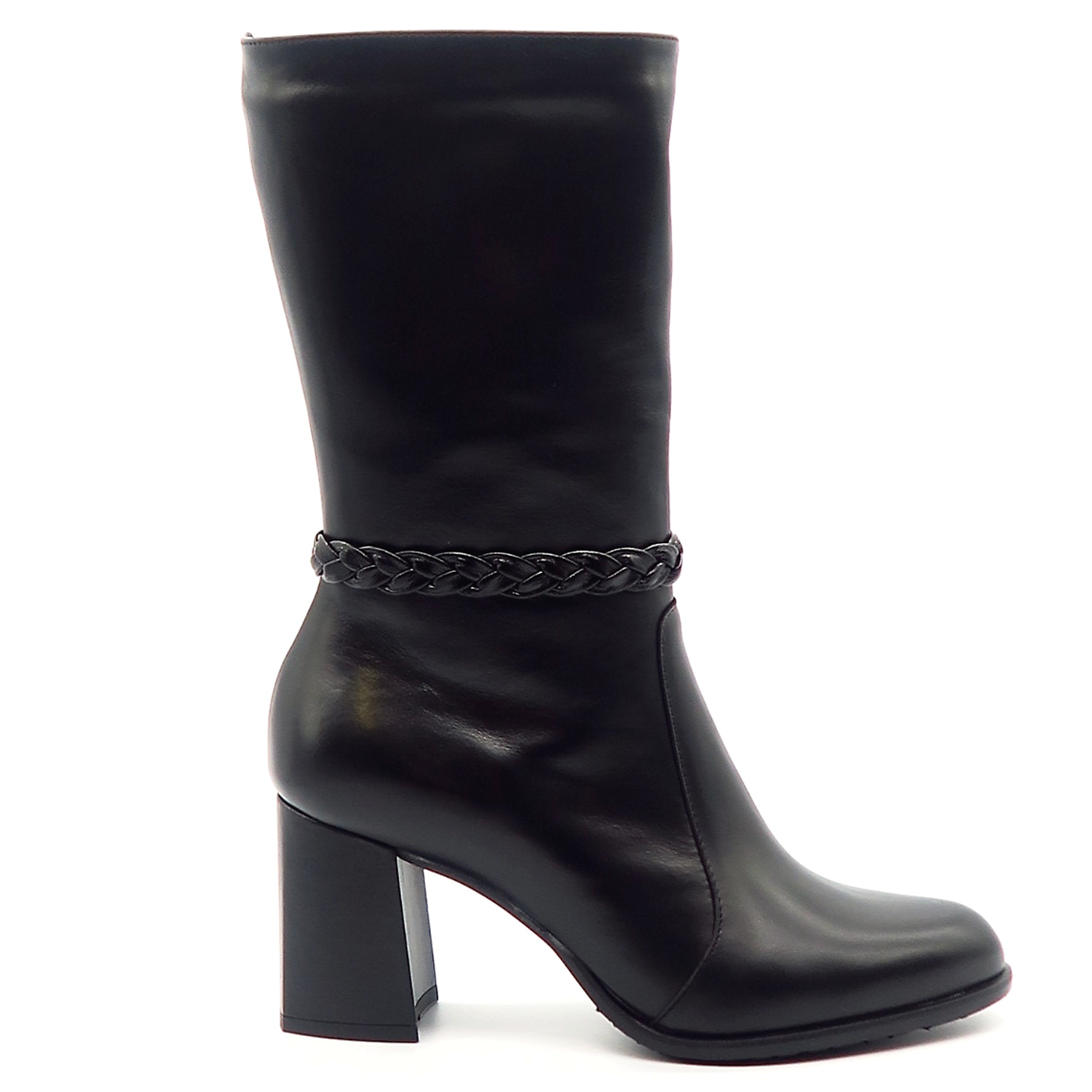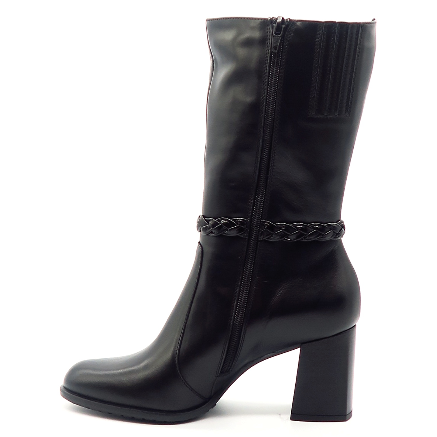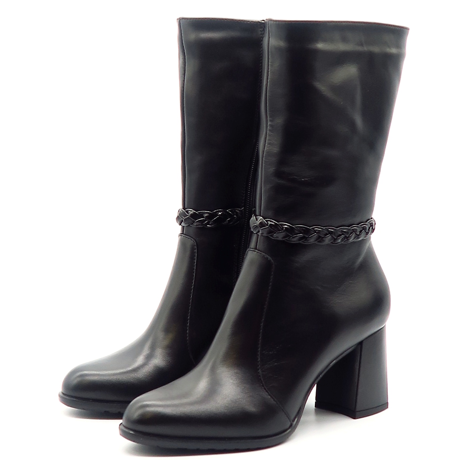 Štýlové dámske čižmy značky SALA. Model v čiernej farbe. Kožené čižmy, ktoré spájajú eleganciu s pohodlím. Ozdobný ramienok okolo členku dodáva topánkam luxusný vzhľad. Hrubší stabilný podpätok zabezpečuje maximálne pohodli pri chôdzi, vďaka čomu sú ideálne na každodenné nosenie. Tieto čižmy sú perfektnou voľbou pre ženy, ktoré hľadajú kombináciu kvality, štýlu a komfortu. Ich výhodou je nízka sára vďaka ktorej super sadnú aj na hrubšie lýtka.