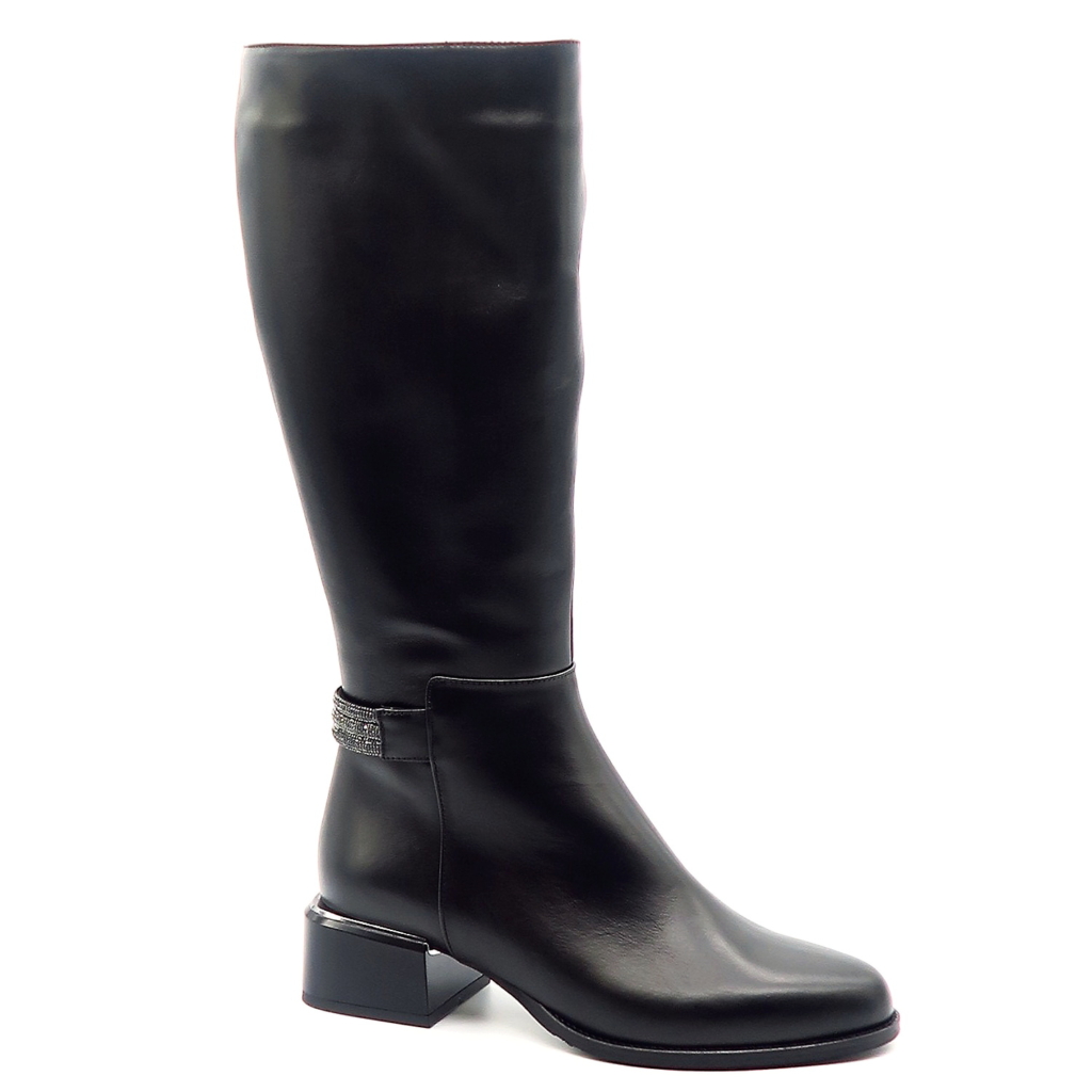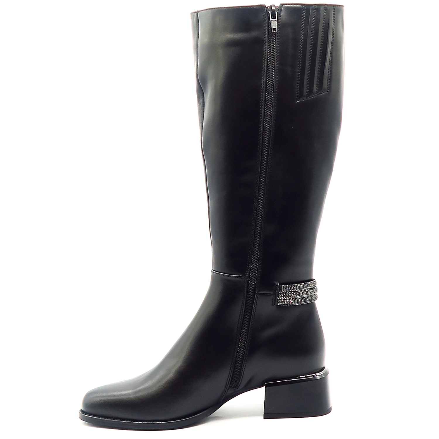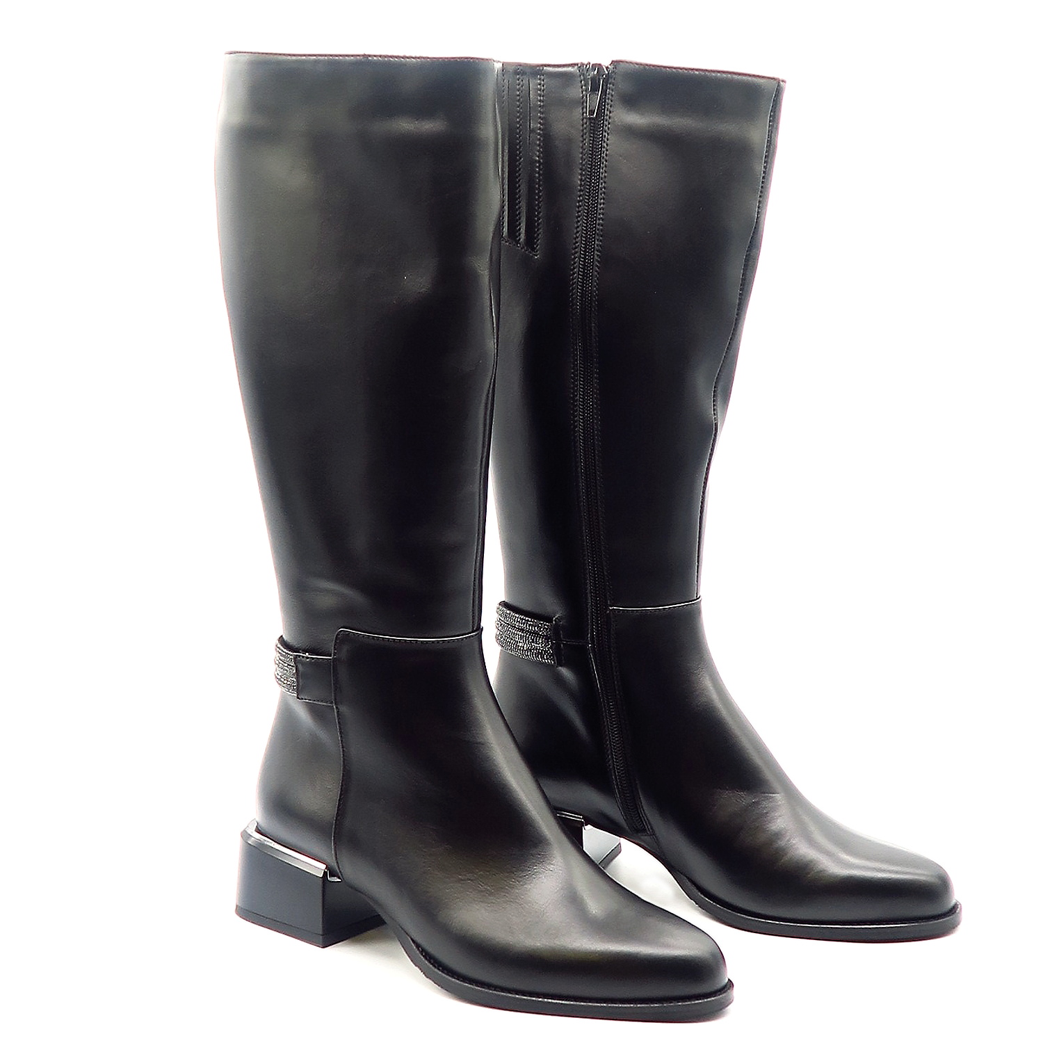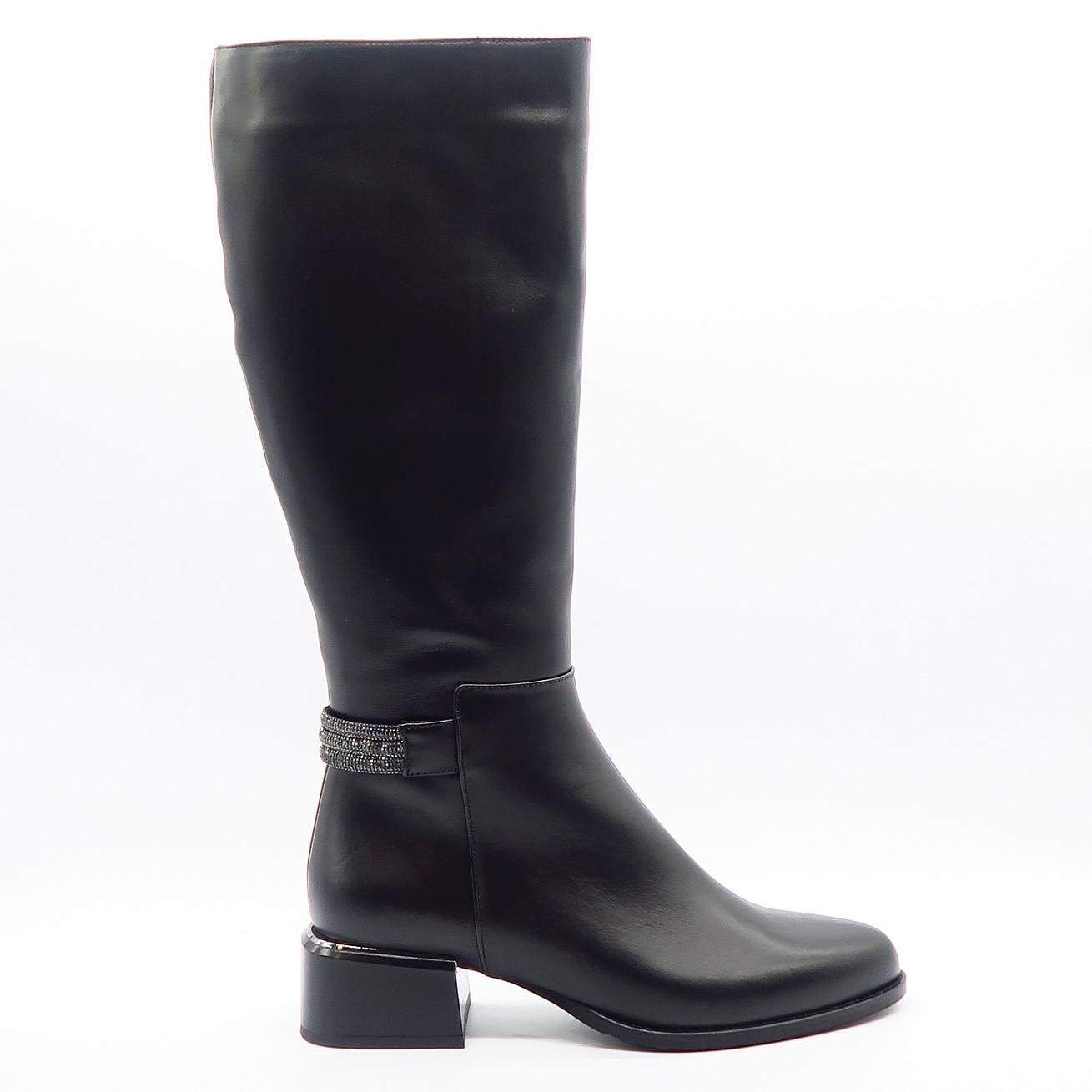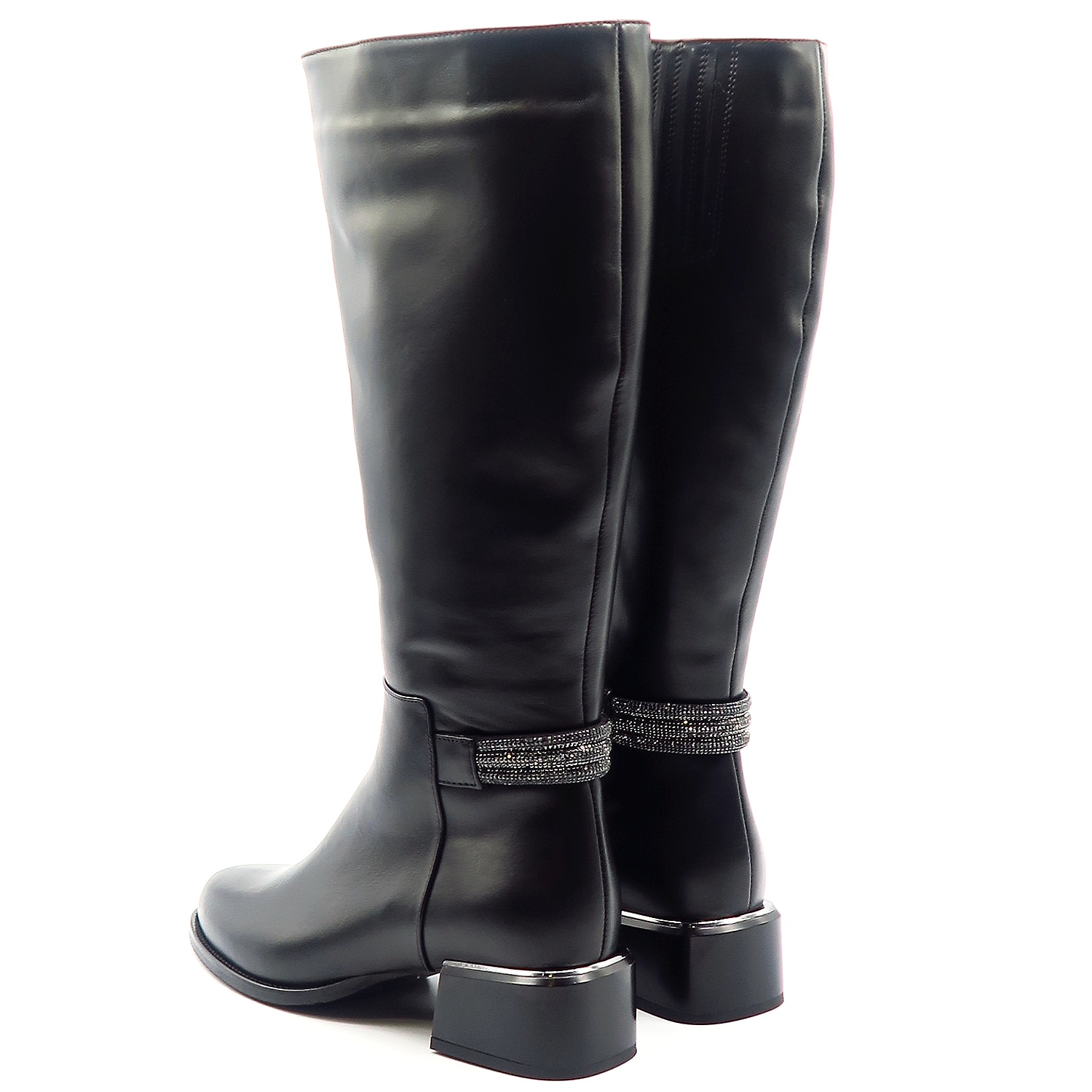 Elegantné dámske čižmy značky SALA . Čierny kožený zvršok vyniká svojím čistým a pekne tvarovaným strihom, ktorý krásne predĺži nohy. Nízky stabilný podpätok poskytuje pohodlie pri chôdzi. Na päte sa nachádza decentná štrasová aplikácia, ktorá celý dizajn zvýrazni a dodá mu luxusný detail. Tieto čižmy sú ideálnou voľbou na každodenné nosenie aj do spoločnosti – dokonale doplnia sukne, šaty aj úzke nohavice. Vhodné na úzke lýtka.