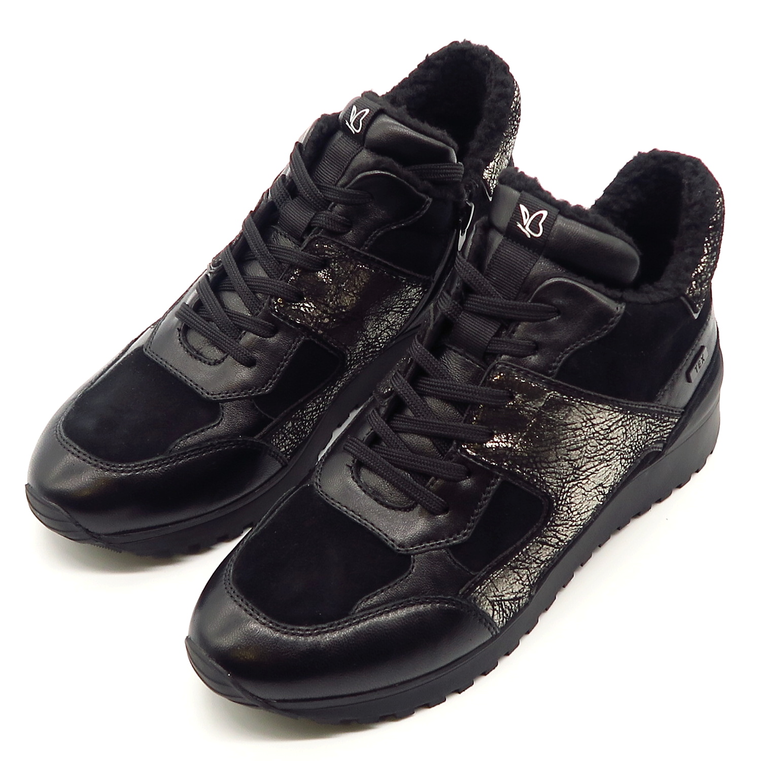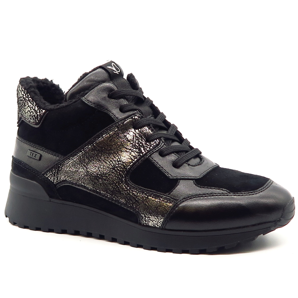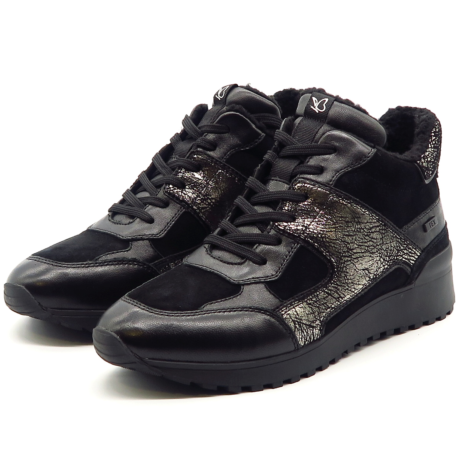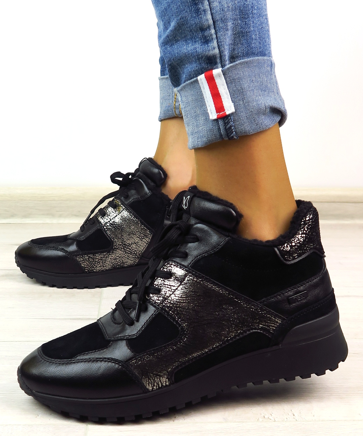Štýlové členkové tenisky CAPRICE v čiernej farbe sú ideálnou kombináciou pohodlia a moderného vzhľadu. Zvršok je vyrobený z prírodnej kože a semišu, doplnený o jemný metalický efekt, ktorý dodáva obuvi jedinečný nádych elegancie. Vnútorná hrejivá podšívka udrží nohy v teple, zatiaľ čo ľahká a flexibilná podrážka poskytuje maximálny komfort. Tieto topánky sú vybavené technológiou CAPRICE OnAir Insole, ktorá sa postará o priedušnosť a pohodlie počas celého dňa.