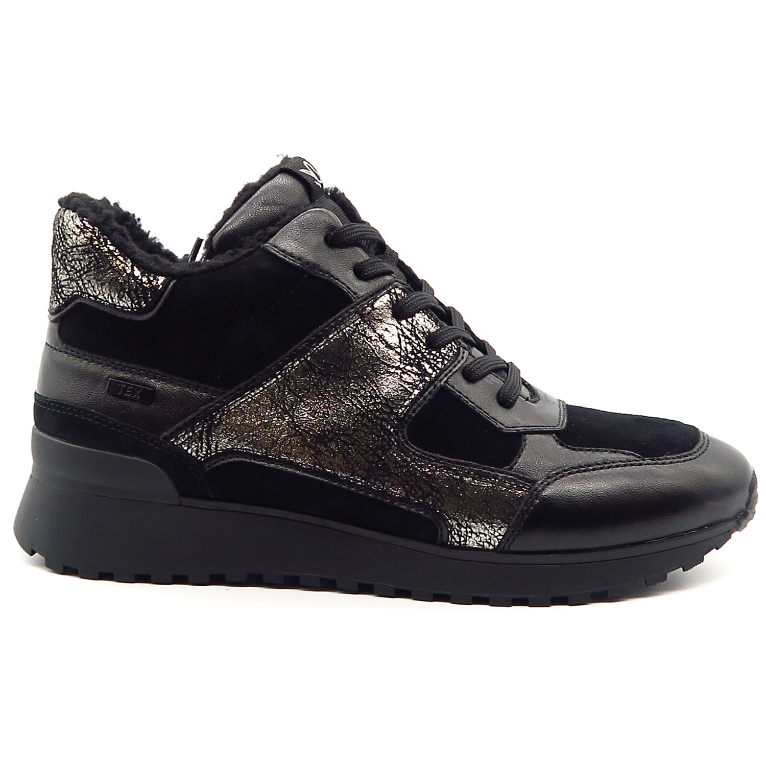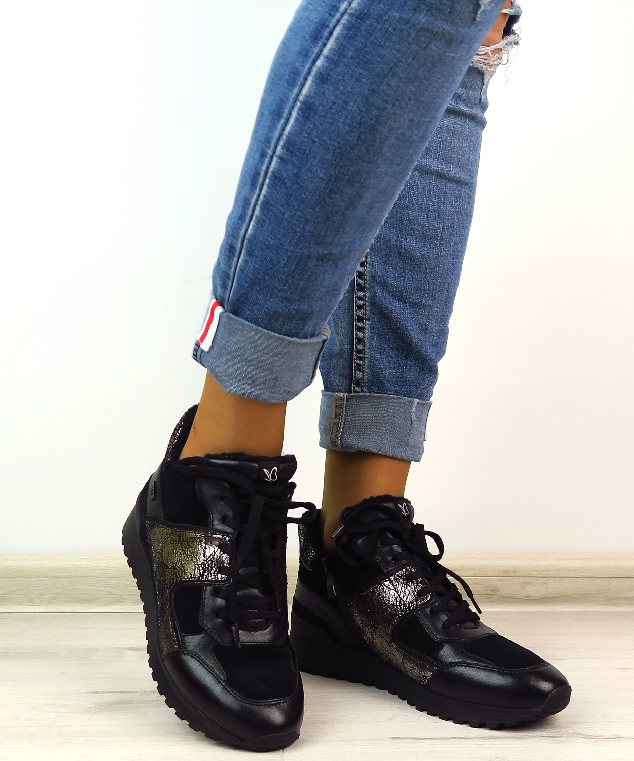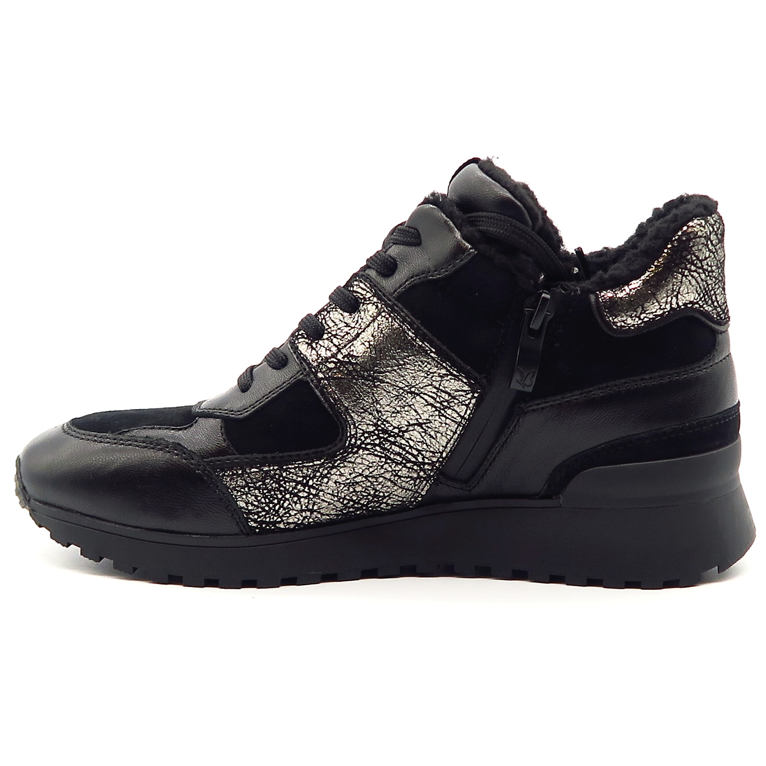 Štýlové členkové tenisky CAPRICE v čiernej farbe sú ideálnou kombináciou pohodlia a moderného vzhľadu. Zvršok je vyrobený z prírodnej kože a semišu, doplnený o jemný metalický efekt, ktorý dodáva obuvi jedinečný nádych elegancie. Vnútorná hrejivá podšívka udrží nohy v teple, zatiaľ čo ľahká a flexibilná podrážka poskytuje maximálny komfort. Tieto topánky sú vybavené technológiou CAPRICE OnAir Insole, ktorá sa postará o priedušnosť a pohodlie počas celého dňa.